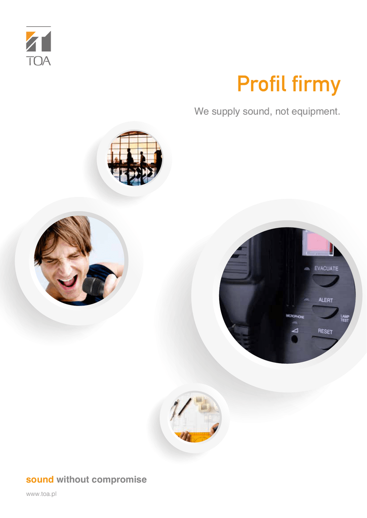 Profil firmy We supply sound, not equipment. sound without compromise www.toa.pl We supply sound, not equipment. NOWOCZE To nasza filozofia. Trzy filary zaufania Już od starań ponad by 80 lat oferowane TOA dokłada rozwiązania wszelkich odpowiadały wszystkim, nawet najbardziej złożonym potrzebom społeczeństwa. Szeroki know-how japońskich Pełne zaufanie do klientów korzystających z naszych produktów inżynierów, a także wnikliwa obserwacja zmian i trendów przy jednoczesnym zastosowaniu zaawansowanych technologii wspartych latami doświadczeń, pozwala na tworzenie niezwykle profesjonalnych i niezawodnych urządzeń. Systemy marki TOA stosowane są w tysiącach Pełne zaufanie do partnerów biznesowych podczas zawierania transakcji handlowych różnych miejsc na całym świecie, od szkół rozpoczynając, poprzez szpitale, centra handlowe, biurowce, lotniska, obiekty sportowe, czy na salach koncer- towych kończąc. Jednakże, niezależnie od miejsca swojego zastosowania, służą one nie tylko zapewnieniu jak najwyższego poziomu bezpieczeństwa i nadzoru, ale również doskonałemu przekazowi informacji i muzyki. Pełne zaufanie do pracowników dotyczące celowości ich wysiłków SNOŚĆ & POSTĘP Siła TOA nie polega tylko i wyłącznie na jakości TOA Corporation z siedzibą w Kobe, posiada 19 tworzenia efektywnych i kompletnych rozwiązań w oparciu 5 następujących regionów: poszczególnych produktów, lecz na możliwości o ich kombinacje. Szeroka gama zastosowanie we oddziałów na całym świecie, podzielonych na Japonia urządzeń elektroakustycznych, TOA wszelkiego znajduje rodzaju nagłośnieniowych swoje aplikacjach i bezpie- czeństwa, tworząc dynamczne, wyraźne i przyjemne dla ucha przestrzenie dźwięku. Azja Wschodnia Azja Południowo-Wschodnia wraz z Oceanią Europa i Afryka Ameryka Północna i Południowa TOA Electronics Europe GmbH Oddział w Polsce (TOA Polska) z siedzibą główną w Warszawie, działa od 2007 roku i posiada dwa biura regionalne w Gdańsku oraz Wrocławiu. D Y N A M I K A Najwyższa jakość w każdym produkcie. Każdego dnia inżynierowie TOA dokładają wszelkich starań, by ich zdobyta i potwierdzona latami doświadczeń wiedza, jak najlepiej przekładała się na jej umiejętne wykorzystanie w każdym aspekcie planowania produkcji, począwszy od planowania poprzez rozwój, aż po sprzedaż i zarządzanie. Niezawodność, skuteczność, a przede wszystkim wysoka jakość urządzeń TOA, zostały nagrodzone zaufaniem klientów na całym świecie. T R O S K A O Ś R O D O W I S K O N AT U R A L N E TOA aktywnie wspiera działania mające na celu ochronę środowiska. Firma bada wszelkie dostępne metody umożliwiające ograniczenie do minimum wpływu wytwarzanych produktów na środowisko naturalne we wszystkich etapach - projektowania, opracowywania technologii i produktu, procesów produkcyjnych, dystrybucji, użytkowania i utylizacji. Ponadto, stawiając sobie coraz to nowe cele, TOA nie przestaje działać w staraniach związanych z ochroną środowiska. Z A A N G A Ż OWA N I E I R O Z W Ó J Za pośrednictwem świata dźwięku i wideo, TOA wspiera wiele różnych wydarzeń kulturalnych i artystycznych, w których biorą udział osoby w każdym wieku. KONTROLA JAKOŚCI Wszystkie urządzenia marki TOA powstają w fabrykach na terenie Japonii oraz Tajwanu, które w całości należą do korporacji TOA. Dlatego też, nad prawidłowością przebiegu wszystkich procesów produkcyjnych, od początku do końca czuwają wykwalifikowani technicy i specjaliści TOA, którzy wykorzystując najnowsze dostępne technologie i posiadaną wiedzę, dokładają wszelkich starań by dostarczać jedynie najwyższej jakości urządzeń. & E L A S T Y C Z N O Ś Ć Działalność TOA skupia się głównie na trzech obszarach: Łącząc kompetencje z wszystkich trzech obszarów NAGŁOŚNIENIE ORAZ INFORMACJA I KOMUNIKACJA. jakości, niezawodne i skuteczne rozwiązania. OCHRONA I BEZPIECZEŃSTWO, PROFESJONALNE Dzięki zastosowaniu wspartych efektywnego adaptacji, latami TOA zaawansowanych technologii doświadczeń, planowania umiejętnie zdolności oraz szybkiej wychodzi naprzeciw nawet najbardziej wymagającym potrzebom ludzi i współczesnego, szybko zmieniającego się świata. OCHRONA & BEZPIECZEŃSTWO …to zgodne z normą EN-54, posiadające certyfikat zgodności oraz świadectwo dopuszczenia dźwiękowe systemy ostrzegawcze typu VM-3000, VX-2000 oraz SX-2000, a także certyfikowane głośniki pożarowe. Dodatkowo, w tym zakresie oferuje system interkomowy N-8000. PROFESJONALNE NAGŁOŚNIENIE …doskonała jakość dźwięku niezaleźnie od miejsca ich wykorzystania. Oferta obejmuje wzmacniacze w klasie D, matryce i miksery audio, procesory dźwięku, głośniki liniowe, kompaktowe i wiele innych. INFORMACJA & KOMUNIKACJA …zawiera szeroką gamę produktów, a wśród nich m. in. systemy mikrofonów przewodowych i bezprzewodowych, wzmacniacze mocy, systemy konferencyjne, głośniki oraz megafony. swojej działalności, japoński producent tworzy najwyższej Jednakże, przede TOA wszystkim to nie tylko rozwiązania! produkty, Obok lecz standar- dowych usług oraz szerokiego wsparcia technicz- nego firma oferuje szyte na miarę, efektywne i kompleksowe rozwiązania, które wykwalifikowany zespół TOA z zaangażowaniem opracowywuje i wdraża według indywidualnych życzeń i wymagań każdego klienta. O C H R O N A & DŹWIĘKOWE SYSTEMY OSTRZEGAWCZE Systemy zabezpieczeń pożarowych to urządzenia, które W ofercie TOA znajdują się trzy rozmaitym charakterze i różnorodnym przeznaczeniu. a także bogata gama certyfikowanych głośników sufi- instalowane są w wielu obiektach, o różnej kubaturze, Stosowanie dźwiękowych systemów ostrzegawczych ostrzegawcze: VX-2000, dźwiękowe systemy SX-2000 oraz VM-3000, towych, projektorowych, dwukierunkowych i tubowych. jest regulowane przez odpowiednie przepisy prawne, Każdego dnia inżynierowie