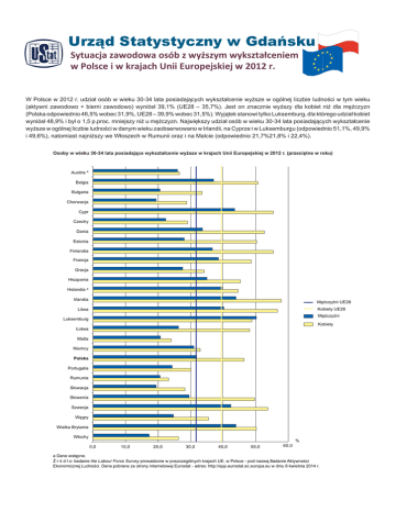 ◆ Sytuacja zawodowa osób z wyższym wykształceniem w Polsce i w krajach Unii Europejskiej w 2012 r. ◆ 1 UrzĈd Statystyczny w Gdaęsku ^LJƚƵĂĐũĂnjĂǁŽĚŽǁĂŽƐſďnjǁLJǏƐnjLJŵǁLJŬƐnjƚĂųĐĞŶŝĞŵ ǁWŽůƐĐĞŝǁŬƌĂũĂĐŚhŶŝŝƵƌŽƉĞũƐŬŝĞũǁϮϬϭϮƌ͘ W Polsce w 2012 r. udział osób w wieku 30-34 lata posiadających wykształcenie wyższe w ogólnej liczbie ludności w tym wieku (aktywni zawodowo + bierni zawodowo) wyniósł 39,1% (UE28 – 35,7%). Jest on znacznie wyższy dla kobiet niż dla mężczyzn (Polska odpowiednio 46,5% wobec 31,9%, UE28 – 39,9% wobec 31,5%). Wyjątek stanowi tylko Luksemburg, dla którego udział kobiet wyniósł 48,9% i był o 1,5 p.proc. mniejszy niż u mężczyzn. Największy udział osób w wieku 30-34 lata posiadających wykształcenie wyższe w ogólnej liczbie ludności w danym wieku zaobserwowano w Irlandii, na Cyprze i w Luksemburgu (odpowiednio 51,1%, 49,9% i 49,6%), natomiast najniższy we Włoszech w Rumunii oraz i na Malcie (odpowiednio 21,7%21,8% i 22,4%). 2VRE\ZZLHNXODWDSRVLDGDMąFHZ\NV]WDáFHQLHZ\ĪV]HZNUDMDFK8QLL(XURSHMVNLHMZUSU]HFLĊWQHZURNX Austria a Belgia %XáJDULD Chorwacja Cypr Czechy Dania Estonia Finlandia Francja Grecja Hiszpania Holandia a Irlandia 0ĊĪF]\ĨQL8( .RELHW\8( Litwa 0ĊĪF]\ĨQL Luksemburg Kobiety àRWZD Malta Niemcy Polska Portugalia Rumunia 6áRZDFMD 6áRZHQLD Szwecja :ĊJU\ Wielka Brytania :áRFK\ % 0,0 10,0 20,0 30,0 40,0 50,0 60,0 D'DQHZVWĊSQH ħUyGáREDGDQLHthe Labour Force SurveySURZDG]RQHZSRV]F]HJyOQ\FKNUDMDFK8(Z3ROVFHSRGQD]Zą%DGDQLH$NW\ZQRĞFL (NRQRPLF]QHM/XGQRĞFL'DQHSREUDQH]HVWURQ\LQWHUQHWRZHM(XURVWDWDGUHVKWWSHSSHXURVWDWHFHXURSDHXZGQLXNZLHWQLDU ◆ Sytuacja zawodowa osób z wyższym wykształceniem w Polsce i w krajach Unii Europejskiej w 2012 r. ◆ 2 W 2011 r. na tle krajów Unii Europejskiej Polska wyróżniała się stosunkowo dużym udziałem osób kończących studia wyższe na kierunkach związanych z szeroko pojętym kształceniem (15,4% ogólnej liczby absolwentów, przy średniej 9,9% w krajach Unii Europejskiej). Zarówno w Polsce, jak i w innych krajach europejskich dominującą grupę stanowili absolwenci nauk społecznych, gospodarki i prawa (41,0% wszystkich osób kończących studia wyższe w Polsce, a 37,0% w krajach Unii Europejskiej). W Polsce stosunkowo mniej osób kończyło kierunki studiów w dziedzinach szczególnie istotnych dla rozwoju konkurencyjnej i innowacyjnej gospodarki. W 2011 r. absolwenci kierunków studiów związanych z techniką, przemysłem, budownictwem stanowili 10,2% wszystkich absolwentów studiów wyższych w Polsce (12,8% w krajach Unii Europejskiej), natomiast absolwenci kierunków związanych z nauką 6,5% (w porównaniu z 9,5% w całej Unii Europejskiej). 6WUXNWXUDDEVROZHQWyZV]NyáZ\ĪV]\FKZHGáXJJUXSNLHUXQNyZVWXGLyZZU 8( 1,4% Polska 4,0% 0,5% 9,9% 1,5% 12,5% 6,7% 15,4% 10,2% 7,7% 11,0% 12,4% 6,5% 37,0% 9,5% 41,0% *UXS\NLHUXQNyZVWXGLyZ NV]WDáFHQLH nauki humanistyczne i sztuka QDXNLVSRáHF]QH gospodarka i prawo nauka ]GURZLHLRSLHNDVSRáHF]QD WHFKQLNDSU]HP\Vá budownictwo rolnictwo XVáXJL nieznana Tabl. 1. Absolwenci szkół wyższych według grup kierunków studiów w 2011 r. w tym nauki nauki technika, zdrowie Ogółem humani- społeczne, przemysł, WYSZCZEGÓLNIENIE kształcenie nauka i opieka rolnictwo styczne gospodarbudownispołeczna i sztuka ka i prawo ctwo w% UE27 a ............................. 100,0 9,9 12,5 37,0 9,5 12,4 12,8 1,4 Austria ............................. 100,0 10,6 9,9 40,9 11,5 9,5 14,2 1,1 Belgia ............................... 100,0 4,5 16,2 38,5 6,2 15,8 14,1 2,7 Bułgaria ........................... 100,0 6,1 7,2 50,3 5,0 6,8 15,1 1,8 Cypr ................................. 100,0 17,0 12,2 38,3 9,5 8,5 14,0 0,5 Czechy ............................. 100,0 15,8 7,4 35,5 8,9 7,3 13,2 3,5 Dania ............................... 100,0 8,7 12,8 31,8 8,7 23,9 10,5 1,2 Estonia ............................. 100,0 10,0 17,5 34,0 11,3 4,8 12,0 3,4 Finlandia .......................... 100,0 6,8 13,8 24,9 7,6 19,4 19,8 2,0 Francja ............................. 100,0 5,2 12,1 42,8 12,0 11,2 12,8 0,9 Grecja .............................. 100,0 13,6 17,4 31,7 14,6 5,9 11,9 3,3 Hiszpania ......................... 100,0 18,8 7,8 27,3 7,9 15,7 16,6 1,5 Holandia .......................... 100,0 13,7 9,5 39,2 5,6 17,9 7,5 1,1 Irlandia ............................. 100,0 11,0 16,8 31,6 11,9 16,0 9,3 0,8 Litwa ................................ 100,0 13,2 8,4 43,6 6,5 7,8 16,6 1,6 Luksemburg ..................... 100,0 19,5 9,1 53,0 11,0 1,1 6,3 0,0 Łotwa ............................... 100,0 8,4 8,6 50,7 5,8 8,1 10,8 1,0 Malta ................................ 100,0 13,5 17,5 36,2 10,7 13,4 5,8 0,5 Niemcy ............................. 100,0 9,2 21,8 28,5 15,7 6,5 14,3 1,3 Polska ............................. 100,0 15,4 7,7 41,0 6,5 11,0 10,2 1,5 Portugalia ........................ 100,0 8,8 8,0 30,2 6,6 20,7 17,6 1,6 Rumunia .......................... 100,0 2,3 7,1 55,5 4,9 10,8 14,6 1,6 Słowacja .......................... 100,0 12,6 6,3 34,6 7,6 18,3 12,4 1,7 Słowenia .......................... 100,0 8,9 9,3 45,2 7,5 6,9 13,8 2,8 Szwecja ........................... 100,0 20,3 5,8 24,6 6,5 23,7 17,2 0,6 Węgry .............................. 100,0 13,1 13,7 38,9 6,5 7,8 11,4 1,9 Wielka Brytania ................ 100,0 9,3 16,9 34,8 13,1 13,3 9,6 0,8 Włochy ............................. 100,0 6,1 14,8 32,5 6,8 15,3 14,5 1,8 a Dane wstępne. U w a g a: Dane uwzględniają absolwentów studiów podyplomowych. Absolwenci kończący dwa lub więcej kierunków studiów są wykazani wielokrotnie. Ź r ó d ł o: baza danych Eurostatu. usługi 4,0 2,2 1,7 7,7 0,0 4,5 2,5 7,0 5,8 3,2 0,7 4,4 4,8 2,4 2,3 0,0 6,5 2,3 2,5 6,7 6,4 3,2 6,5 5,6 1,4 6,8 1,5 5,4 ◆ Sytuacja zawodowa osób z wyższym wykształceniem w Polsce i w krajach Unii Europejskiej w 2012 r. ◆ 3 Współczynnik aktywności zawodowej osób w wieku 15-74 