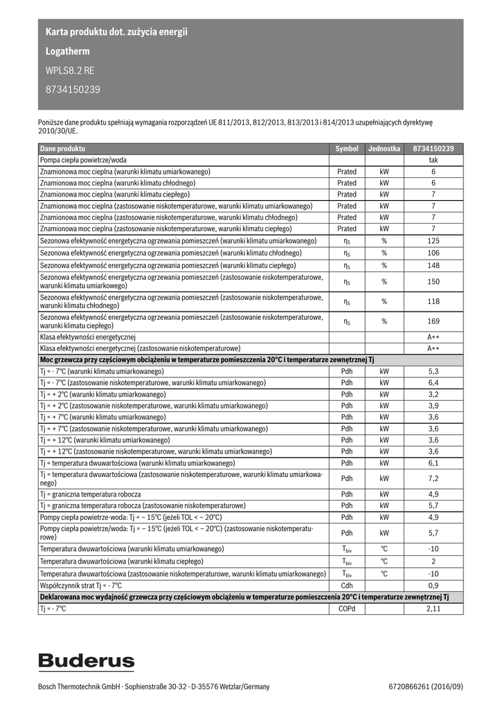 Karta produktu dot. zużycia energii Logatherm WPLS8.2 RE