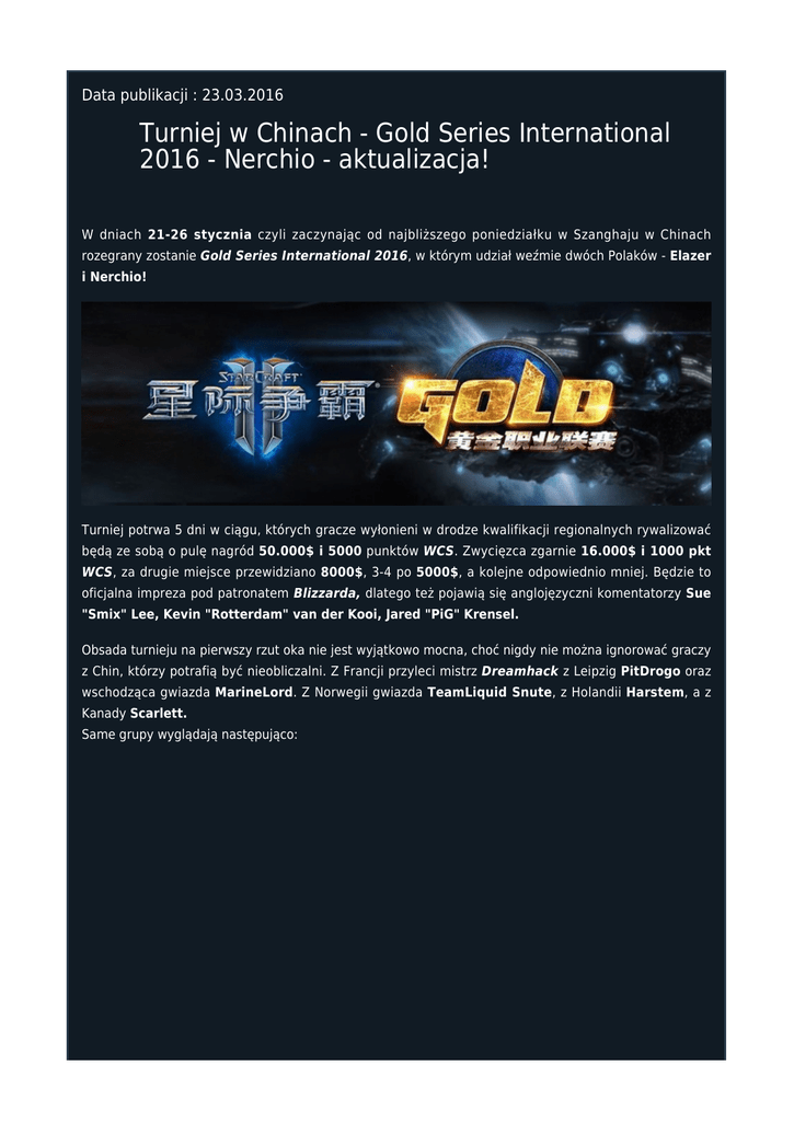 Data publikacji : 23.03.2016 Turniej w Chinach - Gold Series International 2016 - Nerchio - aktualizacja! W dniach 21-26 stycznia czyli zaczynając od najbliższego poniedziałku w Szanghaju w Chinach rozegrany zostanie Gold Series International 2016, w którym udział weźmie dwóch Polaków - Elazer i Nerchio! Turniej potrwa 5 dni w ciągu, których gracze wyłonieni w drodze kwalifikacji regionalnych rywalizować będą ze sobą o pulę nagród 50.000$ i 5000 punktów WCS. Zwycięzca zgarnie 16.000$ i 1000 pkt WCS, za drugie miejsce przewidziano 8000$, 3-4 po 5000$, a kolejne odpowiednio mniej. Będzie to oficjalna impreza pod patronatem Blizzarda, dlatego też pojawią się anglojęzyczni komentatorzy Sue "Smix" Lee, Kevin "Rotterdam" van der Kooi, Jared "PiG" Krensel. Obsada turnieju na pierwszy rzut oka nie jest wyjątkowo mocna, choć nigdy nie można ignorować graczy z Chin, którzy potrafią być nieobliczalni. Z Francji przyleci mistrz Dreamhack z Leipzig PitDrogo oraz wschodząca gwiazda MarineLord. Z Norwegii gwiazda TeamLiquid Snute, z Holandii Harstem, a z Kanady Scarlett. Same grupy wyglądają następująco: Elazer i Nerchio bardzo niefortunnie zostali rozstawieni w tej samej grupie i pierwszy mecz rozegrają przeciwko sobie. Z każdej grupy wychodzi po dwóch graczy, więc mimo wszystko obaj mają szansę na awans. ● Gold Series International 2016 liquipedia ● Stream BaseTradeTV ● Stream TakeTV ● Polski stream EmSC2TV AKTUALIZACJA Dzisiejszej nocy rozegrana została grupa C, w której znajdowali się obaj Polacy. Nerchio zaskakująco gładko pokonał 2:0 Elazera i 2:0 Scarlett awansując tym samym z pierwszego miejsca w grupie. Elazer natomiast zdołał pokonać Chińczyka XiGua, ale w meczu o wyjście uległ Scarlett 0:2 i zmuszony został pożegnać się z dalszą fazą turnieju. Już dziś w nocy rozegrana zostanie ostatnia grupa D i rozlosowane zostaną pary ćwierćfinałowe. AKTUALIZACJA Poznaliśmy ostatnich dwóch graczy i pary ćwierćfinałowe, które rozegrane zostaną dziś w nocy. Nerchio zmierzy się tym razem z super zergiem z TeamLiquid - Snute, który ostatnio jest w bardzo wysokiej formie (drugie miejsce w IEM Katowice 2016). O 5 rano czasu polskiego przekonamy się kto jest lepszy w ZvZ. Pozostałe pary wyglądają następująco: Autor: Fanek Liczba wyświetleń strony: 1077 Data publikacji : 23.03.2016 Data modyfikacji : 24.03.2016 Tagi: Gold Series International 2016, Elazer, Nerchio, turniej Komentarz (0) dodaj komentarz Brak komentarzy dodaj komentarz Pozostałe nowości DreamHack Open: Valencia 2016 - Nerchio w półfinale - live! DreamHack Valencia to jedno z największych e-sportowych wydarzeń w Europie - dlatego nie mogło zabraknąć na nim StarCrafta II! W czasie rozgrywek 96 graczy będzie konkurować o 50 000 USD oraz 5 000 punktów WCS.Data publikacji: 16.07.20161 Aktualizacja 3.4 – Duże zmiany w rankingu StarCrafta II Na oficjalnym blogu Blizzarda pojawił się nowy wpis dotyczący tym razem zmian w rankingach: Ranking StarCrafta II jest areną dla niezwykle zaciętej rywalizacji. Do walki rusza wielu uczestników, ale tylko nieliczni awansują do ścisłej czołówki.Data publikacji: 03.07.20160 Rozpoczęcie trzeciego sezonu rankingowego 2016 Trzeci sezon tegorocznych rozgrywek ligowych w StarCrafta II uważamy za otwarty! Zresetowano pulę punktów premiowych oraz rankingi i przyznano nagrody za sezon drugi roku 2016.Data publikacji: 26.06.20160 Filmowy „Warcraft” już wkrótce w księgarniach! Powieść „Warcraft”, której wydanie zbiega się z polską premierą filmu „Warcraft. Początek” w reżyserii Duncana Jonesa, do księgarń trafi już 15 czerwca. Na kartach książki czytelnicy wkroczą w nowy wymiar emocji towarzyszących bohaterom fikcyjnych światów Azeroth i Draenor. Za sprawą Christie Golden, pisarki od lat cenionej przez fanów świata Warcraft, konflikt ludzi i orków nabierze jeszcze większej intensywności.Data publikacji: 13.06.20160 Blokada obecnego sezonu i darmowa zmiana nazwy postaci Jak czytamy na oficjalnym blogu Blizzarda: Obecny sezon rankingowy zbliża się ku końcowi i wkrótce zamknięte zostaną wszystkie ligi i dywizje. Kilka dni przed rozpoczęciem nowego sezonu, darmowa zmiana nazwy postaci w StarCraft II zostanie ponownie dodana do wszystkich kont, dla których funkcja ta nie jest obecnie dostępna.Data publikacji: 12.06.20160 Wszystkie nowości