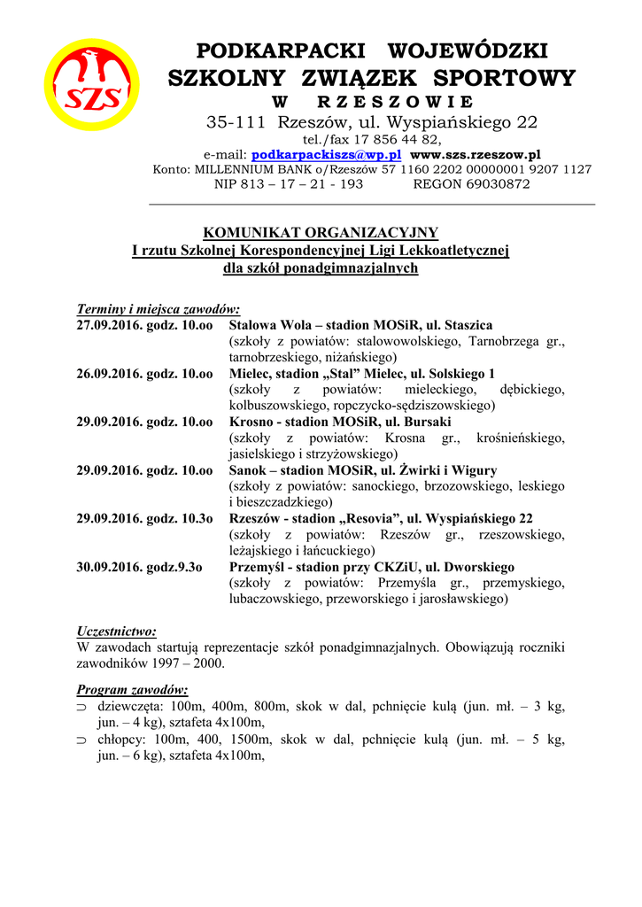 PODKARPACKI WOJEWÓDZKI SZKOLNY ZWIĄZEK SPORTOWY W RZESZOWIE 35-111 Rzeszów, ul. Wyspiańskiego 22 tel./fax 17 856 44 82, e-mail: [email protected] www.szs.rzeszow.pl Konto: MILLENNIUM BANK o/Rzeszów 57 1160 2202 0000 0001 9207 1127 NIP 813 – 17 – 21 - 193 REGON 69030872 _____________________________________________________________________ KOMUNIKAT ORGANIZACYJNY I rzutu Szkolnej Korespondencyjnej Ligi Lekkoatletycznej dla szkół ponadgimnazjalnych Terminy i miejsca zawodów: 27.09.2016. godz. 10.oo Stalowa Wola – stadion MOSiR, ul. Staszica (szkoły z powiatów: stalowowolskiego, Tarnobrzega gr., tarnobrzeskiego, niżańskiego) 26.09.2016. godz. 10.oo Mielec, stadion „Stal” Mielec, ul. Solskiego 1 (szkoły z powiatów: mieleckiego, dębickiego, kolbuszowskiego, ropczycko-sędziszowskiego) 29.09.2016. godz. 10.oo Krosno - stadion MOSiR, ul. Bursaki (szkoły z powiatów: Krosna gr., krośnieńskiego, jasielskiego i strzyżowskiego) 29.09.2016. godz. 10.oo Sanok – stadion MOSiR, ul. Żwirki i Wigury (szkoły z powiatów: sanockiego, brzozowskiego, leskiego i bieszczadzkiego) 29.09.2016. godz. 10.3o Rzeszów - stadion „Resovia”, ul. Wyspiańskiego 22 (szkoły z powiatów: Rzeszów gr., rzeszowskiego, leżajskiego i łańcuckiego) 30.09.2016. godz.9.3o Przemyśl - stadion przy CKZiU, ul. Dworskiego (szkoły z powiatów: Przemyśla gr., przemyskiego, lubaczowskiego, przeworskiego i jarosławskiego) Uczestnictwo: W zawodach startują reprezentacje szkół ponadgimnazjalnych. Obowiązują roczniki zawodników 1997 – 2000. Program zawodów: dziewczęta: 100m, 400m, 800m, skok w dal, pchnięcie kulą (jun. mł. – 3 kg, jun. – 4 kg), sztafeta 4x100m, chłopcy: 100m, 400, 1500m, skok w dal, pchnięcie kulą (jun. mł. – 5 kg, jun. – 6 kg), sztafeta 4x100m, Sprawy różne: Zawody zostaną przeprowadzone zgodnie z regulaminem zamieszczonym w „Kalendarzu szkolnych imprez sportowych na rok szkolny 2016/2017”. Koszty organizacyjne (wynajem stadionu, sędziowie, opieka medyczna, dyplomy) pokrywa PW SZS w Rzeszowie, natomiast koszty udziału pokrywają uczestniczące szkoły. Obowiązują legitymacje szkolne i zbiorowe listy zawodników pobrane z SYSTEMU REJESTRACJI SZKÓŁ podpisane przez Dyrektora szkoły. Warunkiem dopuszczenia do zawodów jest opłacenie przez szkołę rocznej zryczałtowanej opłaty startowej. Zgłoszenia (protokół zbiorczy + kartki startowe) przyjmowane będą w dniu zawodów godzinę przed planowanym rozpoczęciem imprezy. Przypominamy, że do każdej konkurencji indywidualnej szkoła może zgłosić max. 3 zawodników, z których 2 najlepszych punktuje dla drużyny. Do finału wojewódzkiego (Rzeszów, III dek. maja 2017r.) awansują: mistrzowie rejonów oraz do 20 najlepszych zespołów w kategorii dziewcząt i chłopców. Dyrektor PW SZS w Rzeszowie Jacek Bigus PROTOKÓŁ DRUŻYNOWYCH ZAWODÓW LEKKOATLETYCZNYCH DLA SZKÓŁ PONADGIMNAZJALNYCH szkoła miejsce zawodów DZIEWCZĘTA konkurencja 1p. imię i nazwisko data zawodów / CHŁOPCY rocznik wynik punkty 1. 2. 100m 3. 1. 2. 400m 3. 1. 800m / 2. 1500m 3. 1. pchnięcie 2. kulą 3. 1. skok w dal 2. 3. 1. 2. 4 x 100m 3. 4. Punkty razem: _______________ Miejsce szkoły: ______________ Nauczyciel / kierownik drużyny _____________________ Nazwisko i imię ________________________________ Nazwisko i imię ________________________________ Szkoła _______________________________________ Szkoła _______________________________________ Gmina ____________________ Powiat _____________ Gmina ____________________ Powiat _____________ Rok urodzenia ________ Konkurencja ______________ Rok urodzenia ________ Konkurencja ______________ Seria ___________________ Tor __________________ Seria ___________________ Tor __________________ _______ _______ ______ _______ _______ ______ _______ _______ ______ _______ _______ ______ (mierzone czasy lub wyniki poszczególnych prób) (mierzone czasy lub wyniki poszczególnych prób) Wynik oficjalny _________________ Miejsce ____________ Wynik oficjalny _________________ Miejsce ____________ Nazwisko i imię ________________________________ Nazwisko i imię ________________________________ Szkoła _______________________________________ Szkoła _______________________________________ Gmina ____________________ Powiat _____________ Gmina ____________________ Powiat _____________ Rok urodzenia ________ Konkurencja ______________ Rok urodzenia ________ Konkurencja ______________ Seria ___________________ Tor __________________ Seria ___________________ Tor __________________ _______ _______ ______ _______ _______ ______ _______ _______ ______ _______ _______ ______ (mierzone czasy lub wyniki poszczególnych prób) (mierzone czasy lub wyniki poszczególnych prób) Wynik oficjalny _________________ Miejsce ____________ Wynik oficjalny _________________ Miejsce ____________ Nazwisko i imię ________________________________ Nazwisko i imię ________________________________ Szkoła _______________________________________ Szkoła _______________________________________ Gmina ____________________ Powiat _____________ Gmina ____________________ Powiat _____________ Rok urodzenia ________ Konkurencja ______________ Rok urodzenia ________ Konkurencja ______________ Seria ___________________ Tor __________________ Seria ___________________ Tor __________________ _______ _______ ______ _______ _______ ______ _______ _______ ______ _______ _______ ______ (mierzone czasy lub wyniki poszczególnych prób) Wynik oficjalny _________________ Miejsce ____________ (mierzone czasy lub wyniki poszczególnych prób) Wynik oficjalny _________________ Miejsce ____________