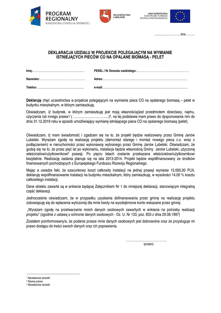 ………………………, dnia ……… DEKLARACJA UDZIAŁU W PROJEKCIE POLEGAJĄCYM NA WYMIANIE ISTNIEJĄCYCH PIECÓW CO NA OPALANE BIOMASĄ - PELET Imię:.................................................................... PESEL / Nr Dowodu osobistego:……………………………………………..….. Nazwisko: ………………………………………..… Adres:............................................................................................................... Telefon: ............................................................. e-mail:............................................................................................................... Deklaruję chęć uczestnictwa w projekcie polegającym na wymianie pieca CO na opalanego biomasą – pelet w budynku mieszkalnym, w którym zamieszkuję. Oświadczam, iż budynek, w którym zamieszkuję jest moją własnością/jest przedmiotem dzierżawy, najmu, użyczenia lub innego prawa1/ ( …………………………..)2, na tej podstawie mam prawo do dysponowania nim do dnia 31.12.2019 roku w sposób umożliwiający wymianę istniejącego pieca CO na opalanego biomasą (pelet). Oświadczam, iż mam świadomość i zgadzam się na to, że projekt będzie realizowany przez Gminę Janów Lubelski. Wyrażam zgodę na realizację projektu (demontaż starego i montaż nowego pieca c.o. wraz z podłączeniem) w nieruchomości przez wykonawcę wybranego przez Gminę Janów Lubelski. Oświadczam, że godzę się na to, że przez pięć lat po wykonaniu, instalacja będzie własnością Gminy Janów Lubelski, użyczoną właścicielowi/użytkownikowi3 posesji. Po pięciu latach zostanie przekazana właścicielowi/użytkownikowi bezpłatnie. Realizację zadania planuje się na lata 2013-2014. Projekt będzie współfinansowany ze środków finansowanych pochodzących z Europejskiego Funduszu Rozwoju Regionalnego. Mając a uwadze fakt, że szacunkowy koszt całkowity instalacji na jednej posesji wyniesie 15.000,00 PLN, deklaruję współfinansowanie instalacji na budynku mieszkalnym, który zamieszkuję, w wysokości 14,00 % kosztu całkowitego instalacji. Dane obiektu zawarte są w ankiecie będącej Załącznikiem Nr 1 do niniejszej deklaracji, stanowiącym integralną część deklaracji. Jednocześnie oświadczam, że w przypadku uzyskania dofinansowania przez gminę na realizację projektu zobowiązuję się do wpłacenia wyliczonej dla mnie kwoty na wyodrębnione konto wskazane przez gminę. „Wyrażam zgodę na przetwarzanie moich danych osobowych zawartych w ankiecie na potrzeby realizacji projektu" (zgodnie z ustawą o ochronie danych osobowych - Dz. U. Nr 133, poz. 833 z dnia 29.08.1997) Zostałem poinformowany/a, że podanie przeze mnie danych osobowych jest dobrowolne oraz że przysługuje mi prawo dostępu do treści swoich danych oraz ich poprawienia. ……………………………………… (podpis) Niewłaściwe skreślić Nazwa prawa 3 Niewłaściwe skreślić 1 2