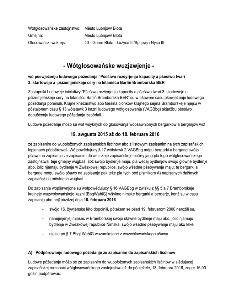 Wótgłosowańske zastojnstwo: Mĕsto Lubnjow/ Błota Gmejna: Mĕsto Lubnjow/ Błota Głosowański wokrejs: 40 - Gorne Błota - Łužyca III/Sprjewja-Nysa III - Wótgłosowańske wuzjawjenje wó pśewjeźenju ludowego póžedanja “Pśeśiwo rozšyrjenju kapacity a pśeśiwo twari 3. startoweje a pśizemjeńskeje cery na lětanišću Barliń Bramborska BER” Zastupniki Ludoweje iniciatiwy “Pśeśiwo rozšyrjenju kapacity a pśeśiwo twari 3. startoweje a pśizemjeńskeje cery na lětanišću Barliń Bramborska BER” su w pšawem casu pśewjeźenje ludowego póžedanja pominali. Krajne kněžarstwo abo tśeśina cłonkow krajnego sejma Bramborskeje njejsu w póstajonem casu § 13 wótstawk 3 kazni ludowego wótgłosowanja (VAGBbg) skjaržbu pśeśiwo dopušćenju ludowego póžedanja zapódali. Ludowe póžedanje móžo se wót wšyknych do głosowanja wopšawnjonych bergarkow a bergarjow wót 19. awgusta 2015 až do 18. februara 2016 ze zapisanim do wupołožonych zapisańskich lisćinow abo z listowym zapisanim na tych zapisańskich łopjenach pódpěrowaś. Wótpowědujucy § 17 wótstawk 2 VAGBbg mógu bergarki a bergarje swójo pšawo na zapisanje ze zapisanim do amtskeje zapisańskeje lisćiny jano pla togo wótgłosowańskego zastojnstwa teje gmejny wugbaś, źož swójo bydlenje maju, pla wěcej bydlenjow swójo głowne bydlenje abo, jolic njamaju bydlenje w Zwězkowej republice, swójo wšedne pśebywanje maju; te bergarki a bergarje mógu swójo pšawo na zapisanje pak teke pla tych pód pismikom A) napisanych dalšnych zapisańskich městnach wugbaś. Do zapisanja wopšawnjone su wótpowědujucy § 16 VAGBbg w zwisku z §§ 5 a 7 Bramborskeje krajneje wuzwólowańskeje kazni (BbgWahlG) wšykne nimske bergarki a bergarje, kenž su w casu zapisanja abo nejžpózdźej dnja 18. februara 2016 - swójo 16. žywjeńske lěto dopołnili, pótakem se pśed 19. februarom 2000 naroźili su, - nanejmjenjej mjasec w Bramborskej swójo stawne bydlenje maju abo, jolic njamaju bydlenje w Zwězkowej republice Nimska, swójo wšedne pśebywanje maju ako teke - njejsu pó § 7 BbgLWahlG wuzamknjone z wuzwólowańskego pšawa. A) Pódpěrowanje ludowego póžedanje ze zapisanim do zapisańskich lisćinow Ludowe póžedanje móžo se ze zapisanim do wupołožonych zapisańskich lisćinow w slědujucej zapisańskej rumnosći wótgłosowańskego zastojnstwa až do pónjeźele, 18. februara 2016, zeger 16:00 goźin pódpěrowaś: Zapisańska rumnosć: Mĕsto Lubnjow/ Błota radnica, běrow bergarjow cerkwinske namĕstno 01 03222 Lubnjow/ Błota Zapisańske casy: pónjeźele w casu wót 9:00 - 16:00 góz. wałtoru w casu wót 9:00 - 18:00 góz. srjodu w casu wót 13:00 - 16:00 góz. stwórtk w casu wót 9:00 - 18:00 góz. pětk w casu wót 9:00 - 13:00 góz. Wósoby, kenž kśě se do zapisańskich lisćinow zapisaś, maju se wó swójej wósobje wupokazaś (§ 7 wótstawk 1 jadnańskego pórěda ludowego póžedanja – VVVBbg). Chtož se do zapisańskeje lisćiny zapisujo, musy wósobinski a rukopisnje pódpisaś. Mimo pódpisa muse se familijowe mě, pśedmě, źeń naroźenja, bydleńske město a bydlenje, pla wěcej bydlenjow głowne bydlenje abo wšedne pśebywanje, ako teke źeń zapisanja zapisaś, tak až se daju derje cytaś (§ 18 wótstawk 1 VAGBbg w zwisku z § 8 wótstawk 1 VVVBbg). Zapisanje njamóžo se pó § 18 wótstawk 2 VAGBbg wěcej slědk wześ. Do zapisanja wopšawnjone wósoby, kenž dla śělnego bracha njejsu w połoženju, zapisanje sami wugbaś a to z pokazku na swój brach napisaś daju, se pó zastojnsku do zapisańskeje lisćiny zapišu (§ 15 wótstawk 2 VAGBbg w zwisku z § 8 wótstawk 2 VVVBbg). Do zapisanja wopšawnjone wósoby, kenž dla śělnego bracha do zapisańskeje rumnosći pśiś njamógu abo jano pód njepśiśpiwajobnymi śěžkosćami tam dojś mógu, mógu wósobje swójeje dowěry (pomocna wósoba) nadawk daś, swójo zapisańske pšawo wugbaś. Za to ma do zapisanja wopšawnjona wósoba pomocnej wósobje wótpowědujucu połnomóc wupisaś (§15 wótstawk 2 VAGBbg w zwisku z § 7 wótstawk 4 VVVBbg). B) Pódpěranje ludowego póžedanja z listowym zapisanim Kuždy do zapisanja wopšawnjony ma pšawo, na pšosbu ludowe póžedanje z listowym zapisanim pódpěraś. Pšosba móžo se wót do zapisanja wopšawnjoneje wósoby sameje abo jadneje wót njeje społnomócnjoneje wósoby pisnje, elektroniski (na pśikład z e-mail abo faksom) abo wustnje (za napisanje) we wótgłosowańskem zastojnstwje stajiś, w kótaremž do zapisanja wopšawnjona wósoba swójo bydlenje, pla wěcej bydlenjow swójo głowne bydlenje, abo swójo wšedne pśebywanje ma. Pśi elektroniski stajonej pšosbje musy se źeń naroźenja pšosbu stajuceje wósoby pódaś (§15 wótstawk 6 sada 2 w zwisku z § 15 wótstawk 2 sada VAGBbg). Telefoniske stajanje pšosby njejo dowólone. Pšosbu stajeca wósoba móžo pśi stajanju pšosby teke pomoc wósoby swójeje dowěry (pomocneje wósoby) wužywaś (§ 15 wótstawk 6 sada 2 w zwisku z § 15 wótstawk 2 sada 2 VAGBbg). Zapisańske łopjena mógu se až do dwa dnja pśed zakóńcenim zapisańskego casa póžedaś (§ 8a wótstawk 5 VVVBbg). Za listowe zapisanje trěbne pódłožki (zapisańske łopjeno a listowa wobalka) se póžedanje stajucej wósobje dermo pśipósćelu. Zapisaś musy se wósobinski. Chtož dla śělnego bracha w połoženju njejo, listowe zapisanje wósobinski pśewjasć, móžo pomoc jadneje wósoby (pomocna wósoba) wužywaś (§ 15 wótstawk 6 sada 2 w zwisku z § 15 wótstawk 2 sada 2 VAGBbg). Na zapisańskem łopjenje ma do zapisanja wopšawnjona wósoba abo pomocna wósoba napśeśiwo wótgłosowańskemu zastojnstwoju město pśisegi wobwěsćiś, až jo wuzjawjenje pódpěranja ludowego póžedanja wósobinski a pó wuzjawjonej wóli do zapisanja wopšawnjoneje wósoby wótedała (§15 wótstawk 7 VAGBbg). Pśi listowem zapisanju musy do zapisanja wopšawnjony zapisańske łopjeno scasom na to na amtskej 