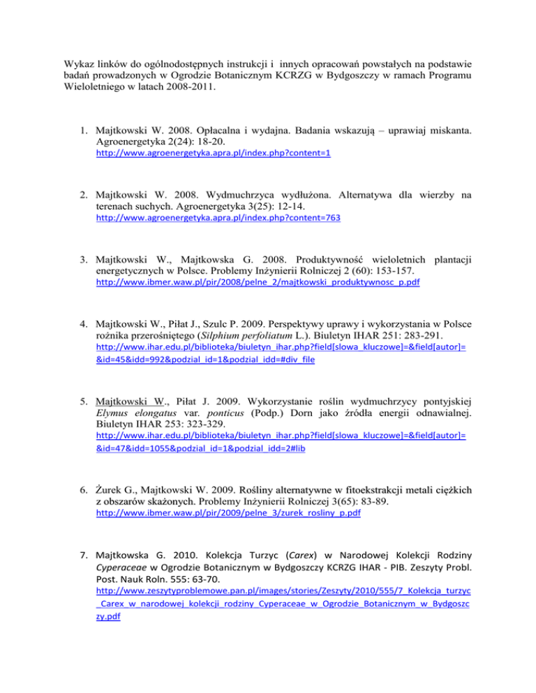 Wykaz linków do ogólnodostępnych instrukcji i innych opracowań powstałych na podstawie badań prowadzonych w Ogrodzie Botanicznym KCRZG w Bydgoszczy w ramach Programu Wieloletniego w latach 2008-2011. 1. Majtkowski W. 2008. Opłacalna i wydajna. Badania wskazują – uprawiaj miskanta. Agroenergetyka 2(24): 18-20. http://www.agroenergetyka.apra.pl/index.php?content=1 2. Majtkowski W. 2008. Wydmuchrzyca wydłużona. Alternatywa dla wierzby na terenach suchych. Agroenergetyka 3(25): 12-14. http://www.agroenergetyka.apra.pl/index.php?content=763 3. Majtkowski W., Majtkowska G. 2008. Produktywność wieloletnich plantacji energetycznych w Polsce. Problemy Inżynierii Rolniczej 2 (60): 153-157. http://www.ibmer.waw.pl/pir/2008/pelne_2/majtkowski_produktywnosc_p.pdf 4. Majtkowski W., Piłat J., Szulc P. 2009. Perspektywy uprawy i wykorzystania w Polsce rożnika przerośniętego (Silphium perfoliatum L.). Biuletyn IHAR 251: 283-291. http://www.ihar.edu.pl/biblioteka/biuletyn_ihar.php?field[slowa_kluczowe]=&field[autor]= &id=45&idd=992&podzial_id=1&podzial_idd=#div_file 5. Majtkowski W., Piłat J. 2009. Wykorzystanie roślin wydmuchrzycy pontyjskiej Elymus elongatus var. ponticus (Podp.) Dorn jako źródła energii odnawialnej. Biuletyn IHAR 253: 323-329. http://www.ihar.edu.pl/biblioteka/biuletyn_ihar.php?field[slowa_kluczowe]=&field[autor]= &id=47&idd=1055&podzial_id=1&podzial_idd=2#lib 6. Żurek G., Majtkowski W. 2009. Rośliny alternatywne w fitoekstrakcji metali ciężkich z obszarów skażonych. Problemy Inżynierii Rolniczej 3(65): 83-89. http://www.ibmer.waw.pl/pir/2009/pelne_3/zurek_rosliny_p.pdf 7. Majtkowska G. 2010. Kolekcja Turzyc (Carex) w Narodowej Kolekcji Rodziny Cyperaceae w Ogrodzie Botanicznym w Bydgoszczy KCRZG IHAR - PIB. Zeszyty Probl. Post. Nauk Roln. 555: 63-70. http://www.zeszytyproblemowe.pan.pl/images/stories/Zeszyty/2010/555/7_Kolekcja_turzyc _Carex_w_narodowej_kolekcji_rodziny_Cyperaceae_w_Ogrodzie_Botanicznym_w_Bydgoszc zy.pdf 8. Majtkowski W. 2010. Rośliny źródłem biomasy na cele energetyczne. Wartości opałowe wybranych roślin energetycznych, zasady zakładania i pielęgnacji plantacji, zbiory, przetwarzanie, sprzedaż. (W:) Poradnik pt. „Wykorzystanie odnawialnych źródeł energii”, Wyższa Szkoła Gospodarki w Bydgoszczy: 33-42 (całość 48 s.), ISBN 978-83-61-036-73-9. http://www.mechatronika-byd.pl/FTP/Semestr4/Sieci/Poradnik-Wykorz-Odn-Zr-EN11-0920.pdf 9. Majtkowski W. 2010. Odtworzenie fitocenozy wydmowej i solniska w Ogrodzie Botanicznym w Bydgoszczy KCRZG IHAR - PIB. Zeszyty Probl. Post. Nauk Roln. 555: 7177. http://www.zeszytyproblemowe.pan.pl/images/stories/Zeszyty/2010/555/8_Odtwor zenie_fitocenozy_wydmowej_i_solniska_w_Ogrodzie_Botanicznym_w_Bydgoszczy.p df 10. Schmidt J. 2010. Zasoby genowe roślin dziko rosnących z rodziny motylkowatych (Fabaceae) – ekspedycje Ogrodu Botanicznego w Bydgoszczy. Zeszyty Probl. Post. Nauk Roln. 555: 79-92. http://www.zeszytyproblemowe.pan.pl/images/stories/Zeszyty/2010/555/9_Zasoby_genow e_rolin_dziko_rosncych_z_rodziny_motylkowatych.pdf 11. Pogrzeba M., Krzyżak J., Sas-Nowosielska A., Majtkowski W., Małkowski E., Kita A. 2011. A heavy metal environmental threat resulting from combustion of biofuels of plant origin. (W:) Simeonov L.I., Kochubovski M.V., Simeonova B.G. (eds.) “Environmental Heavy Metal Pollution and Effects on Child Mental Development – Risk Assessment and Prevention Strategies”, Springer Science+Business media B.V.: 213-225, ISBN 978-94-007-0252-3 (całość 361 s.). http://rd.springer.com/static-content/0.4951/pdf/94/chp%253A10.1007%252F978-94-0070253-0_13.pdf?token=1343640602483-7b2fa801b5c66ec020048fbedc3d5c32234327c7f4c31b99a5398a51418e03d9e4ce797775bf8 94346d85e9f9f47fe341a93d590ecbfef7bf1801c1035e23d0c&doi=10.1007/978-94-007-02530_13&contentType=chapter 12. Majtkowski W., Golimowski R., Boroń M., Szulc M. 2011. Rekultywacja pól irygowanych w Bydgoszczy z wykorzystaniem metody fitoremediacji. Problemy Inżynierii Rolniczej 2(72): 177-184. http://www.itep.edu.pl/wydawnictwo/pir/zeszyt_72_2011/W_Majtkowski%20i%20in%20%20Rekultywacja%20pol%20irygowanych%20w%20Bydgoszczy.pdf