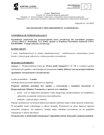 Projekt „Stała Praca” Priorytet VII „Promocja integracji społecznej” Działanie 7.2 „Przeciwdziałanie wykluczeniu i wzmocnienie sektora ekonomii społecznej” Poddziałanie 7.2.1 „Aktywizacja zawodowa i społeczna osób zagrożonych wykluczeniem społecznym” Załącznik Nr 1 do SIWZ SZCZEGÓŁOWY OPIS PRZEDMIOTU ZAMÓWIENIA I INFORMACJE WPROWADZAJĄCE Przedmiotem zamówienia jest przeprowadzenie kursu zawodowego dla uczestników projektu: „STAŁA PRACA” Podziałanie 7.2.1. POKL zgodnie ze Wspólnym Słownikiem Zamówień (CPV): kod 80530000 – 8 usługi szkolenia zawodowego. II OPIS GRUPY 2 osoby niepełnosprawnych (o stopniu niepełnosprawności - umiarkowanym), zamieszkujące powiat brzeski, z różnych grup wiekowych, o różnym poziomie wykształcenia. III KURS ZAWODOWY Zadanie 7 - Przeprowadzenie kursu pn. Prawo jazdy kategorii C i C +E w wymiarze godzin szkoleniowych zgodnie z obowiązującymi przepisami (należy doliczyć czas na przeprowadzenie egzaminów wewnętrznych i zewnętrznych). Liczba uczestników – 2 osoba Tematyka kursu powinna obejmować co najmniej: Program szkolenia powinien być zgodny z wytycznymi i zasadami zawartymi w Rozporządzeniu Ministra Transportu w sprawie w/w szkolenia. - teoria - test ze znajomości przepisów ruchu drogowego przeprowadzany na komputerze, zgłoszenie na egzamin teoretyczny oraz praktyczny; - praktyka - jazda po placu i mieście. Pojazdy mechaniczne na których będzie prowadzone szkolenie będą w pełni sprawne technicznie. W przypadku awarii wskazanego w ofercie pojazdu, Wykonawca na okres naprawy zapewni samochód zastępczy. Po naprawie, kolejne etapy szkolenia prowadzone są na pojeździe wskazanym w ofercie lub innym. WYKONAWCA POWINIEN POSIADAĆ UBEZPIECZONE POJAZDY SZKOLENIOWE. 1 Ukończenie szkolenia zostanie potwierdzone stosownym zaświadczeniem, zgodnie z obowiązującymi w tym zakresie przepisami prawa. CZĘŚĆ II – Zadanie 8 - Przeprowadzenie kursu pn. Kwalifikacje wstępne przyspieszone na przewóz rzeczy w kraju Liczba uczestników – 2 osoby w wymiarze godzin szkoleniowych zgodnie z obowiązującymi przepisami (należy doliczyć czas na przeprowadzenie egzaminów wewnętrznych i zewnętrznych). Tematyka kursu powinna obejmować co najmniej: Zakres tematyczny i godzinowy szkolenia kwalifikacji wstępnej przyspieszonej musi być zgodny Rozporządzeniem Ministra Infrastruktury z dnia 01 kwietnia 2010r. w sprawie szkolenia kierowców wykonujących przewóz drogowy (Dz.U. 2010 nr 53 poz. 314) oraz zgodnie z ustawą z dnia 12 lutego 2010r. o zmianie ustawy o transporcie drogowym oraz o zmianie niektórych innych ustaw (Dz.U. 2010 nr 43 poz. 246) Wykonawca zobowiązany jest do realizacji szkolenia zgodnie z przepisami: - Ustawa z dnia 6 września 2001r. o transporcie drogowym (tekst jedn. Dz. U. 2007r. Nr 125 poz. 874 ze zm.), - Rozporządzenie Ministra Infrastruktury z dnia 10 kwietnia 2008r. w sprawie wymagań dotyczących prowadzenia ośrodka doskonalenia techniki jazdy, postępowania z dokumentacją związaną z prowadzeniem szkoleń oraz wzorów stosowanych dokumentów (Dz. U. z 2008r. Nr 77, poz. 458). IV INFORMACJE DODATKOWE 1. W skład kosztów zamówienia wchodzi: - koszt zatrudnienia wyszkolonych i doświadczonych wykładowców / trenerów / instruktorów, - zapewnienie wszystkim uczestnikom szkolenia ubezpieczenia od następstw nieszczęśliwych wypadków, na czas trwania zajęć oraz w drodze na zajęcia i powrót z nich, - skierowanie i przeprowadzenie badań lekarskich wymaganych w ramach danego kursu/szkolenia; - opłacanie egzaminów państwowych, czeladniczych i licencji przy kursach, - koszt egzaminów wewnętrznych i zewnętrznych oraz wydania zaświadczeń/ certyfikatów. 2. Szkolenia/ kursy powinny być realizowane nie więcej niż po 6 godzin zegarowych (60 min) wraz z przerwami. Zajęcia powinny odbywać się od poniedziałku do piątku pomiędzy godzinami 8:30 do 2 14:30. Szkolenie/ kurs będzie można realizować w innych godzinach/dniach tylko za zgodą Zamawiającego, w przypadku porozumienia uczestnikami projektu. 3. Szkolenie powinno być realizowane na terenie powiatu brzeskiego lub miasta Opole albo miasta Wrocław (w miejscu/miejscowości, do którego dojazd komunikacją publiczną jest łatwo dostępny). Miejsce inne niż wskazane musi być uprzednio zaakceptowane przez Zamawiającego. Wykonawca ponosi wówczas koszty przejazdu, wyżywienia i zakwaterowania uczestników. 4. Wykonawca ma możliwość dołączyć uczestników szkolenia/ kursu do innej grupy szkoleniowej, przy zapewnieniu poprawnej realizacji programu szkolenia właściwego dla osób skierowanych przez Powiatowy Urząd Pracy w Brzegu. 5. Harmonogram zajęć powinien zostać sklarowany tak, aby zapewnić sprawną i płynną organizację uwzględniając przerwy, przy czym ma być on dostosowany do potrzeb i możliwości uczestników szkolenia/ kursu. 6. Wykonawca jest zobowiązany (przed podpisaniem umowy) do przedstawienia propozycji szczegółowego programu szkolenia ze wskazaniem osób prowadzących zajęcia oraz ich kwalifikacji. Każdy program szkolenia w szczególności winien zawierać: - nazwę i zakres szkolenia; - czas trwania i sposób organizacji szkolenia; - wymagania wstępne dla uczestników szkolenia; - cele szkolenia; - plan nauczania określający tematy zajęć edukacyjnych oraz ich wymiar, z uwzględnieniem części teoretycznej i części praktycznej; - treści szkolenia w zakresie poszczególnych zajęć edukacyjnych; - wykaz literatury oraz niezbędnych środków i materiałów dydaktycznych; - sposób sprawdzania efektów szkolenia. 7. Wykonawca winien dostosować ilość i jakość pomieszczeń do potrzeb określonego szkolenia oraz wyposażyć je w sprzęt i pomoce dydaktyczne, z uwzględnieniem bezpiecznych i higienicznych warunków pracy i nauki. 8. Każde szkolenie/ kurs powinno zakończyć się wydaniem: certyfikatu/zaświadczenia o ukończeniu szkolenia/kursu zgodnie z Rozp