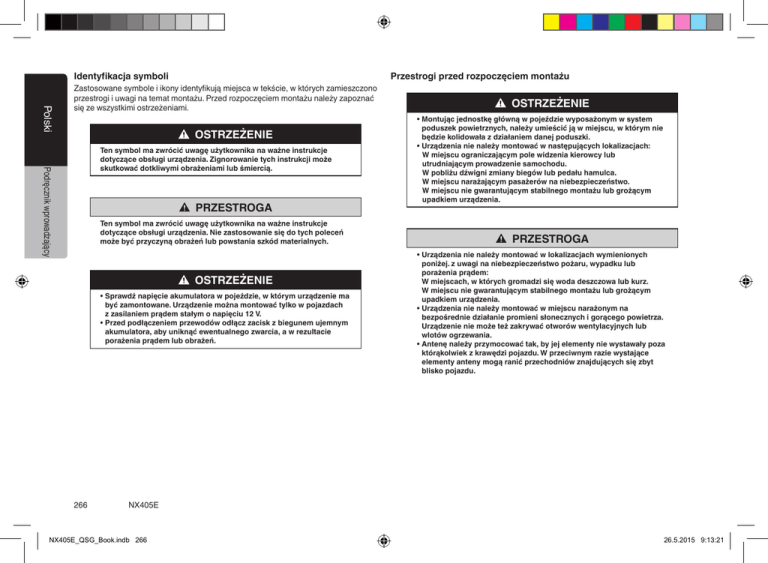 Identyfikacja symboli Polski Zastosowane symbole i ikony identyfikują miejsca w tekście, w których zamieszczono przestrogi i uwagi na temat montażu. Przed rozpoczęciem montażu należy zapoznać się ze wszystkimi ostrzeżeniami. OSTRZEŻENIE Podręcznik wprowadzający Ten symbol ma zwrócić uwagę użytkownika na ważne instrukcje dotyczące obsługi urządzenia. Zignorowanie tych instrukcji może skutkować dotkliwymi obrażeniami lub śmiercią. PRZESTROGA Ten symbol ma zwrócić uwagę użytkownika na ważne instrukcje dotyczące obsługi urządzenia. Nie zastosowanie się do tych poleceń może być przyczyną obrażeń lub powstania szkód materialnych. OSTRZEŻENIE •S prawdź napięcie akumulatora w pojeździe, w którym urządzenie ma być zamontowane. Urządzenie można montować tylko w pojazdach z zasilaniem prądem stałym o napięciu 12 V. •P rzed podłączeniem przewodów odłącz zacisk z biegunem ujemnym akumulatora, aby uniknąć ewentualnego zwarcia, a w rezultacie porażenia prądem lub obrażeń. 266 Przestrogi przed rozpoczęciem montażu OSTRZEŻENIE •M ontując jednostkę główną w pojeździe wyposażonym w system poduszek powietrznych, należy umieścić ją w miejscu, w którym nie będzie kolidowała z działaniem danej poduszki. •U rządzenia nie należy montować w następujących lokalizacjach: W miejscu ograniczającym pole widzenia kierowcy lub utrudniającym prowadzenie samochodu. W pobliżu dźwigni zmiany biegów lub pedału hamulca. W miejscu narażającym pasażerów na niebezpieczeństwo. W miejscu nie gwarantującym stabilnego montażu lub grożącym upadkiem urządzenia. PRZESTROGA •U rządzenia nie należy montować w lokalizacjach wymienionych poniżej. z uwagi na niebezpieczeństwo pożaru, wypadku lub porażenia prądem: W miejscach, w których gromadzi się woda deszczowa lub kurz. W miejscu nie gwarantującym stabilnego montażu lub grożącym upadkiem urządzenia. •U rządzenia nie należy montować w miejscu narażonym na bezpośrednie działanie promieni słonecznych i gorącego powietrza. Urządzenie nie może też zakrywać otworów wentylacyjnych lub wlotów ogrzewania. •A ntenę należy przymocować tak, by jej elementy nie wystawały poza którąkolwiek z krawędzi pojazdu. W przeciwnym razie wystające elementy anteny mogą ranić przechodniów znajdujących się zbyt blisko pojazdu. NX405E NX405E_QSG_Book.indb 266 26.5.2015 9:13:21 Uwagi dotyczące montażu •P rzed podłączeniem przewodów należy je sprawdzić za pomocą multimetru. W wielu nowych pojazdach stosowane są obwody multipleksowe i/lub obwody z niskim napięciem, które mogą zostać uszkodzone w przypadku użycia próbówki świetlnej lub analizatora logicznego. •P rzewody należy podłączyć poprawnie. Nieprawidłowe podłączenie przewodów może być przyczyną pożaru lub wypadku. •U kładając przewody w karoserii pojazdu, należy korzystać z przelotek nieprzewodzących prądu. Zniszczenie powłoki kabli na skutek ocierania może doprowadzić do wypadku, pożaru lub zwarcia. •P o ułożeniu kabli należy je przymocować za pomocą taśmy izolacyjnej. •N ależy pamiętać, iż pozostawienie włączonego silnika pojazdu podczas podłączania przewodów do urządzenia lub ich odłączania grozi porażeniem prądem, obrażeniami lub wypadkiem. Podręcznik wprowadzający PRZESTROGA •N ależy używać wyłącznie części znajdujących się w zestawie. Zastosowanie części pochodzących z nieznanego źródła może być przyczyną uszkodzeń. •W szystkie otwory wycięte w karoserii należy zakleić przy użyciu kleju silikonowego. Jeśli woda lub spaliny dostaną się do pojazdu, mogą być przyczyną wypadku. •P odczas montażu urządzenia należy pamiętać o mocnym dokręceniu śrub. Poluzowane śruby grożą wypadkiem lub nieprawidłowym działaniem urządzenia. Polski •P rzed zamontowaniem urządzenia w pojeździe należy zwrócić uwagę na położenie rur, zbiorników na płyny oraz przewodów elektrycznych, ponieważ kontakt urządzenia z tymi częściami może być przyczyną pożaru lub awarii. PRZESTROGA Polski OSTRZEŻENIE Uwagi dotyczące podłączenia OSTRZEŻENIE •K able nie mogą przeszkadzać w obsłudze, dlatego należy je ułożyć zgodnie ze schematem zamieszczonym w podręczniku użytkownika. •P rzewody/kable należy układać z dala od miejsc, w których panują wysokie temperatury. Stopienie się powłoki kabli może doprowadzić do wypadku lub pożaru na skutek zwarcia. Szczególna ostrożność wymagana jest przy układaniu przewodów w komorze silnika. •U kładając przewody w pojeździe wyposażonym w system poduszek powietrznych, pod żadnym pozorem nie należy umieszczać przewodów w miejscach, które mogą mieć wpływ na działanie danej poduszki powietrznej. W razie wypadku niewłaściwie działająca poduszka powietrzna może zwiększyć ewentualne obrażenia pasażera. NX405E NX405E_QSG_Book.indb 267 267 26.5.2015 9:13:21 Przedłużacz USB.................................................................................................. 1 Polski MONTAŻ Uchwyt kabli.......................................................................................................... 2 Śruby do montażu równo z powierzchnią ............................................................. 8 SPIS TREŚCI 1. Zanim rozpoczniesz........................................................................................268 2. Zawartość opakowania...................................................................................268 Podręcznik wprowadzający 3. Ogólne środki ostrożności...............................................................................268 4. Środki ostrożności dotyczące montażu...........................................................268 5. Montaż jednostki głównej................................................................................269 1. Zanim rozpoczniesz 1