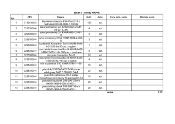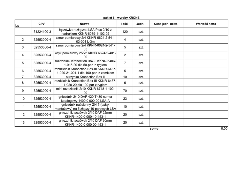 pakiet 6 - wyroby KRONE CPV Lp 1 31224100-3 2 32553000-4 3 32553000-4 4 32553000-4 5 32553000-4 6 32553000-4 7 32553000-4 8 32553000-4 9 32553000-4 10 32553000-4 11 32553000-4 12 32553000-4 13 32553000-4 Nazwa łączówka rozłączna ŁSA Plus 2/10 z nadrukiem KKNR-6089-1-102-02 sznur pomiarowy 2/4 KKNR-6624-2-54103-001 L-3m sznur pomiarowy 2/4 KKNR-6624-2-54105 wtyk pomiarowy 2/2x2 KKNR 6624-2-40100 rozdzielnik Kronection Box-II KKNR-64061-015-20 dla 50-par, z ryglem rozdzielnik Kronection Box-III KKNR-64371-020-21-001-1 dla 100-par, z zamkiem skrzynka Kronection Box II rozdzielnik Kronection Box-III KKNR-64371-020-20 dla 100-par z ryglem mini rozdzielnik 2/10 KKNR-6748-1-10200 gniezdnik 2/10 DAF-420 T=30 numer katalogowy 1400 0 000-00 LSA-A gniezdnik naścienny GN-5 (pałąk montażowy) na 5 złączy 10-parowych LSA gniezdnik łączówek 2/10 DAF 22mm KKNR-1400-0-000-10-453-1 gniezdnik łączówek 2/10 DAF 30mm KKNR-1400-0-000-00-453-1 Ilość Jedn. 120 szt. 4 szt. 5 szt. 2 szt. 7 szt. 5 szt. 10 szt. 6 szt. 70 szt. 23 szt. 10 szt. 20 szt. 20 szt. Cena jedn. netto suma Wartość netto 0,00