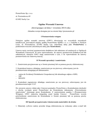 PromoNotes Sp. z o.o. ul. Poziomkowa 69 62-002 Suchy Las Ogólne Warunki Umowne obowiązujące od dnia 1 września 2014 roku Aktualna wersja dostępna jest na stronie http://promonotes.pl I Postanowienia wstępne Niniejsze ogólne warunki umowne (OWU) obowiązują we wszystkich stosunkach handlowych, powstałych między spółką PromoNotes Spółka z o. o. z siedzibą w Suchym Lesie, ul. Poziomkowa, 62-002 Suchy Las, (określaną dalej jako PromoNotes) a podmiotami trzecimi (określonymi dalej jako Kontrahent). Umowa może zawierać postanowienia dodatkowe lub odmienne od ustalonych w Ogólnych Warunkach Umownych. W razie wprowadzenia do umowy postanowień dodatkowych lub odmiennych, niniejsze OWU mają zastosowanie o tyle, o ile wprowadzone do umowy postanowienia nie stanowią inaczej. II Warunki sprzedaży i zamówienia 1. Zamówienia przyjmowane są w formie pisemnej lub za pomocą poczty elektronicznej. 2. Kontrahent krajowy składając zamówienie po raz pierwszy zobowiązany jest do przedstawienia następujących dokumentów: − − − wpisu do Ewidencji Działalności Gospodarczej lub aktualnego odpisu z KRS; NIP REGON 3. Kontrahent zagraniczny składając zamówienie po raz pierwszy zobowiązany jest do przedstawienia kopii VAT. Do zawarcia umowy (dalej jako Umowa) pomiędzy PromoNotes a Kontrahentem dochodzi z chwilą wysłania przez PromoNotes do Kontrahenta dokumentu „Potwierdzenie zamówienia” złożonego przez Kontrahenta. Z zastrzeżeniem punktu I (Postanowienia Wstępne), OWU stanowią integralną część każdej Umowy. PromoNotes wysyła potwierdzenie zamówienia do Kontrahenta w formie pisemnej lub za pomocą poczty elektronicznej. III Sposób przygotowania i dostarczenia materiałów do druku 1. Materiały cyfrowe należy przesłać drogą elektroniczną na wskazany adres e-mail lub 1 umieścić na FTP PromoNotes w osobnym folderze podpisanym przez Kontrahenta. Dopuszczalne jest również przesłanie materiałów na najpopularniejszych nośnikach cyfrowych (CD-ROM lub DVD). 2. Do materiałów należy dołączyć spis zawartości i/lub makiety, maksymalnie wierny kolorystycznie wydruk albo plik PDF, spełniający rolę wydruku próbnego (ustawienia tworzenia pliku PDF: Jakość drukarska). 3. Projekty do wydruku winny być przygotowane i dostarczone w wersji wektorowej w postaci plików: − ADOBE ILLUSTRATOR wersja do CS4 (EPS, AI, PDF): teksty winny być zamienione na krzywe lub dołączone czcionki postscriptowe, bitmapy dołączone osobno w formacie TIFF 300 DPI w skali 1:1 − ADOBE ACROBAT (PDF): pliki kompozytowe, teksty winne być zamienione na krzywe lub dołączone czcionki postscriptowe (ustawienia tworzenia pliku PDF - Jakość drukarska) − ADOBE INDESIGN wersja do CS4 (INDD): winny być dołączone czcionki postscriptowe, bitmapy dołączone osobno w formacie TIFF 300 DPI w skali 1:1 i wszelkie materiały importowane − COREL wersja do X3(CDR): teksty winne być zamienione na krzywe lub dołączone czcionki postscriptowe, bitmapy dołączone osobno w formacie TIFF 300 DPI w skali 1:1 − QUARK PRESS wersja do 7.2 (QXP): winny być dołączone czcionki postscriptowe, bitmapy dołączone osobno w formacie TIFF 300 DPI w skali 1:1 i wszelkie materiały importowane 4. Projekty do druku od początku winny być przygotowane i dostarczone z użyciem przestrzeni kolorystycznej CMYK. W przypadku materiałów przygotowanych z użyciem kolorów PMS lub HKS należy dokładnie podać kod koloru z uwzględnieniem rodzaju podłoża dla papieru powlekanego odpowiednio C (PMS) lub K (HKS), natomiast dla papieru niepowlekanego U (PMS) lub N (HKS). Jako wzorzec kolorystyczny stosowane winny być aktualne próbniki kolorów PMS lub HKS. Wzorniki Pantone stosowane przez PromoNotes można podzielić na 2 rodzaje: • dla podłoży powlekanych: Pantone Formula Guide Solid Coated - wszystkie występujące w tym wzorniku kolory mają dodaną literę C • dla podłoży niepowlekanych: Pantone Formula Guide Solid Uncoated - wszystkie występujące w tym wzorniku kolory mają dodaną literę U W przypadku obu wzorników receptury farb są takie same. Różnią się tylko rodzajem podłoża które zadrukowano. Wzorniki są aktualizowane co roku. PromoNotes drukuje zawsze do aktualnych. Wzorniki HKS stosowane przez PromoNotes można również podzielić na 2 rodzaje: • dla podłoży powlekanych: HKS K- wszystkie występujące w tym wzorniku kolory mają dodaną literę K 2 • dla podłoży niepowlekanych: HKS N- wszystkie występujące w tym wzorniku kolory mają dodaną literę N Dla wzorników HKS PromoNotes stosuje takie same zasady jak we wzornikach Pantone Z uwagi na fakt , iż firma PromoNotes Sp. z o.o. w procesie produkcyjnym wykorzystuje materiały o podłożu zarówno powlekanym jak i niepowlekanym, należy zwrócić szczególną uwagę na rodzaj wybranego podłoża, ponieważ wpływa ono często zasadniczo na różny odbiór barw drukowanych kolorów. Konsekwencją tej opisanej powyżej charakterystyki procesu produkcyjnego jest fakt, iż dopuszczalne są pewne drobne różnice / niuanse kolorystyczne pomiędzy wskazanym we wzorcu kolorem, a jego rzeczywistym odbiorem na zadrukowanym materiale. 5. W przypadku przygotowania i przesłania do druku materiałów z mieszaną przestrzenią kolorystyczną (CMYK/PMS/HKS) należy bezwzględnie zaznaczyć ten fakt w sposób wyraźny na przesłanych materiałach. Brak takiej informacji będzie stanowił podstawę dla rozstrzygania ewentualnej reklamacji związanej z jakością druku. 6. W ramach tradycyjnej technologii druku i produkcji notesów samoprzylepnych PromoNotes zazwyczaj odradza umieszczania nadruku na pasku kleju wszelkich produktów wykonanych na papierze samoprzylepnym. Właściwości kleju mogą bowiem ulec zmianie. Kartki notesu mogą być bardziej sklejone ze sobą, natomiast słabiej przyklejać się do innych powierzchni. Może również zdarzyć się, iż po oderwaniu kartki część farby pozostanie na