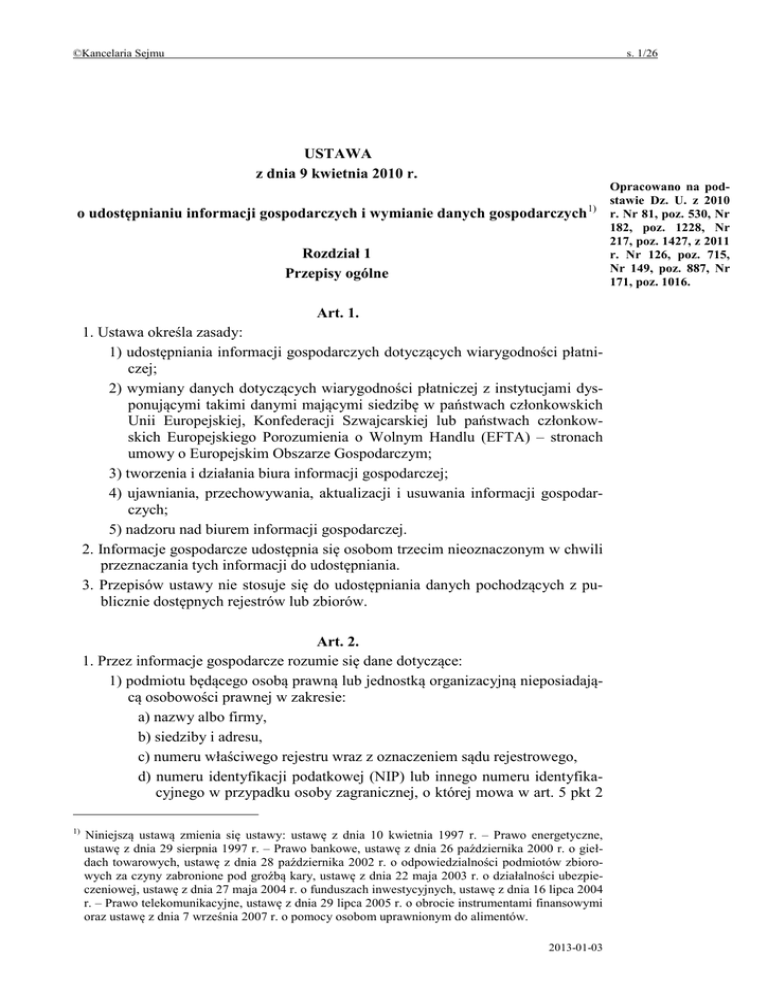 ©Kancelaria Sejmu s. 1/26 USTAWA z dnia 9 kwietnia 2010 r. o udostępnianiu informacji gospodarczych i wymianie danych gospodarczych 1) Rozdział 1 Przepisy ogólne Art. 1. 1. Ustawa określa zasady: 1) udostępniania informacji gospodarczych dotyczących wiarygodności płatniczej; 2) wymiany danych dotyczących wiarygodności płatniczej z instytucjami dysponującymi takimi danymi mającymi siedzibę w państwach członkowskich Unii Europejskiej, Konfederacji Szwajcarskiej lub państwach członkowskich Europejskiego Porozumienia o Wolnym Handlu (EFTA) – stronach umowy o Europejskim Obszarze Gospodarczym; 3) tworzenia i działania biura informacji gospodarczej; 4) ujawniania, przechowywania, aktualizacji i usuwania informacji gospodarczych; 5) nadzoru nad biurem informacji gospodarczej. 2. Informacje gospodarcze udostępnia się osobom trzecim nieoznaczonym w chwili przeznaczania tych informacji do udostępniania. 3. Przepisów ustawy nie stosuje się do udostępniania danych pochodzących z publicznie dostępnych rejestrów lub zbiorów. Art. 2. 1. Przez informacje gospodarcze rozumie się dane dotyczące: 1) podmiotu będącego osobą prawną lub jednostką organizacyjną nieposiadającą osobowości prawnej w zakresie: a) nazwy albo firmy, b) siedziby i adresu, c) numeru właściwego rejestru wraz z oznaczeniem sądu rejestrowego, d) numeru identyfikacji podatkowej (NIP) lub innego numeru identyfikacyjnego w przypadku osoby zagranicznej, o której mowa w art. 5 pkt 2 1) Niniejszą ustawą zmienia się ustawy: ustawę z dnia 10 kwietnia 1997 r. – Prawo energetyczne, ustawę z dnia 29 sierpnia 1997 r. – Prawo bankowe, ustawę z dnia 26 października 2000 r. o giełdach towarowych, ustawę z dnia 28 października 2002 r. o odpowiedzialności podmiotów zbiorowych za czyny zabronione pod groźbą kary, ustawę z dnia 22 maja 2003 r. o działalności ubezpieczeniowej, ustawę z dnia 27 maja 2004 r. o funduszach inwestycyjnych, ustawę z dnia 16 lipca 2004 r. – Prawo telekomunikacyjne, ustawę z dnia 29 lipca 2005 r. o obrocie instrumentami finansowymi oraz ustawę z dnia 7 września 2007 r. o pomocy osobom uprawnionym do alimentów. 2013-01-03 Opracowano na podstawie Dz. U. z 2010 r. Nr 81, poz. 530, Nr 182, poz. 1228, Nr 217, poz. 1427, z 2011 r. Nr 126, poz. 715, Nr 149, poz. 887, Nr 171, poz. 1016. ©Kancelaria Sejmu s. 2/26 lit. b i c ustawy z dnia 2 lipca 2004 r. o swobodzie działalności gospodarczej (Dz. U. z 2010 r. Nr 220, poz. 1447, z późn. zm. 2)), e) numeru identyfikacyjnego w krajowym rejestrze urzędowym podmiotów gospodarki narodowej, zwanego dalej „numerem REGON”, jeżeli został nadany, f) imion, nazwisk i numeru ewidencyjnego Powszechnego Elektronicznego Systemu Ewidencji Ludności, zwanego dalej „numerem PESEL”, lub innego numeru potwierdzającego tożsamość wspólników, osób wchodzących w skład organów zarządzających lub prokurentów, g) imion i nazwisk pełnomocników, o ile zostali ustanowieni, h) głównego przedmiotu wykonywanej działalności gospodarczej; 2) osoby fizycznej w zakresie: a) imion i nazwiska, b) adresu miejsca zamieszkania lub adresu do doręczeń, c) numeru PESEL lub innego numeru potwierdzającego tożsamość, d) serii i numeru dowodu osobistego lub innego dokumentu potwierdzającego tożsamość; 3) osoby fizycznej prowadzącej działalność gospodarczą w zakresie: a) imion i nazwiska, b) numeru PESEL lub innego numeru potwierdzającego tożsamość, c) serii i numeru dowodu osobistego lub innego dokumentu potwierdzającego tożsamość, d) firmy, e) oznaczenia miejsca zamieszkania i adresu do doręczeń lub adresu, pod którym jest wykonywana działalność gospodarcza, f) numeru identyfikacji podatkowej (NIP) lub innego numeru identyfikacyjnego w przypadku osoby zagranicznej, o której mowa w art. 5 pkt 2 lit. a ustawy z dnia 2 lipca 2004 r. o swobodzie działalności gospodarczej, g) numeru REGON, jeżeli został nadany, h) numeru właściwej ewidencji wraz z oznaczeniem organu ewidencyjnego lub numeru właściwego rejestru wraz z oznaczeniem sądu rejestrowego w przypadku osoby zagranicznej, o której mowa w art. 5 pkt 2 lit. a ustawy z dnia 2 lipca 2004 r. o swobodzie działalności gospodarczej, i) imion i nazwisk pełnomocników, o ile zostali ustanowieni, j) głównego przedmiotu wykonywanej działalności gospodarczej; 4) zobowiązania pieniężnego w zakresie: a) tytułu prawnego, b) kwoty i waluty, c) kwoty zaległości, d) daty powstania zaległości, e) informacji o postępowaniach dotyczących zobowiązania, 2) Zmiany tekstu jednolitego wymienionej ustawy zostały ogłoszone w Dz. U. z 2010 r. Nr 239, poz. 1593 oraz z 2011 r. Nr 85, poz. 459, Nr 106, poz. 622, Nr 112, poz. 654, Nr 120, poz. 690, Nr 131, poz. 764, Nr 132, poz. 766, Nr 153, poz. 902, Nr 163, poz. 981 i Nr 171, poz. 1016. 2013-01-03 ©Kancelaria Sejmu s. 3/26 f) informacji o kwestionowaniu przez dłużnika istnienia całości lub części zobowiązania, g) daty wysłania listem poleconym albo doręczenia dłużnikowi do rąk własnych wezwania do zapłaty, zawierającego ostrzeżenie o zamiarze przekazania danych do biura informacji gospodarczej, z podaniem firmy i adresu siedziby tego biura, h) informacji o zbyciu wierzytelności, i) innych informacji przekazanych w trybie i na zasadach określonych w art. 18; 5) posłużenia się podrobionym lub cudzym dokumentem w zakresie: a) nazwy dokumentu, b) serii i numeru dokumentu, c) daty wystawienia dokumentu, d) oznaczenia, siedziby i adresu podmiotu wskazanego w dokumencie jako jego wystawca, e) imion i nazwiska osoby, której dokument dotyczy, f) okoliczności posłużenia się dokumentem, g) wskazania osoby lub organu, który stwierdził, że dokument jest podrobiony lub cudzy. 2. Ilekroć w ustawie jest mowa o: 1) dłużniku – rozumie się przez to osobę fizyczną, w tym osobę fizyczną wykonującą działalność gospodarczą, osobę prawną lub jednostkę organizacyjną nieposiada