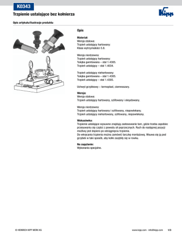 K0343 Trzpienie ustalające bez kołnierza Opis artykułu/ilustracje produktu Opis Materiał: Wersja stalowa: Trzpień ustalający hartowany: Klasa wytrzymałości 5.8. Wersja nierdzewna: Trzpień ustalający hartowany: Tulejka gwintowana – stal 1.4305. Trzpień ustalający – stal 1.4034. Trzpień ustalający niehartowany: Tulejka gwintowana – stal 1.4305. Trzpień ustalający – stal 1.4305. Uchwyt grzybkowy – termoplast, ciemnoszary. Wersja: Wersja stalowa: Trzpień ustalający hartowany, szlifowany i oksydowany. Wersja nierdzewna: Trzpień ustalający hartowany i szlifowany, niepowlekany. Trzpień ustalający niehartowany, szlifowany, niepowlekany. Wskazówka: Trzpienie ustalające wysuwne znajdują zastosowanie tam, gdzie trzeba zapobiec przesuwaniu się części z powodu sił poprzecznych. Ruch do następnej pozycji możliwy jest dopiero po odciągnięciu trzpienia. Do wkręcania trzpienia można zamówić tarczkę montażową. Wsuwa się ją pod grzybek w taki sposób, aby kołki zazębiły się w rowku. Na zapytanie: Wykonania specjalne. © HEINRICH KIPP WERK KG www.kipp.com · [email protected] 1/3 K0343 Trzpienie ustalające bez kołnierza Rysunki Trzpienie ustalające bez kołnierza, stal, trzpień hartowany Nr Zamówienia Forma G Nr Zamówienia Forma H D D1 D2 L K0343.1903 K0343.1004 K0343.1105 K0343.1206 K0343.1308 K0343.1410 K0343.1412 K0343.1516 K0343.2903 K0343.2004 K0343.2105 K0343.2206 K0343.2308 K0343.2410 K0343.2412 K0343.2516 3 4 5 6 8 10 12 16 M6x0,75 M8x1 M10x1 M12x1,5 M16x1,5 M20x1,5 M20x1,5 M24x2 14 18 21 25 33 33 33 40 31,5 38,5 43,5 51,7 68 74 78 96 L1 L2 17 21 24 28 36 40 42 50 11 13,5 14,5 17,7 24 24 24 30 H SW F x 30° 3,5 4 5 6 8 10 12 16 - / 10 - / 13 - / 17 - / 19 - / 24 - / 30 - / 30 - / 36 0,8 1,3 1,3 1,8 2,3 2,8 2,8 3,2 Siła sprężyny początek F1 ok. N 4,5 6 5 6 15 15 15 20 Siła sprężyny koniec F2 ok. N 10 12 12 14 35 34 39 46 Nr Zamówienia tarczka montażowa Siła sprężyny początek F1 ok. N 4,5 6 5 6 15 15 15 20 Siła sprężyny koniec F2 ok. N 10 12 12 14 35 34 39 46 Nr Zamówienia tarczka montażowa Siła sprężyny początek F1 ok. N 4,5 6 5 6 15 15 Siła sprężyny koniec F2 ok. N 10 12 12 14 35 34 Nr Zamówienia tarczka montażowa K0344.99 K0344.90 K0344.91 K0344.92 K0344.93 K0344.94 K0344.94 K0344.95 Trzpienie ustalające bez kołnierza, stal nierdzewna, trzpień hartowany Nr Zamówienia Forma G Nr Zamówienia Forma H D D1 D2 L K0343.01903 K0343.01004 K0343.01105 K0343.01206 K0343.01308 K0343.01410 K0343.01412 K0343.01516 K0343.02903 K0343.02004 K0343.02105 K0343.02206 K0343.02308 K0343.02410 K0343.02412 K0343.02516 3 4 5 6 8 10 12 16 M6x0,75 M8x1 M10x1 M12x1,5 M16x1,5 M20x1,5 M20x1,5 M24x2 14 18 21 25 33 33 33 40 31,5 38,5 43,5 51,7 68 74 78 96 L1 L2 17 21 24 28 36 40 42 50 11 13,5 14,5 17,7 24 24 24 30 H SW F x 30° 3,5 4 5 6 8 10 12 16 - / 10 - / 13 - / 17 - / 19 - / 24 - / 30 - / 30 - / 36 0,8 1,3 1,3 1,8 2,3 2,8 2,8 3,2 K0344.99 K0344.90 K0344.91 K0344.92 K0344.93 K0344.94 K0344.94 K0344.95 Trzpienie ustalające bez kołnierza, stal nierdzewna, trzpień niehartowany Nr Zamówienia Forma G Nr Zamówienia Forma H D D1 D2 L K0343.11903 K0343.11004 K0343.11105 K0343.11206 K0343.11308 K0343.11410 K0343.12903 K0343.12004 K0343.12105 K0343.12206 K0343.12308 K0343.12410 3 4 5 6 8 10 M6x0,75 M8x1 M10x1 M12x1,5 M16x1,5 M20x1,5 14 18 21 25 33 33 31,5 38,5 43,5 51,7 68 74 © HEINRICH KIPP WERK KG L1 L2 17 21 24 28 36 40 H SW 11 3,5 - / 10 13,5 4 - / 13 14,5 5 - / 17 17,7 6 - / 19 24 8 - / 24 24 10 - / 30 F x 30° 0,8 1,3 1,3 1,8 2,3 2,8 K0344.99 K0344.90 K0344.91 K0344.92 K0344.93 K0344.94 www.kipp.com · [email protected] 2/3 K0343 Trzpienie ustalające bez kołnierza Nr Zamówienia Forma G Nr Zamówienia Forma H K0343.11412 K0343.11516 K0343.12412 K0343.12516 © HEINRICH KIPP WERK KG D D1 12 M20x1,5 16 M24x2 D2 L L1 L2 33 40 78 42 24 96 50 30 H SW 12 - / 30 16 - / 36 F x 30° 2,8 3,2 Siła sprężyny początek F1 ok. N 15 20 Siła sprężyny koniec F2 ok. N 39 46 Nr Zamówienia tarczka montażowa K0344.94 K0344.95 www.kipp.com · [email protected] 3/3