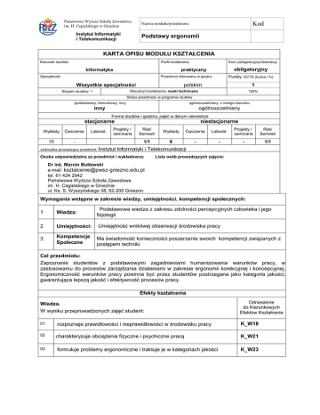 Państwowa Wyższa Szkoła Zawodowa im. H. Cegielskiego w Gnieźnie Instytut Informatyki i Telekomunikacji Nazwa modułu/przedmiotu Kod Podstawy ergonomii KARTA OPISU MODUŁU KSZTAŁCENIA Kierunek studiów Profil kształcenia Informatyka Kurs (obligatoryjny/obieralny) obligatoryjny praktyczny Specjalność Przedmiot oferowany w języku: Wszystkie specjalności Punkty ECTS (liczba i %) 1 polskim Obszar(y) kształcenia: nauki techniczne Stopień studiów: 1 100% Status przedmiotu w programie studiów (podstawowy, kierunkowy, inny ogólnouczelniany, z innego kierunku inny ogólnouczelniany Forma studiów i godziny zajęć w danym semestrze stacjonarne Wykłady Ćwiczenia 15 - Laborat. niestacjonarne Projekty / seminaria Jednostka prowadząca przedmiot: Instytut Rok/ Semestr Wykłady Ćwiczenia Laborat. Projekty / seminaria Rok/ Semestr 1/1 8 - - - 1/1 Informatyki i Telekomunikacji Osoba odpowiedzialna za przedmiot / wykładowca: Lista osób prowadzących zajęcia: Dr inż. Marcin Butlewski e-mail: [email protected] tel. 61 424 2942 Państwowa Wyższa Szkoła Zawodowa im. H. Cegielskiego w Gnieźnie ul. Ks. S. Wyszyńskiego 38, 62-200 Gniezno Wymagania wstępne w zakresie wiedzy, umiejętności, kompetencji społecznych: 1 Wiedza: Podstawowa wiedza z zakresu zdolności percepcyjnych człowieka i jego fizjologii 2 Umiejętności: Umiejętność wnikliwej obserwacji środowiska pracy 3 Kompetencje Społeczne Ma świadomość konieczności poszerzania swoich kompetencji związanych z postępem techniki Cel przedmiotu: Zapoznanie studentów z podstawowymi zagadnieniami humanizowania warunków pracy, w zastosowaniu do procesów zarządzania działaniami w zakresie ergonomii korekcyjnej i koncepcyjnej. Ergonomiczność warunków pracy powinna być przez studentów postrzegana jako kategoria jakości, gwarantująca lepszą jakość i efektywność procesów pracy. Efekty kształcenia Wiedza. W wyniku przeprowadzonych zajęć student: 01 02 03 Odniesienie do Kierunkowych Efektów Kształcenia rozpoznaje prawidłowości i nieprawidłowości w środowisku pracy K_W18 charakteryzuje obciążenia fizyczne i psychiczne pracą K_W21 formułuje problemy ergonomiczne i traktuje je w kategoriach jakości K_W23 Podstawy ergonomii Umiejętności. W wyniku przeprowadzonych zajęć student potrafi: 01 diagnozować zagrożenia środowiska pracy K_U17 02 proponować rozwiązania zmniejszające obciążenia fizyczne i psychiczne K_U18 03 uwzględnić kryteria ergonomiczne przy doborze urządzeń K_U17 Kompetencje społeczne. W wyniku przeprowadzonych zajęć student zdobędzie następujące kompetencje: 01 rozumie potrzebę permanentnego kształcenia się i przekazywania w sposób zrozumiały informacji z najbliższym otoczeniem w działalności zawodowej. K_K01 02 rozumie pozatechniczne ( w tym ekologiczne) skutki swojego działania i jego wpływu na środowisko, szczególnie w zakresie elektrotechniki. K_K02 potrafi zidentyfikować i ocenić skutki nieprawidłowości ergonomicznych K_K04 03 Sposoby sprawdzenia efektów kształcenia Wykład: Zaliczenie pisemne – pisemny opis wskazanego środowiska pracy i jego ergonomiczna analiza Studenci identyfikują zagrożenia dla wskazanego środowiska pracy i proponują rozwiązania zgodnie z uzyskana wiedzą w ramach przedmiotu. Treści programowe Geneza ergonomii na tle rozwoju techniki i nauki. Nauki składowe i charakter ergonomii. Ergonomia a bhp – aspekty ekonomiczne. System człowiek – obiekt techniczny i jego otoczenie. Interpretacja systemu jako stanowiska pracy. Cel i zakres działalności ergonomicznej. Współczesne nurty badań ergonomicznych. Metody diagnozowania ergonomicznego. Analiza fizycznych obciążeń pracą i gospodarka cieplna organizmu. Analiza obciążeń psychicznych związanych z pracą. Zasady optymalizacji obciążeń. Procesy percepcji i przetwarzania informacji. Zasady doboru urządzeń sygnalizacyjnych i sterowniczych. Kształtowanie parametrów przestrzennych stanowiska pracy oraz maszyn i narzędzi ręcznych w oparciu o dane antropometryczne. Ocena i kształtowanie środowiska pracy (drgania mechaniczne, hałas, mikroklimat, oświetlenie, promieniowanie szkodliwe, zanieczyszczenia powietrza). Zasady projektowania ergonomicznego. Przykłady ergonomicznego projektowania stanowisk: obróbczych, montażowych, dyspozytorskich, komputerowych. Ergonomia ludzi starszych i niepełnosprawnych. Literatura podstawowa: 1. Tytyk E., Projektowanie ergonomiczne. Wyd. Naukowe PWN, Warszawa-Poznań, 2001 2. Horst W. (red.), Ergonomia z elementami bezpieczeństwa pracy. Przewodnik do ćwiczeń laboratoryjnych. Wyd. Politechniki Poznańskiej, Poznań, 2006 Podstawy ergonomii Literatura uzupełniająca: 1. Górska E., Diagnoza ergonomiczna stanowisk pracy. Oficyna Wydawnicza Politechniki Warszawskiej, Warszawa, 1998 2. Jabłoński J. (red.), Ergonomia produktu. Ergonomiczne zasady projektowania produktów. Wyd. Politechniki Poznańskiej, Poznań, 2006 Obciążenie pracą studenta Studia stacjonarne forma aktywności niestacjonarne godziny ECTS godziny ECTS Łączny nakład pracy 1) 30 1 30 1 Zajęcia wymagające indywidualnego kontaktu z nauczycielem 2) 20 0,5 12 0,5 10 0,5 18 0,5 Zajęcia o charakterze praktycznym Praca własna studenta 4) 3) 1. łączne obciążenie studenta: sumaryczna liczba godzin oraz suma pkt. ECTS jest równa dla st. stacjonarnych i niestacjonarnych; 2. zajęcia dydaktyczne {w+c+L+p} + konsultacje +egzamin: dla stacjonarnych liczba godzin > 50 % godzin z poz1., dla niestacjonarnych liczba godzin < 50% z poz.1).; 3. Zajęcia laboratoryjne+przygotowanie do tych zajęć+opracowanie sprawozdań+zajęcia projektowe+przygotowanie do zajęć projektowych+konsulatcje w sprawie projektów+realizacja projektu; 4. Pozycje 2. i 4. dają w sumie liczbę godzin i pkt ECTS podaną w pozycji 1.