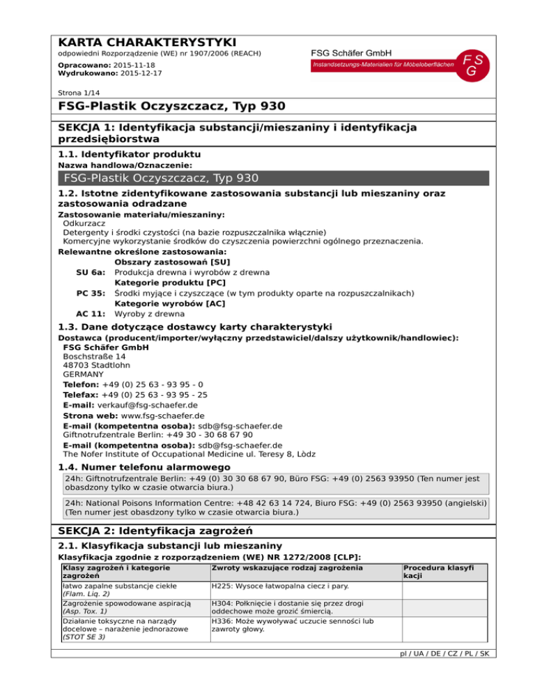 KARTA CHARAKTERYSTYKI odpowiedni Rozporządzenie (WE) nr 1907/2006 (REACH) Opracowano: 2015-11-18 Wydrukowano: 2015-12-17 Strona 1/14 FSG-Plastik Oczyszczacz, Typ 930 SEKCJA 1: Identyfikacja substancji/mieszaniny i identyfikacja przedsiębiorstwa 1.1. Identyfikator produktu Nazwa handlowa/Oznaczenie: FSG-Plastik Oczyszczacz, Typ 930 1.2. Istotne zidentyfikowane zastosowania substancji lub mieszaniny oraz zastosowania odradzane Zastosowanie materiału/mieszaniny: Odkurzacz Detergenty i środki czystości (na bazie rozpuszczalnika włącznie) Komercyjne wykorzystanie środków do czyszczenia powierzchni ogólnego przeznaczenia. Relewantne określone zastosowania: Obszary zastosowań [SU] SU 6a: Produkcja drewna i wyrobów z drewna Kategorie produktu [PC] PC 35: Środki myjące i czyszczące (w tym produkty oparte na rozpuszczalnikach) Kategorie wyrobów [AC] AC 11: Wyroby z drewna 1.3. Dane dotyczące dostawcy karty charakterystyki Dostawca (producent/importer/wyłączny przedstawiciel/dalszy użytkownik/handlowiec): FSG Schäfer GmbH Boschstraße 14 48703 Stadtlohn GERMANY Telefon: +49 (0) 25 63 - 93 95 - 0 Telefax: +49 (0) 25 63 - 93 95 - 25 E-mail: [email protected] Strona web: www.fsg-schaefer.de E-mail (kompetentna osoba): [email protected] Giftnotrufzentrale Berlin: +49 30 - 30 68 67 90 E-mail (kompetentna osoba): [email protected] The Nofer Institute of Occupational Medicine ul. Teresy 8, Lòdz 1.4. Numer telefonu alarmowego 24h: Giftnotrufzentrale Berlin: +49 (0) 30 30 68 67 90, Büro FSG: +49 (0) 2563 93950 (Ten numer jest obasdzony tylko w czasie otwarcia biura.) 24h: National Poisons Information Centre: +48 42 63 14 724, Biuro FSG: +49 (0) 2563 93950 (angielski) (Ten numer jest obasdzony tylko w czasie otwarcia biura.) SEKCJA 2: Identyfikacja zagrożeń 2.1. Klasyfikacja substancji lub mieszaniny Klasyfikacja zgodnie z rozporządzeniem (WE) NR 1272/2008 [CLP]: Klasy zagrożeń i kategorie zagrożeń łatwo zapalne substancje ciekłe (Flam. Liq. 2) Zagrożenie spowodowane aspiracją (Asp. Tox. 1) Działanie toksyczne na narządy docelowe – narażenie jednorazowe (STOT SE 3) Zwroty wskazujące rodzaj zagrożenia H225: Wysoce łatwopalna ciecz i pary. Procedura klasyfi kacji H304: Połknięcie i dostanie się przez drogi oddechowe może grozić śmiercią. H336: Może wywoływać uczucie senności lub zawroty głowy. pl / UA / DE / CZ / PL / SK KARTA CHARAKTERYSTYKI odpowiedni Rozporządzenie (WE) nr 1907/2006 (REACH) Opracowano: 2015-11-18 Wydrukowano: 2015-12-17 Strona 2/14 FSG-Plastik Oczyszczacz, Typ 930 Klasy zagrożeń i kategorie zagrożeń Niebezpieczne dla środowiska wodnego (Aquatic Chronic 2) Zwroty wskazujące rodzaj zagrożenia H411: Działa toksycznie na organizmy wodne, powodując długotrwałe skutki. Procedura klasyfi kacji 2.2. Elementy oznakowania Oznakowanie zgodnie z rozporządzeniem (WE) nr. 1272/2008 [CLP] Piktogramy zagrożeń: GHS02 GHS07 Płomień Wykrzyknik GHS08 Zagrożenie dla zdrowia GHS09 Środowisko Hasło ostrzegawcze: Niebezpieczeństwo Wskazówki zagrożeń dla niebezpieczeństw fizycznych H225 Wysoce łatwopalna ciecz i pary. Wskazówki zagrożeń dla niebezpieczeń zdrowotnych H304 H336 Połknięcie i dostanie się przez drogi oddechowe może grozić śmiercią. Może wywoływać uczucie senności lub zawroty głowy. wskazówki zagrożeń dla niebezpieczeństw środowiskowych H411 Działa toksycznie na organizmy wodne, powodując długotrwałe skutki. Uzupełniające cechy zagrożeń (UE): Zwroty wskazujące środki ostrożności Prewencja P210 P242 P261 P273 P280 Przechowywać z dala od źródeł ciepła, gorących powierzchni, źródeł iskrzenia, otwartego ogn ia i innych źródeł zapłonu. Nie palić. Używać wyłącznie nieiskrzących narzędzi. Unikać wdychania pyłu/dymu/gazu/mgły/par/rozpylonej cieczy. Unikać uwolnienia do środowiska. Stosować rękawice ochronne/odzież ochronną/ochronę oczu/ochronę twarzy. Zwroty wskazujące środki ostrożności Reakcja P301 + P310 P304 + P340 P312 W PRZYPADKU POŁKNIĘCIA: Natychmiast skontaktować się z OŚRODKIEM ZATRUĆ/lekarze m/.... W PRZYPADKU DOSTANIA SIĘ DO DRÓG ODDECHOWYCH: wyprowadzić lub wynieść poszkodo wanego na świeże powietrze i zapewnić mu warunki do swobodnego oddychania. W przypadku złego samopoczucia skontaktować się z OŚRODKIEM ZATRUĆ/lekarzem/.... Szczególne zasady dotyczące uzupelniajacych elementów etykiety dla niektrórych mieszanin: 0,4 % procent mieszaniny stanowi(ą) składnik(i) o nieznanej toksyczności., 0,4 % procent mieszaniny składa się ze składników o nieznanym zagrożeniu dla zbiorników wodnych. 2.3. Inne zagrożenia Brak danych SEKCJA 3: Skład/ informacja o składnikach 3.2. Mieszaniny Opis: Mieszanka z następujących substancji wymienionych z dodatków innych niż niebezpieczne pl / UA / DE / CZ / PL / SK KARTA CHARAKTERYSTYKI odpowiedni Rozporządzenie (WE) nr 1907/2006 (REACH) Opracowano: 2015-11-18 Wydrukowano: 2015-12-17 Strona 3/14 FSG-Plastik Oczyszczacz, Typ 930 Składniki niebezpieczne / Niebezpieczne zanieczyszczenia / Stabilizatory: Identyfikatory produk tu nr. CAS: 64742-49-0 WE-nr.: 920-750-0 Nr REACH: 01-2119473851-33-0XXX nr. CAS: 64742-82-1 WE-nr.: 927-241-2 Nr REACH: 01-2119471843-32-0000 nr. CAS: 78-93-3 WE-nr.: 201-159-0 Nr. INDEXu: 606-002-00-3 Nazwa substancji Klasyfikacja zgodnie z rozporządzeniem (WE) NR 1272/2008 [CLP] Hydrocarbons, C7-C9, n-alkanes, isoalkanes, cyclics STOT SE 3, Flam. Liq. 2, Asp. Tox. 1, Aquatic Chronic 2 6 Niebezpieczeństwo H225-H304-H336-H411-EUH06 Stężenie 30 – 50 C. % Hydrocarbons, C9-C10, containing n-alkanes, isoalkanes, cyc lics, with <2% aromatics STOT SE 3, Flam. Liq. 3, Asp. Tox. 1, Aquatic Chronic 3 6 – 10 C. % Methylethylketon STOT SE 3, Flam. Liq. 2, Eye Irrit. 2 0–2 C. % Niebezpieczeństwo H226-H304-H336-H412-EUH066 Niebezpieczeństwo H225-H319-H336-EUH066 Wydźwięk zdań H- i EUH: patrz sekcja 16. SEKCJA 4: Środki pierwszej pomocy 4.1. Opis środków pierwszej