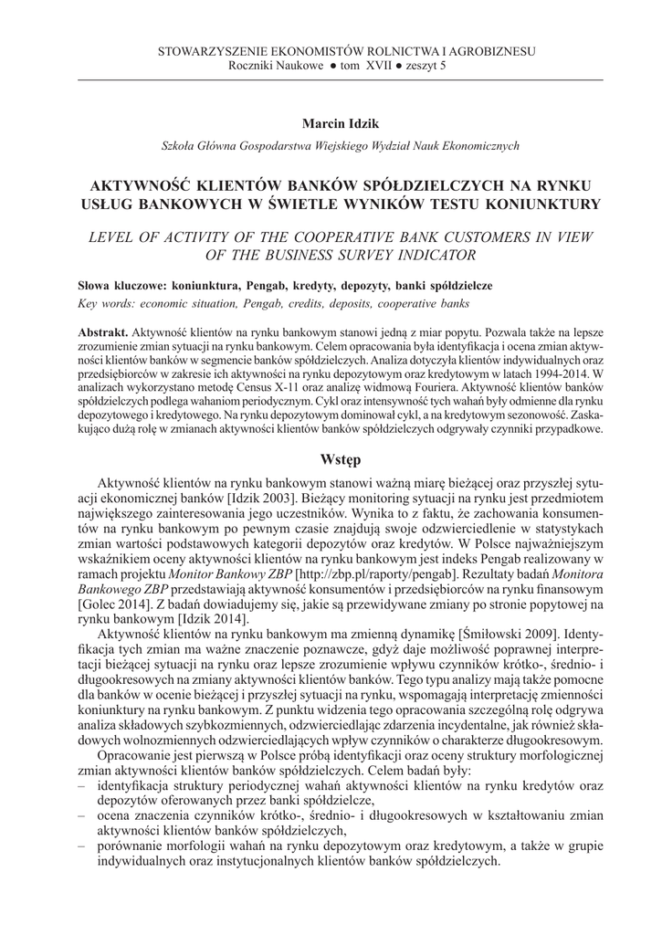EKONOMISTÓW I AGROBIZNESU AktywnośćSTOWARZYSZENIE klientów banków spółdzielczych na rynkuROLNICTWA usług bankowych w świetle wyników... Roczniki Naukowe ● tom XVII ● zeszyt 5 65 Marcin Idzik Szkoła Główna Gospodarstwa Wiejskiego Wydział Nauk Ekonomicznych AKTYWNOŚĆ KLIENTÓW BANKÓW SPÓŁDZIELCZYCH NA RYNKU USŁUG BANKOWYCH W ŚWIETLE WYNIKÓW TESTU KONIUNKTURY LEVEL OF ACTIVITY OF THE COOPERATIVE BANK CUSTOMERS IN VIEW OF THE BUSINESS SURVEY INDICATOR Słowa kluczowe: koniunktura, Pengab, kredyty, depozyty, banki spółdzielcze Key words: economic situation, Pengab, credits, deposits, cooperative banks Abstrakt. Aktywność klientów na rynku bankowym stanowi jedną z miar popytu. Pozwala także na lepsze zrozumienie zmian sytuacji na rynku bankowym. Celem opracowania była identyfikacja i ocena zmian aktywności klientów banków w segmencie banków spółdzielczych. Analiza dotyczyła klientów indywidualnych oraz przedsiębiorców w zakresie ich aktywności na rynku depozytowym oraz kredytowym w latach 1994-2014. W analizach wykorzystano metodę Census X-11 oraz analizę widmową Fouriera. Aktywność klientów banków spółdzielczych podlega wahaniom periodycznym. Cykl oraz intensywność tych wahań były odmienne dla rynku depozytowego i kredytowego. Na rynku depozytowym dominował cykl, a na kredytowym sezonowość. Zaskakująco dużą rolę w zmianach aktywności klientów banków spółdzielczych odgrywały czynniki przypadkowe. Wstęp Aktywność klientów na rynku bankowym stanowi ważną miarę bieżącej oraz przyszłej sytuacji ekonomicznej banków [Idzik 2003]. Bieżący monitoring sytuacji na rynku jest przedmiotem największego zainteresowania jego uczestników. Wynika to z faktu, że zachowania konsumentów na rynku bankowym po pewnym czasie znajdują swoje odzwierciedlenie w statystykach zmian wartości podstawowych kategorii depozytów oraz kredytów. W Polsce najważniejszym wskaźnikiem oceny aktywności klientów na rynku bankowym jest indeks Pengab realizowany w ramach projektu Monitor Bankowy ZBP [http://zbp.pl/raporty/pengab]. Rezultaty badań Monitora Bankowego ZBP przedstawiają aktywność konsumentów i przedsiębiorców na rynku finansowym [Golec 2014]. Z badań dowiadujemy się, jakie są przewidywane zmiany po stronie popytowej na rynku bankowym [Idzik 2014]. Aktywność klientów na rynku bankowym ma zmienną dynamikę [Śmiłowski 2009]. Identyfikacja tych zmian ma ważne znaczenie poznawcze, gdyż daje możliwość poprawnej interpretacji bieżącej sytuacji na rynku oraz lepsze zrozumienie wpływu czynników krótko-, średnio- i długookresowych na zmiany aktywności klientów banków. Tego typu analizy mają także pomocne dla banków w ocenie bieżącej i przyszłej sytuacji na rynku, wspomagają interpretację zmienności koniunktury na rynku bankowym. Z punktu widzenia tego opracowania szczególną rolę odgrywa analiza składowych szybkozmiennych, odzwierciedlając zdarzenia incydentalne, jak również składowych wolnozmiennych odzwierciedlających wpływ czynników o charakterze długookresowym. Opracowanie jest pierwszą w Polsce próbą identyfikacji oraz oceny struktury morfologicznej zmian aktywności klientów banków spółdzielczych. Celem badań były: –– identyfikacja struktury periodycznej wahań aktywności klientów na rynku kredytów oraz depozytów oferowanych przez banki spółdzielcze, –– ocena znaczenia czynników krótko-, średnio- i długookresowych w kształtowaniu zmian aktywności klientów banków spółdzielczych, –– porównanie morfologii wahań na rynku depozytowym oraz kredytowym, a także w grupie indywidualnych oraz instytucjonalnych klientów banków spółdzielczych. 66 Marcin Idzik Materiał i metodyka badań Bazę danych empirycznych stanowią wyniki projektu badań koniunktury metodą testu koniunktury w placówkach bankowych pt. Monitor Bankowy, prowadzonego we współpracy ze Związkiem Banków Polskich. Podmiot badań stanowiła panelowa próba placówek banków spółdzielczych. Okres analizy obejmował lata 1993-2014, łącznie 252 miesięczne obserwacje. Baza danych empirycznych w postaci szeregów czasowych została zbudowana na podstawie comiesięcznych sondaży realizowanych metodą panelu i techniką wywiadu telefonicznego wspomaganego komputerowo. W każdym miesiącu w badaniu uczestniczyła grupa 200 placówek bankowych zlokalizowanych na terenie całego kraju, w tym jedna czwarta to placówki banków spółdzielczych. Przedmiot badań stanowiły oceny dotyczące: zmian w zakresie depozytów złotowych bieżących i terminowych w podziale na gospodarstwa domowe oraz podmioty gospodarcze, zmian w zakresie kredytów złotowych w podziale na osoby prywatne i podmioty gospodarcze. W badaniach oceny formułowane były przez stwierdzenie, że wystąpił wzrost, spadek, albo brak zmiany. Celem ujawnienia struktury periodycznej szeregów czasowych zastosowano analizę widmową Fouriera. Metoda ta stanowi podstawę do wnioskowania, o okresowości o danej częstotliwości bez zakładania a priori określonej długości wahań [Łuczyński, Matkowski 1997]. Model analizy widmowej sprowadza się do regresji wielokrotnej, w której zmienną zależną jest obserwowany szereg czasowy, a zmiennymi niezależnymi są funkcje sinus i cosinus o wszystkich możliwych częstotliwościach. Opis metody można znaleźć w pracach Talaga i Zielińskiego [1986], Shumway [1988], Drosiewicz i Michalskiego [1996] oraz Radzikowskiej [1999]. W efekcie analizy otrzymujemy wartości periodogramu, które reprezentują wariancję wahań o konkretnej częstotliwości lub okresie. Testując rozkład wartości periodogramu pod względem rozkładu wykładniczego, można sprawdzić, czy szereg wejściowy różni się od białego szumu. W opracowaniu funkcję gęstości spektralnej wyznaczono z danych po wyeliminowaniu trendu oraz średniej1. Analizę oparto na wynikach uzyskanych za pomocą okna Parzena