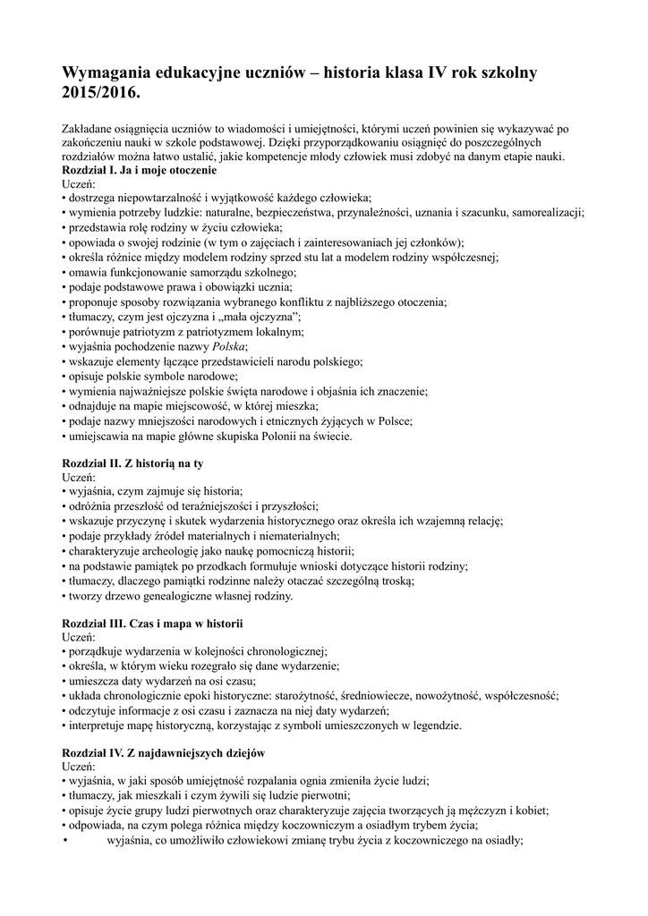 Wymagania edukacyjne uczniów – historia klasa IV rok szkolny 2015/2016. Zakładane osiągnięcia uczniów to wiadomości i umiejętności, którymi uczeń powinien się wykazywać po zakończeniu nauki w szkole podstawowej. Dzięki przyporządkowaniu osiągnięć do poszczególnych rozdziałów można łatwo ustalić, jakie kompetencje młody człowiek musi zdobyć na danym etapie nauki. Rozdział I. Ja i moje otoczenie Uczeń: • dostrzega niepowtarzalność i wyjątkowość każdego człowieka; • wymienia potrzeby ludzkie: naturalne, bezpieczeństwa, przynależności, uznania i szacunku, samorealizacji; • przedstawia rolę rodziny w życiu człowieka; • opowiada o swojej rodzinie (w tym o zajęciach i zainteresowaniach jej członków); • określa różnice między modelem rodziny sprzed stu lat a modelem rodziny współczesnej; • omawia funkcjonowanie samorządu szkolnego; • podaje podstawowe prawa i obowiązki ucznia; • proponuje sposoby rozwiązania wybranego konfliktu z najbliższego otoczenia; • tłumaczy, czym jest ojczyzna i „mała ojczyzna”; • porównuje patriotyzm z patriotyzmem lokalnym; • wyjaśnia pochodzenie nazwy Polska; • wskazuje elementy łączące przedstawicieli narodu polskiego; • opisuje polskie symbole narodowe; • wymienia najważniejsze polskie święta narodowe i objaśnia ich znaczenie; • odnajduje na mapie miejscowość, w której mieszka; • podaje nazwy mniejszości narodowych i etnicznych żyjących w Polsce; • umiejscawia na mapie główne skupiska Polonii na świecie. Rozdział II. Z historią na ty Uczeń: • wyjaśnia, czym zajmuje się historia; • odróżnia przeszłość od teraźniejszości i przyszłości; • wskazuje przyczynę i skutek wydarzenia historycznego oraz określa ich wzajemną relację; • podaje przykłady źródeł materialnych i niematerialnych; • charakteryzuje archeologię jako naukę pomocniczą historii; • na podstawie pamiątek po przodkach formułuje wnioski dotyczące historii rodziny; • tłumaczy, dlaczego pamiątki rodzinne należy otaczać szczególną troską; • tworzy drzewo genealogiczne własnej rodziny. Rozdział III. Czas i mapa w historii Uczeń: • porządkuje wydarzenia w kolejności chronologicznej; • określa, w którym wieku rozegrało się dane wydarzenie; • umieszcza daty wydarzeń na osi czasu; • układa chronologicznie epoki historyczne: starożytność, średniowiecze, nowożytność, współczesność; • odczytuje informacje z osi czasu i zaznacza na niej daty wydarzeń; • interpretuje mapę historyczną, korzystając z symboli umieszczonych w legendzie. Rozdział IV. Z najdawniejszych dziejów Uczeń: • wyjaśnia, w jaki sposób umiejętność rozpalania ognia zmieniła życie ludzi; • tłumaczy, jak mieszkali i czym żywili się ludzie pierwotni; • opisuje życie grupy ludzi pierwotnych oraz charakteryzuje zajęcia tworzących ją mężczyzn i kobiet; • odpowiada, na czym polega różnica między koczowniczym a osiadłym trybem życia; • wyjaśnia, co umożliwiło człowiekowi zmianę trybu życia z koczowniczego na osiadły; • wymienia pierwsze narzędzia i rodzaje broni oraz określa, z czego były wykonane; • odnajduje na mapie Mezopotamię, Tygrys, Eufrat, Nil i Egipt; • nazywa najważniejsze osiągnięcia cywilizacyjne ludów Mezopotamii; • tłumaczy, w jaki sposób zorganizowane było państwo faraonów; • wymienia różne rodzaje pisma; • określa, dlaczego wynalezienie pisma miało przełomowe znaczenie dla rozwoju cywilizacji. Rozdział V. W starożytnej Grecji Uczeń: • wskazuje na mapie starożytną Grecję; • wymienia najważniejsze zajęcia Greków; • odnajduje Ateny na mapie starożytnej Grecji; • wyjaśnia, na czym polegała demokracja ateńska; • tłumaczy, czym rożni się tragedia od komedii; • nazywa najważniejszych greckich bogów; • opowiada, jak starożytni Grecy wyobrażali sobie bogów; • wyjaśnia, czym były mity i jaką rolę odgrywały w życiu Greków; • opisuje przebieg starożytnych igrzysk olimpijskich; • porównuje igrzyska antyczne ze współczesnymi olimpiadami. Rozdział VI. W starożytnym Rzymie Uczeń: • wskazuje na mapie Italię i Rzym; • charakteryzuje ustrój republiki rzymskiej; • opowiada, w jaki sposób powstało Imperium Rzymskie; • opisuje wyposażenie rzymskiego legionisty; • prezentuje najważniejsze osiągnięcia Rzymian; • wyjaśnia, co oznacza powiedzenie: „Wszystkie drogi prowadzą do Rzymu”; • tłumaczy, jakie znaczenie miało prawo rzymskie w starożytności i jaką rolę odgrywa współcześnie; • omawia główne założenia religii chrześcijańskiej. Rozdział VII. Polska pierwszych Piastów Uczeń: • nazywa plemiona polskie i wskazuje na mapie zamieszkiwane przez nie tereny; • omawia genezę państwa polskiego; • wyjaśnia, jakie korzyści uzyskała Polska w wyniku przyjęcia chrześcijaństwa; • charakteryzuje postać świętego Wojciecha; • wymienia postanowienia zjazdu gnieźnieńskiego; • określa, kto i kiedy został pierwszym królem Polski; • wylicza osiągnięcia Bolesława Chrobrego. Rozdział VIII. Społeczeństwo średniowiecza Uczeń: • określa, jaką rolę odgrywał Kościół w średniowiecznym społeczeństwie; • porównuje styl romański ze stylem gotyckim; • opisuje wygląd zamku oraz funkcje jego poszczególnych elementów; • wymienia elementy rycerskiego uzbrojenia; • omawia kolejne etapy w karierze rycerza; • charakteryzuje wygląd średniowiecznego miasta; • wskazuje różnice między miastem a wsią w okresie średniowiecza – z uwzględnieniem charakteru zabudowy oraz zajęć mieszkańców. Rozdział IX. Polska i Krzyżacy Uczeń: • odnajduje na mapie państwo krzyżackie, Pomorze Gdańskie, Grunwald i Malbork; • podaje przyczyny sprowadzenia Krzyżaków do Polski; • omawia panowanie Władysława Łokietka i określa jego rolę w zjednoczeniu państwa polskiego; • 