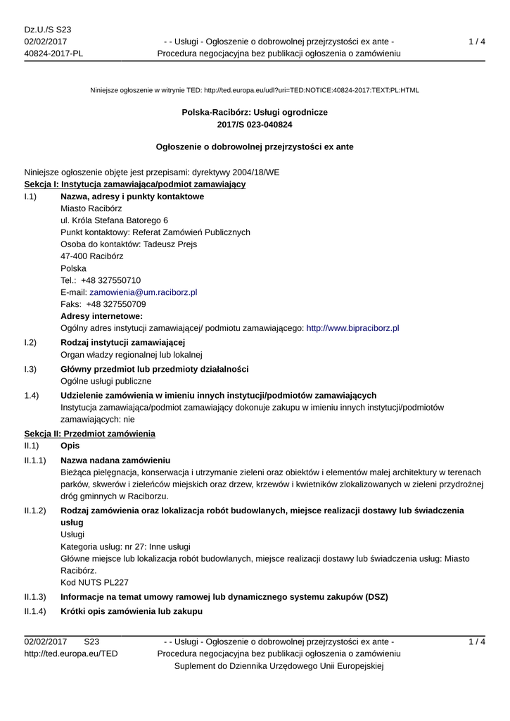 Dz.U./S S23 02/02/2017 40824-2017-PL - - Usługi - Ogłoszenie o dobrowolnej przejrzystości ex ante Procedura negocjacyjna bez publikacji ogłoszenia o zamówieniu 1/4 Niniejsze ogłoszenie w witrynie TED: http://ted.europa.eu/udl?uri=TED:NOTICE:40824-2017:TEXT:PL:HTML Polska-Racibórz: Usługi ogrodnicze 2017/S 023-040824 Ogłoszenie o dobrowolnej przejrzystości ex ante Niniejsze ogłoszenie objęte jest przepisami: dyrektywy 2004/18/WE Sekcja I: Instytucja zamawiająca/podmiot zamawiający I.1) Nazwa, adresy i punkty kontaktowe Miasto Racibórz ul. Króla Stefana Batorego 6 Punkt kontaktowy: Referat Zamówień Publicznych Osoba do kontaktów: Tadeusz Prejs 47-400 Racibórz Polska Tel.: +48 327550710 E-mail: [email protected] Faks: +48 327550709 Adresy internetowe: Ogólny adres instytucji zamawiającej/ podmiotu zamawiającego: http://www.bipraciborz.pl I.2) Rodzaj instytucji zamawiającej Organ władzy regionalnej lub lokalnej I.3) Główny przedmiot lub przedmioty działalności Ogólne usługi publiczne 1.4) Udzielenie zamówienia w imieniu innych instytucji/podmiotów zamawiających Instytucja zamawiająca/podmiot zamawiający dokonuje zakupu w imieniu innych instytucji/podmiotów zamawiających: nie Sekcja II: Przedmiot zamówienia II.1) Opis II.1.1) Nazwa nadana zamówieniu Bieżąca pielęgnacja, konserwacja i utrzymanie zieleni oraz obiektów i elementów małej architektury w terenach parków, skwerów i zieleńców miejskich oraz drzew, krzewów i kwietników zlokalizowanych w zieleni przydrożnej dróg gminnych w Raciborzu. II.1.2) Rodzaj zamówienia oraz lokalizacja robót budowlanych, miejsce realizacji dostawy lub świadczenia usług Usługi Kategoria usług: nr 27: Inne usługi Główne miejsce lub lokalizacja robót budowlanych, miejsce realizacji dostawy lub świadczenia usług: Miasto Racibórz. Kod NUTS PL227 II.1.3) Informacje na temat umowy ramowej lub dynamicznego systemu zakupów (DSZ) II.1.4) Krótki opis zamówienia lub zakupu 02/02/2017 S23 http://ted.europa.eu/TED - - Usługi - Ogłoszenie o dobrowolnej przejrzystości ex ante Procedura negocjacyjna bez publikacji ogłoszenia o zamówieniu Suplement do Dziennika Urzędowego Unii Europejskiej 1/4 Dz.U./S S23 02/02/2017 40824-2017-PL - - Usługi - Ogłoszenie o dobrowolnej przejrzystości ex ante Procedura negocjacyjna bez publikacji ogłoszenia o zamówieniu 2/4 Przedmiotem zamówienia jest utrzymanie w prawidłowym stanie zdrowotnym, technicznym i dobrej estetyce zieleni i elementów wyposażenia miejskich parków, skwerów i zieleńców oraz zieleni przydrożnej w postaci drzew, krzewów i kwietników zlokalizowanych na przedmiotowych terenach. W zakresie prac ujęto również koszenia trawników w pasach zieleni przydrożnej, na terenach parków, skwerów i zieleńców miejskich, na terenie działek – nieużytków oraz na terenach wybiegu i toalety dla psów. 1. Przedmiot zamówienia objęty zamówieniem i planowany zakres prac polegał będzie między innymi na: 1) zakładaniu nowych trawników oraz ich pielęgnacji; 2) bieżącej pielęgnacji kwietników z roślinami wieloletnimi (krzewy, byliny, pnącza); 3) zakładaniu i bieżącej pielęgnacji kwietników sezonowych wiosennych i letnich na terenie płaskim, w kasetonach, donicach i wazach obejmującym dostawy roślin, aranżację kwietnika, sadzenie roślin, pielęgnację w okresie wegetacyjnym i likwidacji po sezonie; 4) pielęgnacji drzew w różnym wieku; 5) pielęgnacji krzewów w postaci żywopłotów, skupisk i soliterów; 6) usuwaniu drzew i krzewów; 7) dostawach, sadzeniu i pielęgnacjach młodych drzew i krzewów; 8) bieżącej konserwacji i utrzymaniu terenów, obiektów i urządzeń w tym placów zabaw, muszli koncertowej, stawu parkowego, 4 fontann i 1 zdroju ulicznego; 9) drobnych usługach remontowych elementów małej architektury (alejek, chodników, schodów, obrzeży itp.), naprawach i konserwacji ławek i siedzisk; 10) dostawie i zastosowaniu materiałów niezbędnych do realizacji zadań objętych zamówieniem; 11) ochronie roślin poprzez zwalczanie chorób, szkodników i pasożytów; 12) dostarczeniu odpadu wytworzonego w toku prowadzonych prac (za potwierdzeniem, które stanowi karta przekazania odpadu) do właściwej, najbliższej miejsca pozyskania odpadu instalacji w tym organicznych na Kompostownię Miejską w Raciborzu a odpadów nieorganicznych do Zakładu Zagospodarowania Odpadów lub w przypadku gdy odbiór tych odpadów przez wymienione wyżej zakłady niemożliwy, do innych instalacji przyjmujących i utylizujących tego typu odpady i najbliższych Raciborza; 13) wykaszaniu mechanicznym silnie zachwaszczonych powierzchni oraz nieużytków wg wskazań Zamawiającego; 14) koszeniu powierzchni trawnikowych na terenie płaskim oraz na skarpach i rowach wg wskazań Zamawiającego; 15) koszeniu powierzchni trawnikowych zieleni miejskiej na terenie płaskim oraz na skarpach wg harmonogramu; 16) koszeniu powierzchni trawnikowych działek-nieużytków wg wskazań Zamawiającego; 17) koszeniu powierzchni trawnikowych wybiegu dla psów i toalety dla psów. II.1.5) Wspólny Słownik Zamówień (CPV) 77300000, 77313000, 77310000, 77314000, 77314100, 50870000, 90511000 II.6) Informacje na temat Porozumienia w sprawie zamówień rządowych (GPA) Zamówienie jest objęte Porozumieniem w sprawie zamówień rządowych (GPA): nie II.2) Całkowita końcowa wartość zamówienia (zamówień) II.2.1) Całkowita końcowa wartość zamówienia (zamówień) Sekcja IV: Procedura IV.1) Rodzaj procedury Negocjacyjna bez publikacji ogłoszenia o zamówieniu/uprzedniego ogłoszenia 02/02/2017 S23 http://ted.europa.eu/TED - - Usługi - Ogłoszenie o dobrowolnej przejrzystości ex ante Procedura negocjacyjna bez publikacji ogłoszenia o zamówieniu Suplement do Dziennika Urzędowego Unii Europejskiej 2/4 Dz.U./S S23 02/02/2017 40824-2017-PL - - Usługi - Ogłoszenie o dobrowolnej przejrzystości ex ante Procedura negocjacyjna bez publikacji ogło