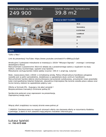 MIESZKANIE na SPRZEDAŻ 249 900 Gdańsk, Kiełpinek, Sympatyczna 39.8 m2 74023/3877/OMS 39.8 Secondary 6 279 PLN LowBlock 2010 2 4 2 Opis Tylko u Nas ! Link do prezentacji YouTube: https://www.youtube.com/watch?v=BNfuyy2x3p0 Atrakcyjne 2 pokojowe mieszkanie w inwestycji z 2010r "Wiszące Ogrody" - znanego i cenionego dewelopera Hossa Nieruchomość o powierzchni 39,8 m2 składa się z przestronnego salonu z wyjściem na duży balkon, aneksu kuchennego, sypialni oraz łazienki. Mieszkanie cechują bardzo niskie opłaty (czynsz: 150 zł + prąd wg. zużycia) Niski, nowoczesny blok z 2010r z cichobieżną windą. Pełna infrastruktura handlowo-usługowa (osiedle jest w pełni samodzielne, dodatkowo w sąsiedztwie duże centrum handlowe). Nieruchomość bardzo dobrze skomunikowana (przystanek autobusowy, przystanek nowo powstałej kolei metropolitalnej Gdańsk Kiełpinek, obwodnica trójmiejska) Na terenie osiedla place zabaw oraz liczne tereny zielone (w sąsiedztwie piękny Las) Oferta w formule 0% - Kupujący nie płaci prowizji ! Bezpieczeństwo transakcji chronione polisą OC Serdecznie polecam oraz zapraszam na prezentację. Zaproponuj swoją cenę ! Więcej ofert znajdziesz na naszej stronie www.polnoc.pl * UWAGA! Zamieszczone na naszych stronach oferty nie stanowią oferty w rozumieniu Kodeksu Cywilnego, a dane w nich zawarte mają jedynie charakter informacyjny. Łukasz Igielski tel. 793-973-999 PÓŁNOC Nieruchomości - ogólnopolska sieć biur nieruchomości www.polnoc.pl email: [email protected] PÓŁNOC Nieruchomości - ogólnopolska sieć biur nieruchomości www.polnoc.pl Powered by TCPDF (www.tcpdf.org)