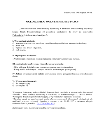 Siedlce, dnia 29 listopada 2016 r. OGŁOSZENIE O WOLNYM MIEJSCU PRACY „Dom nad Stawami” Dom Pomocy Społecznej w Siedlcach zlokalizowany przy ulicy księcia Józefa Poniatowskiego 32 poszukuje kandydatów do pracy na stanowisku Pielęgniarki. Liczba wolnych miejsc: 3. I. Warunki zatrudnienia: a) umowa o pracę na czas określony z możliwością przedłużenia na czas nieokreślony, b) pełen etat, c) wymiar czas pracy: 12 godzin, d) ruch ciągły, II. Wymagania niezbędne: 1.Wykształcenie minimum średnie medyczne z prawem wykonywania zawodu. III. Umiejętności preferowane i dodatkowe uprawnienia: 1.Mile widziane doświadczenie zawodowe w pracy na w/w stanowisku. 2.Kursy opieki nad chorymi i starymi ludźmi o problematyce geriatrycznej. IV. Zakres wykonywanych zadań: sprawowanie opieki pielęgniarskiej nad mieszkańcami domu, V. Wymagane dokumenty: a) list motywacyjny, b) życiorys (CV) Wymagane dokumenty należy składać listownie bądź osobiście w sekretariacie „Domu nad Stawami” Domu Pomocy Społecznej w Siedlcach, ul. Poniatowskiego 32, 08-110 Siedlce. Wymagane dokumenty: list motywacyjny, CV powinny być opatrzone klauzulą: "Wyrażam zgodę na przetwarzanie moich danych osobowych dla potrzeb niezbędnych do realizacji procesu rekrutacji (zgodnie z ustawą z dn. 29.08.1997 o ochronie danych osobowych (tekst jednolity : Dz.U. 2016 Poz. 922). Zastrzegamy sobie możliwość kontaktu z wybranymi osobami.