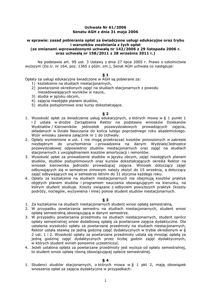 Uchwała Nr 61/2006 Senatu AGH z dnia 31 maja 2006 w sprawie: zasad pobierania opłat za świadczone usługi edukacyjne oraz trybu i warunków zwalniania z tych opłat (ze zmianami wprowadzonymi uchwałą nr 142/2006 z 29 listopada 2006 r. oraz uchwałą nr 158/2011 z 28 września 2011 r.) Na podstawie art. 99 ust. 3 Ustawy z dnia 27 lipca 2005 r. Prawo o szkolnictwie wyższym (Dz.U. nr 164, poz. 1365 z późn. zm.), Senat AGH uchwala co następuje: §1 Opłaty za usługi edukacyjne świadczone w AGH są pobierane za: 1) kształcenie na studiach niestacjonarnych, 2) powtarzanie określonych zajęć na studiach stacjonarnych z powodu niezadowalających wyników w nauce, 3) studia w języku obcym, 4) zajęcia nieobjęte planem studiów, 5) studia podyplomowe oraz kursy dokształcające. §2 1. Wysokość opłat za świadczenie usług edukacyjnych, o których mowa w § 1 punkt 1 i 2 ustala w drodze Zarządzenia Rektor na podstawie wniosków Dziekanów Wydziałów / Kierowników jednostek pozawydziałowych prowadzących zajęcia, składanych w Dziale Nauczania do końca lutego poprzedniego roku akademickiego. Wzór wniosku zawiera załącznik nr 1 do Uchwały. 2. Opłaty wymienione w ust. 1 nie mogą przekraczać kosztów ponoszonych w zakresie niezbędnym do uruchomienia i prowadzenia na danym Wydziale/Jednostce pozawydziałowej odpowiednio studiów niestacjonarnych oraz zajęć na studiach stacjonarnych z uwzględnieniem kosztów amortyzacji i remontów. 3. Wysokość opłat za prowadzenie studiów w języku obcym, zajęć nieobjętych planem studiów, studiów podyplomowych oraz kursów dokształcających określa Rektor na wniosek kierownika jednostki prowadzącej zajęcia. Wniosek dotyczący zajęć odbywających się w semestrze zimowym należy złożyć do 15 września, a dotyczący zajęć odbywających się w semestrze letnim do 31 stycznia każdego roku. 4. Opłaty za kształcenie na studiach niestacjonarnych nie obejmują kosztów praktyk objętych planem studiów i programem nauczania obowiązującym na kierunku, na którym student studiuje. Koszty związane z odbyciem powyższych praktyk (koszty podróży, noclegów, wyżywienia i inne) ponosi student studiów niestacjonarnych. §3 1. Za kształcenie na studiach niestacjonarnych student wnosi opłatę semestralną. 2. W przypadku powtarzania semestru na studiach niestacjonarnych, student wnosi opłatę semestralną obowiązującą w danym semestrze. 3. W przypadku powtarzania przedmiotu na studiach niestacjonarnych, student oprócz opłaty semestralnej wnosi dodatkową opłatę za powtarzane zajęcia dydaktyczne. Dla ustalenia wysokości opłaty za powtarzane przedmioty na studiach niestacjonarnych, Rektor ustala stawkę za jedną godzinę zajęć dydaktycznych w trybie określonym w § 2 ust. 1 i 2. Wysokość opłaty za powtarzane przedmioty ustala się mnożąc opłatę za jedną godzinę zajęć dydaktycznych przez liczbę godzin zajęć dydaktycznych, w których student winien ponownie uczestniczyć. 4. Jeżeli ustalona opłata za powtarzane przedmioty jest wyższa od opłaty semestralnej, to student wnosi opłatę równą obowiązującej opłacie semestralnej. §4 1. Studenci studiów stacjonarnych, o których mowa w § 1 pkt 2, mają obowiązek wnoszenia opłat za zajęcia dydaktyczne w przypadkach: 1 2. 3. 4. 5. 6. 1. 2. 3. 4. 1) powtarzania semestru z powodu niezadowalających wyników w nauce 2) powtarzania przedmiotu objętego planem studiów z powodu niezadowalających wyników w nauce. Studenci studiów stacjonarnych, powtarzający semestr studiów z powodu niezadowalających wyników w nauce wnoszą opłatę semestralną niezależnie od liczby powtarzanych przedmiotów. Dla ustalenia wysokości opłaty za powtarzane przedmioty na studiach stacjonarnych, Rektor ustala stawkę za jedną godzinę zajęć dydaktycznych w trybie określonym w § 2 ust. 1 i 2 niniejszej Uchwały. Wysokość opłaty za powtarzane zajęcia dydaktyczne ustala Dziekan Wydziału/Kierownik jednostki pozawydziałowej według stawek określonych w Zarządzeniu Rektora, o którym mowa w § 2 ust. 1 i zgodnie z zasadami określonymi w niniejszej Uchwale. Wysokość opłaty za powtarzane przedmioty ustala się mnożąc opłatę za jedną godzinę zajęć dydaktycznych przez liczbę godzin zajęć dydaktycznych, w których student winien ponownie uczestniczyć. Jeżeli ustalona opłata za powtarzane przedmioty jest wyższa od opłaty semestralnej, to student wnosi opłatę równą obowiązującej opłacie semestralnej. §5 Studenci objęci postanowieniami niniejszej Uchwały obowiązani są do wnoszenia opłat przed rozpoczęciem zajęć, a w przypadku zajęć trwających dłużej niż jeden semestr przed rozpoczęciem każdego semestru - pod rygorem skreślenia z listy studentów. Dziekan Wydziału/Kierownik jednostki pozawydziałowej prowadzącej zajęcia na pisemny wniosek studenta może przedłużyć termin wniesienia opłaty, jednak nie więcej niż o 14 dni. W wyjątkowych przypadkach, jeżeli student wnosił poprzednie opłaty w terminie, Dziekan Wydziału/Kierownik jednostki pozawydziałowej prowadzącej zajęcia może rozłożyć płatność na raty, przy czym termin płatności pierwszej raty nie może przekraczać terminu określonego w ust. 2. Liczba rat nie może być większa niż 5. Student może domagać się zwrotu opłaty w przypadku: 1) pisemnej rezygnacji ze studiów, 2) ostatecznego skreślenia z listy studentów, 3) skorzystania z urlopu w trakcie trwania semestru, o czym mowa w § 8 ust. 3. ust. 4 zmieniony uchwałą nr 158/2011 Senatu AGH z dnia 28 wrzenia 2011 r. 5. W przypadku pisemnej rezygnacji ze studiów albo ostatecznego skreślenia z listy studentów z przyczyn innych niż rezygnacja ze studiów student może wnioskować o zwrot wniesionej opłaty w części proporcjonalnej do okresu: od daty rezygnacji ze studiów albo ostatecznego skreślenia z listy studentów do końca danego semestru. Decyzję w sprawie zwrotu op