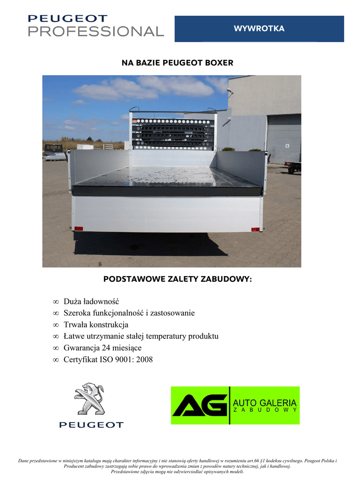 WYWROTKA NA BAZIE PEUGEOT BOXER PODSTAWOWE ZALETY ZABUDOWY: • • • • • • Duża ładowność Szeroka funkcjonalność i zastosowanie Trwała konstrukcja Łatwe utrzymanie stałej temperatury produktu Gwarancja 24 miesiące Certyfikat ISO 9001: 2008 Dane przedstawione w niniejszym katalogu mają charakter informacyjny i nie stanowią oferty handlowej w rozumieniu art.66 §1 kodeksu cywilnego. Peugeot Polska i Producent zabudowy zastrzegają sobie prawo do wprowadzenia zmian z powodów natury technicznej, jak i handlowej. Przedstawione zdjęcia mogą nie odzwierciedlać opisywanych modeli. WYWROTKA CHARAKTERYSTYKA ZABUDOWY: • Burty boczne, otwierane w osi górnej i dolnej • Burta tylna otwierana, w osi górnej i dolnej • Pompa hydrauliczna zasilana z instalacji elektrycznej 12V, tzw. Power Pack. • Sterowanie wywrotką, hydrauliką, pilotem na kablu z kabiny kierowcy • Wszystkie elementy stalowe poddane operacji strumieniowo ściernej, tzw. śrutowanie i lakierowane na kolor RAL 9005 czarny • Podłoga wykonana z blachy stalowej o podwyższonej wytrzymałości mechanicznej o grubości 3mm • Nadkola z tworzywa z fartuchami przeciw-błotnymi, nad osią tylną • Światła gabarytowe boczne • Burty aluminiowe, anodowane, boczne wykonane w formie 1-sekcyjnej o wysokości 400mm • Przednia ściana wykonana z burty o h = 400 mm, powyżej krata ochronna z listw perforowanych • Lampa zespolona LED OPCJE DODATKOWE: • Poduszki powietrzne, kompresor Dane przedstawione w niniejszym katalogu mają charakter informacyjny i nie stanowią oferty handlowej w rozumieniu art.66 §1 kodeksu cywilnego. Peugeot Polska i Producent zabudowy zastrzegają sobie prawo do wprowadzenia zmian z powodów natury technicznej, jak i handlowej. Przedstawione zdjęcia mogą nie odzwierciedlać opisywanych modeli.