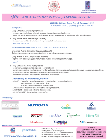 Polskie Towarzystwo Medycyny Perinatalnej WYBRANE ALGORYTMY W POSTĘPOWANIU POŁOŻNEJ GDAŃSK, Q Hotel Grand Cru, ul. Rycerska 11-12 4 listopada 2016 r., (piątek), godz. 10.00-15.00 Program: I prof. UM dr hab. Beata Pięta (Poznań) Poprawa opieki okołoporodowej - propozycje rozwiązań, analiza barier. Nowe standardy postępowania medycznego w ciąży powikłanej, w łagodzeniu bólu porodowego. II prof. dr hab. med. Jerzy Szczapa (Poznań) Znaczenie czynników żywieniowych w promocji zdrowia człowieka. Przerwa kawowa AKADEMIA NUTRICIA - prof. dr hab. n. med. Jerzy Szczapa (Poznań) dr n. med. Iwona Domżalska-Popadiuk (Gdańsk) Najczęstsze problemy dotyczące żywienia w okresie wczesnodziecięcym. prof. dr hab. n. med. Jerzy Szczapa (Poznań) Wpływ flory bakteryjnej jelit na funkcjonowanie przewodu pokarmowego. Lunch III prof. UM dr hab. Beata Pięta (Poznań) Koordynowana opieka nad ciężarną i noworodkiem kompleksowa opieka medyczna nad matką w okresie ciąży, porodu, połogu oraz jej nowo narodzonym dzieckiem, pełna dostępność do świadczeń zgodnie ze wskazaniami medycznymi, możliwość zgłaszania do programu na każdym etapie ciąży. Zapraszamy na prezentacje firmowe: 1. RADA - Pregnaker - przed poczęciem, w trakcie ciąży i karmienia piersią. Neodex - maść dla niemowląt i dzieci. Bliznasil - żel silikonowy do leczenia blizn. 2. OLEOFARM -Witaminy oraz probiotyki dla najmłodszych. 3. PAMPERS - Doskonała ochrona skóry dziecka. 4. PHARMABEST - Naturalni sprzymierzeńcy. Partnerzy: . Biuro kongresowe: PRENATALIS - Piękne Narodziny ul. Stary Port 13, 85-068 Bydgoszcz fax: 52 373-39-66, 581 16 15 kom. 887 118 118 tel. 52 373-43-37, 373-24-92, 581-16-14 WWW.AKADEMIAPOLOZNEJ.PL e-mail: [email protected] BEZPŁATNE CERTYFIKAT UCZESTNICTWA OBOWIĄZUJĄ ZGŁOSZENIA FAX LUB E-MAIL ILOŚĆ MIEJSC OGRANICZONA, DECYDUJE KOLEJNOŚĆ ZGŁOSZEŃ