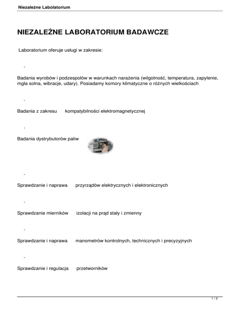 Niezależne Labolatorium NIEZALEŻNE LABORATORIUM BADAWCZE Laboratorium oferuje usługi w zakresie: Badania wyrobów i podzespołów w warunkach narażenia (wilgotność, temperatura, zapylenie, mgła solna, wibracje, udary). Posiadamy komory klimatyczne o różnych wielkościach Badania z zakresu kompatybilności elektromagnetycznej Badania dystrybutorów paliw Sprawdzanie i naprawa przyrządów elektrycznych i elektronicznych Sprawdzanie mierników izolacji na prąd stały i zmienny Sprawdzanie i naprawa manometrów kontrolnych, technicznych i precyzyjnych Sprawdzanie i regulacja przetworników 1/2 Niezależne Labolatorium Analizy spektroskopowe stali stopowych Pomiary długości i kąta Sprawdzanie momentów obrotowych wkrętarek Inne usługi wg uzgodnień Na wykonane prace wydajemy odpowiednie świadectwa i protokoły. Gwarantujemy fachowość, terminowość zleconych prac i konkurencyjne ceny. LABORATORIUM posiada CERTYFIKAT ISO 9001 2/2