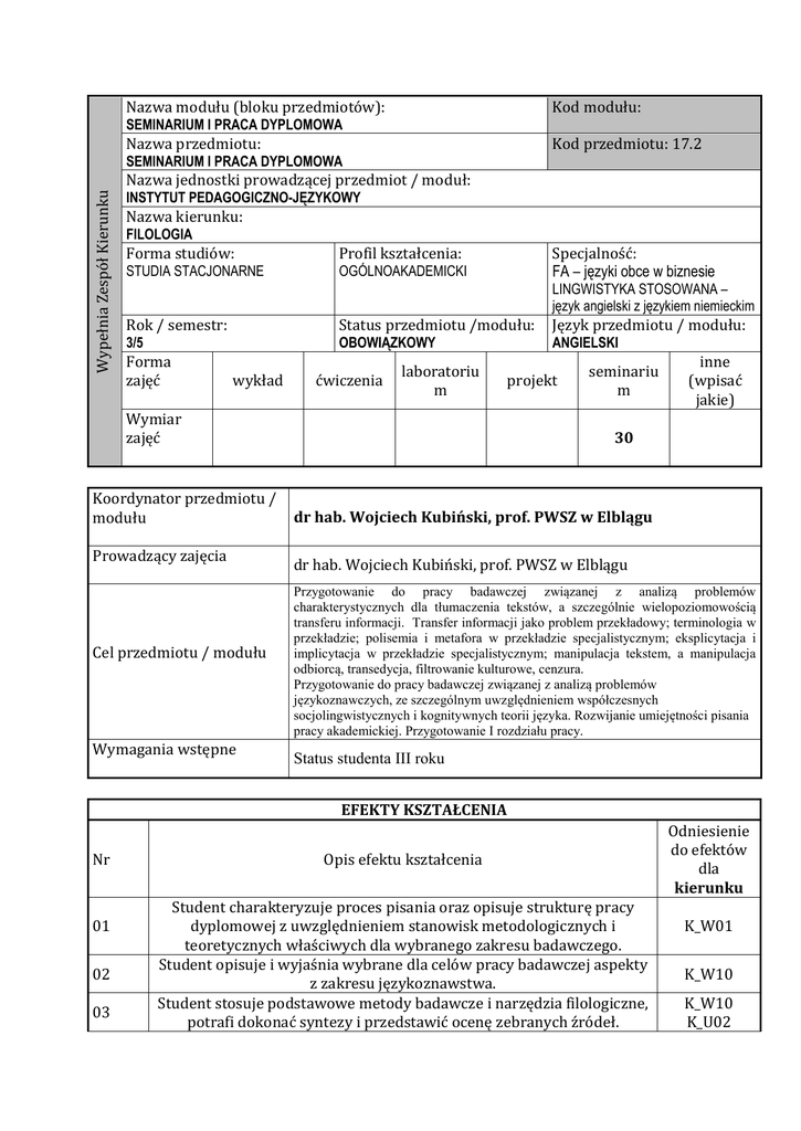 Nazwa modułu (bloku przedmiotów): Kod modułu: Nazwa przedmiotu: Kod przedmiotu: 17.2 SEMINARIUM I PRACA DYPLOMOWA SEMINARIUM I PRACA DYPLOMOWA Wypełnia Zespół Kierunku Nazwa jednostki prowadzącej przedmiot / moduł: INSTYTUT PEDAGOGICZNO-JĘZYKOWY Nazwa kierunku: FILOLOGIA Forma studiów: STUDIA STACJONARNE Profil kształcenia: Specjalność: FA – języki obce w biznesie OGÓLNOAKADEMICKI LINGWISTYKA STOSOWANA – język angielski z językiem niemieckim Rok / semestr: Status przedmiotu /modułu: 3/5 Forma zajęć OBOWIĄZKOWY wykład ćwiczenia laboratoriu m Wymiar zajęć Koordynator przedmiotu / modułu Prowadzący zajęcia Cel przedmiotu / modułu Wymagania wstępne Język przedmiotu / modułu: ANGIELSKI projekt seminariu m inne (wpisać jakie) 30 dr hab. Wojciech Kubiński, prof. PWSZ w Elblągu dr hab. Wojciech Kubiński, prof. PWSZ w Elblągu Przygotowanie do pracy badawczej związanej z analizą problemów charakterystycznych dla tłumaczenia tekstów, a szczególnie wielopoziomowością transferu informacji. Transfer informacji jako problem przekładowy; terminologia w przekładzie; polisemia i metafora w przekładzie specjalistycznym; eksplicytacja i implicytacja w przekładzie specjalistycznym; manipulacja tekstem, a manipulacja odbiorcą, transedycja, filtrowanie kulturowe, cenzura. Przygotowanie do pracy badawczej związanej z analizą problemów językoznawczych, ze szczególnym uwzględnieniem współczesnych socjolingwistycznych i kognitywnych teorii języka. Rozwijanie umiejętności pisania pracy akademickiej. Przygotowanie I rozdziału pracy. Status studenta III roku EFEKTY KSZTAŁCENIA Nr 01 02 03 Opis efektu kształcenia Student charakteryzuje proces pisania oraz opisuje strukturę pracy dyplomowej z uwzględnieniem stanowisk metodologicznych i teoretycznych właściwych dla wybranego zakresu badawczego. Student opisuje i wyjaśnia wybrane dla celów pracy badawczej aspekty z zakresu językoznawstwa. Student stosuje podstawowe metody badawcze i narzędzia filologiczne, potrafi dokonać syntezy i przedstawić ocenę zebranych źródeł. Odniesienie do efektów dla kierunku K_W01 K_W10 K_W10 K_U02 04 05 06 07 08 09 10 11 Student stosuje podstawowe umiejętności badawcze pod kierunkiem opiekuna. Student objaśnia i stosuje podstawowe kategorie językoznawstwa stosowanego. Student formułuje własne wnioski pod kierunkiem opiekuna. Student dyskutuje kategorie językoznawstwa stosowanego w języku angielskim. Student korzysta ze źródeł stosując parafrazy, streszczenia lub cytaty w odpowiedniej formie języka pisanego, zachowując przy tym zasady ochrony własności intelektualnej. Student formułuje argumenty i wnioski w języku akademickim. Student efektywnie organizuje swoją pracę i ocenia stopień jej zaawansowania. Student efektywnie korzysta z dostępnych mediów i jest otwarty na inne rozwiązania zagadnień. K_U03 K_W01 K_U07 K_U06 K_U07 K_W14 K_U02 K_U06 K_U07 K_K04 K_K09 TREŚCI PROGRAMOWE Wykład nie dotyczy Ćwiczenia Dopuszczalne formaty pracy dyplomowej; Krytyczny przegląd współczesnych teorii językoznaczwych lub przekładoznawczych przydatnych w pisaniu pracy licencjackiej; Laboratorium nie dotyczy Projekt nie dotyczy Literatura podstawowa Literatura uzupełniająca Metody kształcenia Baker, Mona, 1992. In Other Words. London and New York: Routledge. Bassnett, Susan. 1980/1991. Translation Studies. London and New York: Routledge. Lefevere, André. 1992. Translation/History/Culture. London and New York: Routledge. Fromkin, Victoria, Rodman, Robert. 1983. An Introduction to Language.New York: Holt, Rinehart and Winston. Baker, Mona (red.). 1998. Routledge Encyclopedia of Translation Studies. London and New York: Routledge. Tabakowska, Elżbieta. 1993. Cognitive Linguistics and the Poetics of Translation. Tübingen: Gunter Narr. Wardhaugh, Ronald. 1986. An Introduction to Sociolinguistics. London: Penguin Books. Cwiczenia audytoryjne: analiza tekstów z literatury przedmiotu oraz tekstów studentów prezentowanych w ramach seminarium Nr efektu kształcenia Metody weryfikacji efektów kształcenia Prezentacja Dyskusja w grupie Forma i warunki zaliczenia 01,02,03,04,05, 06,08,09,10,11 07,09,11 Student otrzymuje zaliczenie z oceną na podstawie: prezentacji zaliczeniowej 80% i aktywnego uczestnictwa w zajęciach 20% NAKŁAD PRACY STUDENTA Liczba godzin Udział w wykładach Samodzielne studiowanie tematyki wykładów Udział w ćwiczeniach audytoryjnych i laboratoryjnych* Samodzielne przygotowywanie się do ćwiczeń* Przygotowanie projektu / eseju / itp. * Przygotowanie się do egzaminu / zaliczenia Udział w konsultacjach Inne ŁĄCZNY nakład pracy studenta w godz. Liczba punktów ECTS za przedmiot Liczba p. ECTS związana z zajęciami praktycznymi* Liczba p. ECTS za zajęciach wymagające bezpośredniego udziału nauczycieli akademickich 30 125 5 160 6 155 (30+125) 6,2 35 (30+5) 1,4