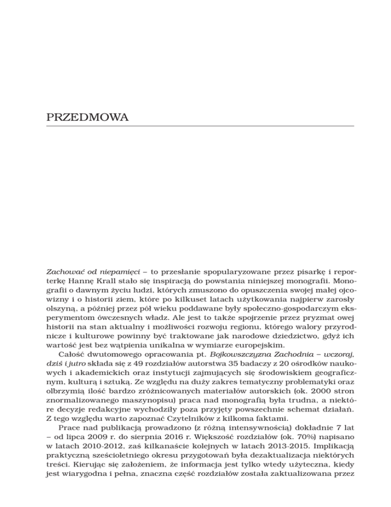 PRZEDMOWA Zachować od niepamięci – to przesłanie spopularyzowane przez pisarkę i reporterkę Hannę Krall stało się inspiracją do powstania niniejszej monografii. Monografii o dawnym życiu ludzi, których zmuszono do opuszczenia swojej małej ojcowizny i o historii ziem, które po kilkuset latach użytkowania najpierw zarosły olszyną, a później przez pół wieku poddawane były społeczno-gospodarczym eksperymentom ówczesnych władz. Ale jest to także spojrzenie przez pryzmat owej historii na stan aktualny i możliwości rozwoju regionu, którego walory przyrodnicze i kulturowe powinny być traktowane jak narodowe dziedzictwo, gdyż ich wartość jest bez wątpienia unikalna w wymiarze europejskim. Całość dwutomowego opracowania pt. Bojkowszczyzna Zachodnia – wczoraj, dziś i jutro składa się z 49 rozdziałów autorstwa 35 badaczy z 20 ośrodków naukowych i akademickich oraz instytucji zajmujących się środowiskiem geograficznym, kulturą i sztuką. Ze względu na duży zakres tematyczny problematyki oraz olbrzymią ilość bardzo zróżnicowanych materiałów autorskich (ok. 2000 stron znormalizowanego maszynopisu) praca nad monografią była trudna, a niektóre decyzje redakcyjne wychodziły poza przyjęty powszechnie schemat działań. Z tego względu warto zapoznać Czytelników z kilkoma faktami. Prace nad publikacją prowadzono (z różną intensywnością) dokładnie 7 lat – od lipca 2009 r. do sierpnia 2016 r. Większość rozdziałów (ok. 70%) napisano w latach 2010-2012, zaś kilkanaście kolejnych w latach 2013-2015. Implikacją praktyczną sześcioletniego okresu przygotowań była dezaktualizacja niektórych treści. Kierując się założeniem, że informacja jest tylko wtedy użyteczna, kiedy jest wiarygodna i pełna, znaczna część rozdziałów została zaktualizowana przez 18 Bojkowszczyzna Zachodnia – wczoraj, dziś i jutro Autorów w okresie od maja do listopada 2015 r., w tym kilka z nich napisano niemal od nowa. Niemniej jednak należy mieć świadomość, że niektóre opracowania nie zostały poddane tej procedurze lub objęła ona jedynie uzupełnienie bibliografii o najnowsze pozycje z danej tematyki. Końcowe prace redakcyjne i merytoryczne, będące przede wszystkim wynikiem sugestii zawartych w recenzjach, realizowano w okresie od marca do listopada 2016 r. Jednym z najpoważniejszych wyzwań był zakres ingerencji redakcyjnej w teksty, czyli odpowiedź na pytanie: gdzie postawić granicę, aby nie rugując całkowicie indywidualizmu i niewątpliwego kolorytu 35 różnych „piór” stworzyć jednocześnie opracowanie mające charakter monograficzny, a więc cechujące się znacznym stopniem ujednolicenia? Ostatecznie postanowiono nie unifikować na siłę, charakterystycznych dla poszczególnych Autorów, językowych środków stylistycznych czy sposobów prowadzenia narracji. Dotyczy to także niektórych map, które po niezbędnych poprawkach edytorskich pozostawiono w oryginalnych wersjach, nie przenosząc ich treści na podkład referencyjny. Na prośbę kilku Autorów odstąpiono również od pierwotnego planu utworzenia zbiorczej bibliografii na korzyść autonomicznych spisów wykorzystanych źródeł. Zrezygnowano także z egzekwowania ścisłego limitu objętościowego poszczególnych rozdziałów. W praktyce bowiem okazało się, że te najobszerniejsze, głównie historyczne opracowania, stanowią tak przemyślane i kompletne wywody, że niedopuszczalne byłoby ich usilne skracanie i dopasowywanie do pierwotnych, arbitralnych wytycznych. Relatywnie duża autonomia Autorów, wykorzystujących bardzo zróżnicowane metody badawcze, w połączeniu z olbrzymim zróżnicowaniem tematycznym nie pozostały bez wpływu na zawartość monografii, w której znaleźć można opracowania o charakterze problemowym, opisowym, przeglądowym czy inwentaryzacyjnym. Ta różnorodność nie jest jednak słabością pracy, ale raczej jej atutem. Dzięki temu bowiem każdy z Czytelników, bez względu na ilość posiadanej wiedzy o regionie i stopień jego empirycznego poznania, będzie miał możliwość znaleźć w niej coś dla siebie. Źródłem dylematów była jednak nie tylko forma. Już w momencie tworzenia konspektu monografii starano się tak doprecyzować i uzgodnić z Autorami tematykę poszczególnych opracowań, aby uniknąć dublowania się treści. Jednak w kilku przypadkach zakresy tematyczne, pozornie rozłączne, okazały się mieć część wspólną tak ważną, że konieczne stało się omówienie tych samych zagadnień w więcej niż jednym rozdziale. Z perspektywy czasu początkowe obawy należy jednak uznać za nieuzasadnione, gdyż te cząstkowe, nieplanowane koreferaty utworzyły cenną wartość dodaną. Poważną trudność stanowił także zapis ukraińskich nazwisk i tytułów opracowań. Przyjęto, że wykorzystane zostaną dwa sposoby konwersji pisma: w powołaniach na źródła i w opisach bibliograficznych – obowiązująca obecnie transliteracja określona przez Polską Normę (PN-ISO 9:2000), zaś w tekście głównym – polska transkrypcja. Jeśli chodzi o tę drugą, mogą jednak wystąpić drobne rozbieżności zapisu, bowiem konwersja ta występuje w kilku „odmianach” (np. wydawnicza, biblioteczna, fonetyczna) i nie stosuje się doń norm tak ścisłych, jak w grafemicznej transliteracji. W przypadku geograficznych nazw własnych (oficjalnych egzonimów i transkrypcji) posiłkowano się zaleceniami Zachować od niepamięci 19 Komisji Standaryzacji Nazw Geograficznych poza Granicami Rzeczypospolitej Polskiej przy Głównym Geodecie Kraju. Mimo dołożenia wszelkich starań z pewnością nie udało się w tak obszernym opracowaniu uniknąć błędów, sprzeczności czy braków. W tej chwili nie pozostaje już nic innego, jak tylko przeprosić za nie Czytelników i poprosić o nadsyłanie mailem ([email protected]) informacji o wszelkich tego typu przypadkach w celu stworzenia wspólnymi sił