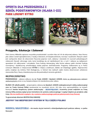 Przygoda, Edukacja i Zabawa! Park Linowy ABlandia zaprasza wszystkie przedszkolaki i uczniów klas od I-III do aktywnej zabawy. Nasz linowy plac zabaw został zaprojektowany z myślą o dzieciach, ich bezpieczeństwie, rozwoju i wyobraźni. Naszym celem jest zachęcenie dzieci do aktywności fizycznej poprzez ruch, zabawę i stawianie im wyzwań pobudzających ciekawość. Nawyki zdrowego stylu życia kształtują się od najmłodszych lat, a ruch i zabawa są najlepszym sposobem ich odkrywania i utrwalania. Poza funkcją rekreacyjną, taka forma zabawy pełni również funkcję rozwojową i dydaktyczną umożliwiającą naukę poprzez doświadczenie. Programy realizowane są w Parku Linowym ABlandia w miejscowości RYTRO w miejscu urokliwym, daleko od miejskiego zgiełku. Naprzeciwko parku znajduje się Gminny Park Ekologiczny, w którym bez żadnych opłat można obserwować unikatowe stanowiska flory i fauny charakterystyczne dla podmokłych terenów górskich. BEZPIECZEŃSTWO PRZEDSZKOLE - zabawa odbywa się na Trasie JUNIOR i Zjazdach JUNIOR, które są zabezpieczone siatkami asekuracyjnymi, przez co są bezpieczniejsze niż standardowy plac zabaw. KLASA I-III szkoła podst. - proponujemy zabawę na Zjazdach JUNIOR (zabezpieczonych siatką asekuracyjną) oraz na Trasie Linowej Żółtej zawieszonej na wysokości ok.2m. Od roku 2015 wprowadziliśmy na trasach linowych bardzo bezpieczny system asekuracyjny – Uczestnicy przed wejściem na Trasę Linową Żółtą zostaną wpięci przez instruktora do systemu asekuracyjnego i wypięci dopiero po przejściu całej trasy. Nie ma możliwości wypięcia się z systemu asekuracyjnego podczas pokonywania trasy linowej. To gwarantuje dzieciom BEZPIECZNĄ ZABAWĘ! – nie musisz się już martwić o dzieci/podopiecznych podczas zabawy w parku linowym! Z myślą o najmłodszych przygotowaliśmy poniższe programy dostosowane do wieku uczestników, podczas których dzieci poprzez zabawę zdobywają nowe umiejętności. CENNIK ilość osób uwaga: minimalne zamówienie 500 zł PRZEDSZKOLE SZKOŁA PODSTAWOWA KLASA I - III PROGRAMY 20 - 40 os. pow.40 os STREFA JUNIORA / 2,5 h zabawy/ 25 zł 23 zł STREFA JUNIORA / 2,5 h zabawy/ 25 zł 23 zł PRZYGODA TARZANA (STREFA JUNIORA + Trasa linowa ŻÓŁTA ) / 3 h zabawy/ 38 zł 36 zł Trasa linowa Żółta - 2 przejścia 25 zł 23 zł Zapewniamy kask dla każdego uczestnika. W programie: Zabawa na Trasie JUNIOR- specjalnie zaprojektowana i wykonana trasa linowa dla najmłodszych (poprzez zabawę dzieci uczą się odpowiedzialności, uczą się również mierzyć siły na zamiary). Trasa znajduje się na wysokości 1 do 2m nad poziomem terenu. Na drzewach zamontowane są platformy z domkami, które uatrakcyjniają zabawę dzieci. Wszystkie przeszkody są zabezpieczone specjalnymi siatkami asekurującymi. Program obejmuje nielimitowaną ilość przejść w ustalonym czasie. Zjazdy JUNIOR- Zjazd tyrolski dla najmłodszych o długości ok.30 m, zabezpieczony siatką asekuracyjną. Zjazd odbywa się za pomocą liny podczepionej do systemu tyrolskiego. Program obejmuje nielimitowaną ilość zjazdów w ustalonym czasie. Upominek dla dzieci od ABlandii. Zapewniamy: atestowany sprzęt asekuracyjny (uprząż chroniącą korpus ciała, lonża, hak Belay System, kask) opiekę certyfikowanych instruktorów Program przygotowany jest dla najmłodszych zdobywców parków linowych, rozpoczynających swoją przygodę z parkiem linowym. Atrakcje programu: Zabawa na Trasie JUNIOR- specjalnie zaprojektowana i wykonana trasa linowa dla najmłodszych (poprzez zabawę dzieci uczą się odpowiedzialności, uczą się również mierzyć siły na zamiary). Trasa znajduje się na wysokości 1 do 2m nad poziomem terenu. Na drzewach zamontowane są platformy z domkami, które uatrakcyjniają zabawę dzieci. Wszystkie przeszkody są zabezpieczone specjalnymi siatkami asekurującymi. Program obejmuje nielimitowaną ilość przejść w ustalonym czasie. Zjazdy JUNIOR – Zjazd tyrolski dla najmłodszych o długości ok.30 m, zabezpieczony siatką asekuracyjną. Zjazd odbywa się za pomocą liny podczepionej do systemu tyrolskiego. Program obejmuje nielimitowaną ilość zjazdów w ustalonym czasie. Przejścia nielimitowane przez Trasę Linową ŻÓŁTĄ- znajdującą się na niewielkiej wysokości, ok 2m nad poziomem gruntu, liczącą 12 przeszkód, dzieci przechodzą ją w sprzęcie asekuracyjnym. Na trasie zastosowano bezwypięciowy system asekuracyjny- dzieci zostaną wpięte do systemu przez instruktora i wypięte dopiero po przejściu całej trasy. Upominek dla dzieci od ABlandii Zapewniamy: atestowany sprzęt asekuracyjny (uprząż chroniącą korpus ciała, lonża, hak Belay System, kask) opiekę certyfikowanych instruktorów W PROGRAMIE: 2- krotne przejście przez Trasę Linową ŻÓŁTĄ- znajdującą się na niewielkiej wysokości, ok 2m nad poziomem gruntu, liczącą 12 przeszkód, dzieci przechodzą ją w sprzęcie asekuracyjnym. Na trasie zastosowano bezwypięciowy system asekuracyjny- dzieci zostaną wpięte do systemu przez instruktora i wypięte dopiero po przejściu całej trasy. Upominek dla dzieci od ABlandii Podczas szalonej zabawy w ABlandii każdy nabiera apetytu. Dlatego proponujemy następujące zestawy: Frytki, herbata – 5 zł Kiełbaska z grilla, pieczywo, ketchup, herbata – 7 zł Istnieje możliwość WYNAJĘCIA GRILLA z opałem: 60 zł. UBIÓR Zalecamy ubranie wygodnych sportowych ubrań, butów sportowych lub sandałów sportowych (muszą mieć pasek wokół pięty, klapki są niedozwolone) i odpowiedni strój do pogody. Nie należy nosić biżuterii, takiej jak długie kolczyki, bransoletki, naszyjniki, pierścionki itp. Należy również mieć związane włosy. Co jeśli PADA DESZCZ? Deszcz nie przeszkadza w realizacji programu. Trzeba tyko pamiętać o kurtce przeciwdeszczowej. Jedynie wichura i burza są czynnikami uniemożliwiającymi zabawę w parku, ale one z reguły szybko przechodzą, można wi