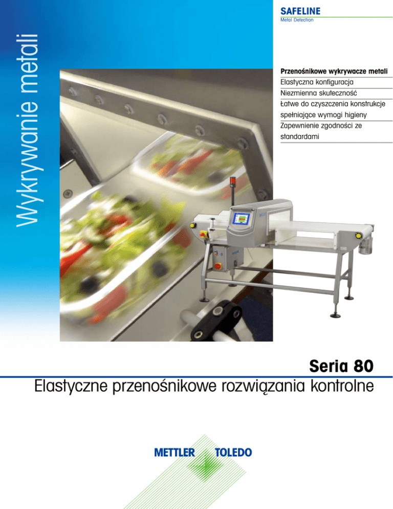 SAFELINE Wykrywanie metali Metal Detection Przenośnikowe wykrywacze metali Elastyczna konfiguracja Niezmienna skuteczność Łatwe do czyszczenia konstrukcje spełniające wymogi higieny Zapewnienie zgodności ze standardami Seria 80 Elastyczne przenośnikowe rozwiązania kontrolne Systemy przenośnikowe serii 80 Ochrona Twoich klientów Możliwość konfiguracji ułatwia dopasowanie do danego zastosowania Na konkurencyjnym rynku producent musi dostarczać klientom produkty o niezmiennie wysokiej jakości, pozbawione zanieczyszczeń. Przenośnikowe systemy wykrywania metali serii 80 są elastycznymi rozwiązaniami kontrolnymi, przeznaczonymi do szerokiego zakresu zastosowań nieżywnościowych oraz żywnościowych oraz do pracy przy małych i średnich obciążeniach. Dopasowane do potrzeb Klienta Systemy mogą zostać tak skonstruowane i skonfigurowane, aby pasowały do określonych warunków technologicznych. Dostępne są różne systemy — od prostych, zatrzymywanych po wykryciu zanieczyszczenia, po w pełni zautomatyzowane systemy wykrywające i odrzucające, współpracujące z szeroką gamą urządzeń usuwających zanieczyszczone produkty. Seria 80 zawiera rozwiązania umożliwiające pracę w prawie każdym środowisku produkcyjnym. Oznacza to, że bez względu na to, Model serii 80 z odrzutnikiem i wykrywaczem Profile czy produkty są mokre, suche, schłodzone, zamrożone, sypkie czy opakowane — systemy przenośnikowe serii 80 mogą sprostać wszelkim wyzwaniom kontrolnym. Model serii 80 z systemem STOP i wykrywaczem Profile 2 Przyszłościowe rozwiązania kontrolne Aby zapewnić maksymalną czułość i wydajność podczas pracy w linii produkcyjnej, można dostosować wielkość otworu, wykończenie oraz częstotliwości robocze wykrywacza do rzeczywistych wymagań procesu. Dostępny jest szeroki wybór technologii wykrywania metali i operacyjnych rozwiązań programowych firmy METTLER TOLEDO SAFELINE, dzięki czemu możliwe jest spełnienie wymogów norm jakości użytkownika. Technologia Profile Technologia Signature Technologia „żelazo w folii” (Ferrous-in-Foil, FIF) Najbardziej zaawansowane Gruntownie sprawdzona platforma Wykrywacze wyposażone rozwiązanie służące programowa Signature firmy w technologię „żelazo w do wykrywania metali SAFELINE zapewnia niezawodne folii” umożliwiają detekcję charakteryzujące się najwyższą wykrywanie wszystkich zanieczyszczeń metalami czułością na wszystkie metale, zanieczyszczeń metalami w żelaznymi oraz magnetyczną w tym na niemagnetyczną stal licznych zastosowaniach. stalą nierdzewną w produktach nierdzewną. Oprogramowanie zapakowanych w folię aluminiową. Profile wyposażone jest także w liczne dodatkowe funkcje, takie jak praca w trybie optymalizacji wektorowej, ciągłe monitorowanie stanu oraz funkcje komunikacji przez SMS/e-mail, co zapewnia maksymalną wydajność procesu. 3 Systemy przenośnikowe serii 80 Niezawodne, powtarzalne działanie w każdym środowisku pracy Systemy kontrolne serii 80 można tak skonfigurować, aby pasowały do rzeczywistego środowiska pracy. Oznacza to, że pracują one z niezmienną skutecznością, zapewniając maksymalną wydajność i niezawodność procesu, co przekłada się na zwiększenie efektywności i wydajności oraz obniżenie kosztów produkcji i wzrost konkurencyjności. Zintegrowane rozwiązanie przeznaczone do pracy w suchym środowisku w temperaturze otoczenia W środowisku suchym, w którym temperatura eksploatacji odpowiada temperaturze otoczenia, pokrycie lakierem głowicy wykrywania metali i ramy przenośnika jest wystarczające. W niektórych przypadkach konieczne może być zamontowanie wykrywacza o średniej wytrzymałości wykonanego ze stali nierdzewnej. Klasy szczelności IP w zakresie od IP54 do IP65 zapewniają odporność systemów na wilgoć oraz delikatne zmywanie wodą. Jeżeli to konieczne, systemy tego typu można wyposażyć w poliuretanowe taśmy przenośników zatwierdzone przez agencję FDA lub modułowe taśmy polietylenowe. Odpowiednie do kontroli w ekstremalnych środowiskach produktów mokrych, schłodzonych i zamrożonych Podczas pracy w trudnych warunkach systemy kontrolne muszą spełniać odpowiednio rygorystyczne normy. Z tego powodu istnieje możliwość konfiguracji systemów serii 80 z wykrywaczami ze stali nierdzewnej o dużej wytrzymałości, o klasie szczelności IP69K i przenośnikami o klasie szczelności do IP66. Systemy tego typu są zazwyczaj wyposażone w modułowe, polietylenowe taśmy, zapewniające odporność całego systemu na wysokie ciśnienie i wysokotemperaturowe zmywanie wodą przy jednoczesnym zachowaniu niezawodnego działania każdego dnia. Przenośniki przeznaczone do pracy w trudnych warunkach, w mokrych środowiskach Systemy standardowo są wyposażone w przyciski wyłączania awaryjnego 4 Klasa szczelności do IP69K umożliwiająca pracę w najtrudniejszych warunkach zmywania Niezawodne działanie, łatwa integracja Zgodność ze standardami higienicznymi oraz wymaganiami systemu HACCP Wszystkie systemy serii 80 są projektowane i produkowane zgodnie z najbardziej rygorystycznymi normami, co zapewnia długotrwałą stabilność, skuteczność i niezawodność działania. Konstrukcja sztywnych i solidnych ram przenośników jest całkowicie spawana, aby mogła spełnić wymogi certyfikacji EHEDG. Oznacza to, że nierówności, płaskie powierzchnie poziome i inne miejsca gromadzenia się zanieczyszczeń zostały ograniczone do minimum, dzięki czemu czyszczenie jest łatwe, spełniane są wymagania systemu HACCP oraz zachowywane i przekraczane są wymogi norm higienicznych. Efektywne przenoszenie produktów zwiększające wydajność procesów Zoptymalizowana skuteczność, dzisiaj i w przyszłości Wszystkie systemy serii 80 dostarczane są jako gotowe do zainstalowania wraz z pakietem pełnej dokumentacji obejmującym: Instrukcje obsługi Rysunki systemu Deklarację zgodności z normami 