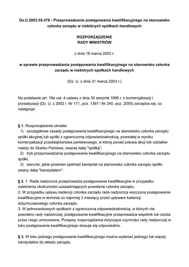 Dz.U.2003.55.476 - Przeprowadzanie postępowania kwalifikacyjnego na stanowisko członka zarządu w niektórych spółkach handlowych ROZPORZĄDZENIE RADY MINISTRÓW z dnia 18 marca 2003 r. w sprawie przeprowadzania postępowania kwalifikacyjnego na stanowisko członka zarządu w niektórych spółkach handlowych (Dz. U. z dnia 31 marca 2003 r.) Na podstawie art. 19a ust. 4 ustawy z dnia 30 sierpnia 1996 r. o komercjalizacji i prywatyzacji (Dz. U. z 2002 r. Nr 171, poz. 1397 i Nr 240, poz. 2055) zarządza się, co następuje: § 1. Rozporządzenie określa: 1) szczegółowe zasady postępowania kwalifikacyjnego na stanowisko członka zarządu spółki akcyjnej lub spółki z ograniczoną odpowiedzialnością, powstałej w wyniku komercjalizacji przedsiębiorstwa państwowego, w której ponad połowa akcji lub udziałów należy do Skarbu Państwa, zwanej dalej "spółką"; 2) tryb przeprowadzania postępowania kwalifikacyjnego na stanowisko członka zarządu spółki; 3) warunki, jakie powinien spełniać kandydat na stanowisko członka zarządu spółki, zwany dalej "kandydatem". § 2. 1. Rada nadzorcza przeprowadza postępowanie kwalifikacyjne w przypadku zaistnienia okoliczności uzasadniających powołanie członka zarządu. 2. W przypadku upływu kadencji członka zarządu rada nadzorcza wszczyna postępowanie kwalifikacyjne w terminie co najmniej 3 miesięcy przed upływem kadencji dotychczasowego członka zarządu. 3. W jednoosobowych spółkach z ograniczoną odpowiedzialnością, w których nie powołano rady nadzorczej, postępowanie kwalifikacyjne przeprowadza wspólnik lub osoba przez niego umocowana. Przepisy rozporządzenia dotyczące czynności rady nadzorczej w toku postępowania kwalifikacyjnego stosuje się odpowiednio. § 3. W toku jednego postępowania kwalifikacyjnego można wyłaniać jednego lub więcej kandydatów do składu zarządu. § 4. Rada nadzorcza wszczyna postępowanie kwalifikacyjne, określając, w drodze uchwały, w szczególności: 1) stanowisko członka zarządu będące przedmiotem postępowania; 2) termin i miejsce przyjmowania zgłoszeń kandydatów; 3) datę otwarcia zgłoszeń; 4) termin i miejsce przeprowadzenia rozmowy kwalifikacyjnej; 5) zakres zagadnień, o których mowa w § 9 ust. 1, będących przedmiotem rozmowy kwalifikacyjnej; 6) termin, miejsce i sposób uzyskiwania przez kandydatów informacji o spółce; 7) termin i miejsce publikacji ogłoszenia o postępowaniu oraz treść tego ogłoszenia; 8) sposób informowania kandydatów o wynikach postępowania. § 5. Ogłoszenie o postępowaniu kwalifikacyjnym jest publikowane w dzienniku ogólnopolskim lub regionalnym. Ogłoszenie zawiera w szczególności: 1) firmę i siedzibę spółki; 2) dane, o których mowa w § 4 pkt 1-6; 3) zakres informacji i oświadczeń, jakie powinny być zawarte w zgłoszeniu; 4) informację o możliwości zakończenia postępowania kwalifikacyjnego bez wyłonienia kandydata. § 6. 1. Kandydat składa zgłoszenie wraz z oświadczeniem o: 1) ukończeniu studiów wyższych; 2) co najmniej pięcioletnim stażu pracy; 3) korzystaniu z pełni praw publicznych; 4) posiadaniu pełnej zdolności do czynności prawnych; 5) niepodleganiu określonym w przepisach prawa ograniczeniom lub zakazom zajmowania stanowiska członka zarządu w spółkach handlowych. 2. Do zgłoszenia dołącza się, w oryginałach lub odpisach, dokumenty potwierdzające kwalifikacje kandydata. W toku postępowania kwalifikacyjnego kandydat może przedstawiać radzie nadzorczej dodatkowe dokumenty. § 7. Rada nadzorcza może w każdym czasie, bez podania przyczyn, zakończyć postępowanie kwalifikacyjne bez wyłaniania kandydatów. Rada nadzorcza powiadamia kandydatów o zakończeniu postępowania kwalifikacyjnego. § 8. 1. Termin przyjmowania zgłoszeń nie może być krótszy niż 14 dni od dnia publikacji ogłoszenia o postępowaniu kwalifikacyjnym. 2. Zgłoszenia kandydatów niespełniające wymogów określonych w ogłoszeniu o postępowaniu kwalifikacyjnym oraz złożone po upływie terminu określonego do ich przyjmowania nie podlegają rozpatrzeniu. 3. Dopuszczenie przez radę nadzorczą choćby jednego kandydata wystarcza do przeprowadzenia dalszego postępowania kwalifikacyjnego. § 9. 1. Rada nadzorcza przeprowadza z kandydatem rozmowę kwalifikacyjną, w toku której ocenia się w szczególności: 1) wiedzę o zakresie działalności spółki oraz o sektorze, w którym działa ta spółka; 2) znajomość zagadnień związanych z zarządzaniem i kierowaniem zespołami pracowników; 3) znajomość zasad funkcjonowania spółek handlowych, ze szczególnym uwzględnieniem spółek z udziałem Skarbu Państwa; 4) znajomość zasad wynagradzania w spółkach z udziałem Skarbu Państwa; 5) znajomość ograniczeń prowadzenia działalności gospodarczej przez osoby pełniące funkcje publiczne; 6) doświadczenie niezbędne do wykonywania funkcji członka zarządu w spółce; 7) znajomość zasad nadzoru właścicielskiego, audytu i kontroli finansowej przedsiębiorstwa oraz rachunkowości zarządczej. 2. Ocena odpowiedzi na pytania dotyczące zagadnień, o których mowa w ust. 1, jest dokonywana indywidualnie przez każdego z członków rady nadzorczej. 3. Jeżeli postępowanie kwalifikacyjne jest prowadzone w związku z wyborem kandydata do składu zarządu kolejnej kadencji, a o to stanowisko ubiega się kandydat będący dotychczas członkiem zarządu, rada nadzorcza dokonuje oceny działalności kandydata za cały okres zajmowania przez niego tego stanowiska. § 10. 1. Rada nadzorcza ustala kolejność kandydatów, oceniając ich predyspozycje, wiedzę i kwalifikacje w zakresie niezbędnym do zajmowania stanowiska członka zarządu w spółce, w której jest prowadzone postępowanie kwalifikacyjne. W razie potrzeby przeprowadza się dodatkową rozmowę kwalifikacyjną. 2. Z przeprowadzonego postępowania kwalifikacyjnego sporządza się protokół. Protokół powinien zawierać w szczeg