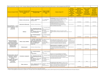 Matryca priorytetów, obszarów, celów i inicjatyw flagowych Strategii Europa 2020 oraz kategorii interwencji realizowanych w okresie programowania 2007-2013 Priorytety Strategii UE 2020 Obszary/cele Startegii UE 2020 stanowiące cel jej głównych działań Wskaźniki dla obszarów/celów Startegii UE 2020 Wstępne wskaźniki dla obszarów/celów Polski 1 2 3 4 Inicjatywy flagowe UE Kategorie interwencji PS 2007-2013 wpisujące się w realizację Strategii 2020 ujęcie indykatywne* Alokacja UE Regionalny Program Operacyjny Województwa Świętokrzyskiego na lata 2007-2013 - ujęcie indykatywne** Umowy w ramach Regionalnego Programu Operacyjnego Województwa Świętokrzyskiego na lata 2007-2013 Wnioski o płatność w ramach Regionalnego Programu Operacyjnego Województwa Świętokrzyskiego na lata 2007-2013 5 6 7 8 9 67 160 698,50 3 718 849,69 1 253 751,46 25 600 391,00 24 054 994,28 126 644,79 12 890 000,00 24 435 738,81 16 403 190,79 285 209 114,00 157 432 661,18 92 420 091,39 117 721 089,50 104 829 162,25 33 524 613,17 0,00 0,00 0,00 73 906 446,00 48 432 007,85 21 475 185,54 Unia Innowacji - inicjatywa na rzecz poprawy warunków Badania i rozwój, innowacje Społeczeństwo informacyjne Rozwój inteligentny - rozwój gospodarki opartej na wiedzy i innowacji smart growth Edukacja Rozwój zrównoważony wspieranie gospodarki efektywniej korzystającej z zasobów, bardziej przyjaznej środowisku i bardziej konkurencyjnej; suistainable growth Rozwój sprzyjający włączeniu społecznemu - wspieranie gospodarki o wysokim poziomie zatrudnienia, zapewniającej spójność społeczną i terytorialną. inclusive growth Klimat, energia, mobilność Konkurencyjność Zatrudnienie i umiejętności Walka z ubóstwem 3% PKB - wydatki Unii na inwestycje w B+R 1,7% - wydatki Polski na inwestycje w B+R ramowych i dostępu do finansowania badań i innowacji, tak by innowacyjne pomysły przeradzały się w nowe produkty i usługi, które z kolei przyczynią się do wzrostu gospodarczego i tworzenia nowych miejsc pracy; Europejska Agenda Cyfrowa -Inicjatywa na rzecz upowszechnienia szybkiego Internetu i umożliwienia gospodarstwom domowym i przedsiębiorstwom czerpania korzyści z jednolitego rynku cyfrowego; cel okreslony w Inicjatywie flagowej 1,2,3,4,7,9,74 10,11,12,13,14,15 10% - maksymalny odsetek osób przedwcześnie kończących naukę szkolną ; 40% - minimalny odsetek osób z wyższym wykształceniem 4,5% - maksymalny odsetek osób przedwcześnie kończących naukę szkolną ; Młodzież w drodze - inicjatywa na rzecz poprawy wyników 45% - minimalny odsetek systemów kształcenia oraz ułatwiania młodzieży wejścia na rynek 72,73,75,77 osób z wyższym pracy; wykształceniem 75% - wskaźnik zatrudnienia osób w wieku 20-64 lat 71% - wskaźnik zatrudnienia osób w wieku 20-64 lat cel „20/20/20” w zakresie klimatu i energii - 20% redukcja emisji gazów cieplrnianych, 20% udział RES w konsumpcjji energii, 20%wzrost efektywności energetycznej 19% redukcja emisji gazów cieplrnianych, 15% udział RES w konsumpcjji energii, 13,6%wzrost efektywności energetycznej Europa efektywnie korzystająca z zasobów – inicjatywa na rzecz uniezależnienia wzrostu gospodarczego od wykorzystania zasobów, przejścia na gospodarkę niskoemisyjną, większego wykorzystania odnawialnych źródeł energii, modernizacji transportu oraz propagowania efektywności energetycznej; 16,17,18,19,20,21,22, 23,24,25, 26,27,28,29,30,31,32, 33,34,35,36,37,38,39, 40,41,42,43,44,45,46, 47,48,49,50,51,52,53, 54 Polityka przemysłowa w erze globalizacji – inicjatywa na rzecz poprawy otoczenia biznesu, szczególnie w odniesieniu do MŚP, 3,4,5,6,7,8,9,14,15 oraz wspierania rozwoju silnej i zrównoważonej bazy przemysłowej, przygotowanej do konkurowania na rynkach światowych; cel okreslony w Inicjatywie flagowej 75% - wskaźnik zatrudnienia osób w wieku 20-64 lat 71% - wskaźnik zatrudnienia osób w wieku 20-64 lat 10% - maksymalny odsetek osób przedwcześnie kończących naukę szkolną ; 40% - minimalny odsetek osób w wieku 30-34 lat z wyższym wykształceniem 4,5% - maksymalny odsetek osób przedwcześnie kończących naukę szkolną ; 45% - minimalny odsetek osób z wyższym wykształceniem 20 mln - zmniejszenie liczby osób zagrożonych ubóstwem Europejski program walki z ubóstwem – inicjatywa na rzecz 1,5 mln-2mln - zmniejszenie zapewnienia spójności społecznej i terytorialnej, tak aby korzyści 61,77,78,79,80,82,83, liczby osób płynące ze wzrostu gospodarczego i zatrudnienia były szeroko 84 zagrożonych ubóstwem dostępne, a osoby ubogie i wykluczone społecznie mogły żyć godnie i aktywnie uczestniczyć w życiu społeczeństwa. Program na rzecz nowych umiejętności i zatrudnienia – inicjatywa na rzecz modernizacji rynków pracy i wzmocnienia pozycji obywateli poprzez rozwój kwalifikacji przez całe życie w 62,63,64,65,66,67,68, celu zwiększenia współczynnika aktywności zawodowej i 69,70.71,72,73,74,80 lepszego dopasowania popytu do podaży na rynku pracy, między innymi dzięki mobilności siły roboczej; * Niektóre kategorie przypisane zostały do wiecej niż jednego celu. Kategorie 55-60,81,85-86 nie zostały nigdzie przypisane. ** Wartości w poszczególnych wierszach liczone są w oparciu o kol. 6. Nie należy sumować kwoty alokacji na poziomie programu, ponieważ niektóre kategorie interwencji realizują jednocześnie kilka priorytetów lub inicjatyw flagowych.