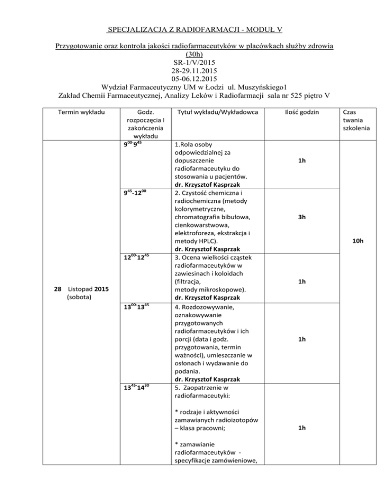 SPECJALIZACJA Z RADIOFARMACJI - MODUŁ V Przygotowanie oraz kontrola jakości radiofarmaceutyków w placówkach służby zdrowia (30h) SR-1/V/2015 28-29.11.2015 05-06.12.2015 Wydział Farmaceutyczny UM w Łodzi ul. Muszyńskiego1 Zakład Chemii Farmaceutycznej, Analizy Leków i Radiofarmacji sala nr 525 piętro V Termin wykładu Godz. rozpoczęcia I zakooczenia wykładu 00- 45 9 9 945-1200 1200-1245 28 Listopad 2015 (sobota) 1300-1345 1345-1430 Tytuł wykładu/Wykładowca 1.Rola osoby odpowiedzialnej za dopuszczenie radiofarmaceutyku do stosowania u pacjentów. dr. Krzysztof Kasprzak 2. Czystośd chemiczna i radiochemiczna (metody kolorymetryczne, chromatografia bibułowa, cienkowarstwowa, elektroforeza, ekstrakcja i metody HPLC). dr. Krzysztof Kasprzak 3. Ocena wielkości cząstek radiofarmaceutyków w zawiesinach i koloidach (filtracja, metody mikroskopowe). dr. Krzysztof Kasprzak 4. Rozdozowywanie, oznakowywanie przygotowanych radiofarmaceutyków i ich porcji (data i godz. przygotowania, termin ważności), umieszczanie w osłonach i wydawanie do podania. dr. Krzysztof Kasprzak 5. Zaopatrzenie w radiofarmaceutyki: * rodzaje i aktywności zamawianych radioizotopów – klasa pracowni; * zamawianie radiofarmaceutyków specyfikacje zamówieniowe, Ilośd godzin Czas twania szkolenia 1h 3h 10h 1h 1h 1h dostawcy, forma i termin składania zamówieo, terminy kalibracji aktywności, * przyjmowanie i rejestrowanie dostaw, dokumentowanie zużycia. dr Janusz Kapuściński 6. Specyfikacje jakościowe radiofarmaceutyków. dr Janusz Kapuściński 1430-1515 1515-1645 7. Dostawa radiofarmaceutyków: 900-1300 ( w tym przerwa 15 min.) 18 19 1h * proces dostawy, śledzenie opóźnionych dostaw, oględziny przesyłek i test przecieku, pomiar skażenia (poziom promieniowania), kontrola opakowania, warunki przechowywania i kontrola oznakowania. dr Janusz Kapuściński 1. Znakowanie i kontrola jakości radiofarmaceutyków cz. 1 2h 5h 5h 29 Listopad 2015 (niedziela) Znakowanie i kontrola jakości radiofarmaceutyków otrzymywanych z użyciem zarejestrowanych zestawów do znakowania. dr. Krzysztof Kasprzak 15h 900-945 20 21 22 23 05 Grudzień 2015 (sobota) 945-1030 1045-1215 1. Znakowanie i kontrola jakości radiofarmaceutyków cz. 2.: - generatory radionuklidów krótko-życiowych, zasady pracy, profil elucji. dr hab. Renata Mikołajczak 2.Generator Mo/Tc – elucja, wydajnośd elucji, kontrola jakości eluatu. dr hab. Renata Mikołajczak 1. 3. Znakowanie erytrocytów (in vivo i in vitro). dr hab. Renata Mikołajczak 1h 6h 1h 2h 1215-1345 1400-1530 30- 15 16 15 1615-1700 900-1115 24 25 06 Grudzieo 2015 (niedziela) 30 11 -13 00 2. 4.Znakowanie białek. 3. dr hab. Renata Mikołajczak 2h 5. Znakowanie technetem99m i kontrola jakości leukocytów pacjenta dr. Janusz Kapuściński 6. Wydajnośd znakowania dr. Janusz Kapuściński 2h 7. Czystośd radionuklidowa (np. zawartośd molibdenu99), dr. Janusz Kapuściński 1. Znakowanie i kontrola jakości radiofarmaceutyków nieautoryzowanych (do badao naukowych i badao klinicznych); - 3 godziny 1h prof. Piotr Garnuszek 2. Weryfikacja/walidacja metod analitycznych. 4h 1h 3h 5h 2h prof. Piotr Garnuszek 26 00 13 -13. 45 Test 15h Razem 30h