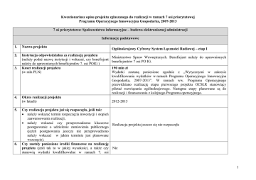 Kwestionariusz opisu projektu zgłaszanego do realizacji w ramach 7 osi priorytetowej Programu Operacyjnego Innowacyjna Gospodarka, 2007-2013 7 oś priorytetowa: Społeczeństwo informacyjne – budowa elektronicznej administracji Informacje podstawowe 1. Nazwa projektu 2. Instytucja odpowiedzialna za realizację projektu (należy podać nazwę instytucji i wskazać, czy beneficjent należy do uprawnionych beneficjentów 7. osi POIG ) Koszt realizacji projektu (w mln PLN) 3. 4. 5. 6. Okres realizacji projektu (w latach) Czy realizacja projektu już się rozpoczęła, jeśli tak: należy wskazać termin rozpoczęcia inwestycji i stopień zaawansowania realizacji, należy wskazać czy przeprowadzono kluczowe postępowanie o udzielenie zamówienia publicznego (jeżeli postępowania jeszcze nie przeprowadzono należy wskazać w jakim terminie jest planowane wszczęcie). Czy zostały poniesione środki finansowe na realizację projektu (jeśli tak to w jakiej wysokości, a także czy stanowią wydatki kwalifikowalne w ramach 7. osi Ogólnokrajowy Cyfrowy System Łączności Radiowej – etap I Ministerstwo Spraw Wewnętrznych. Beneficjent należy do uprawnionych beneficjentów 7 osi PO IG. 190 mln zł Wydatki zostaną poniesione zgodnie z „Wytycznymi w zakresie kwalifikowania wydatków w ramach Programu Operacyjnego Innowacyjna Gospodarka, 2007-2013”. W ramach ww. Programu Operacyjnego przewidziano realizację etapu pierwszego projektu OCSŁR stanowiący pilotaż rozwiązania ogólnokrajowego. Następne etapy planowane są do realizacji i finansowania z kolejnego Programu operacyjnego. 2012-2015 Realizacja projektu jeszcze się nie rozpoczęła Nie 1 Kwestionariusz opisu projektu zgłaszanego do realizacji w ramach 7 osi priorytetowej Programu Operacyjnego Innowacyjna Gospodarka, 2007-2013 7. priorytetowej PO IG)? Grupa docelowa Jaka jest grupa docelowa/grupy docelowe projektu? Czy grupa docelowa/ostateczny odbiorca jest zgodny z założeniami 7 osi POIG? Liczebność grupy docelowej Bezpośrednimi użytkownikami powstałego w wyniku projektu systemu będą jednostki Ratownictwa Medycznego, Państwowej Straży Pożarnej oraz jednostki Policji. tak, grupa docelowa/ostateczny odbiorca jest zgodny z założeniami 7 osi PO IG. Z rezultatów Projektu korzystać będą obywatele RP (ok. 38,5 mln osób - dane na podstawie GUS za rok 2011) oraz cudzoziemcy przebywający na terytorium kraju (ok. 10,8 mln osób - dane na podstawie GUS za rok 2011). Projekt pilotażowy przeznaczony jest do realizacji na wybranym obszarze kraju. Po pozytywnym zakończeniu pilotażu planuje się rozszerzenie obszaru działania systemu na obszar całego kraju. 8. Czy projekt realizowany jest samodzielnie czy w partnerstwie/konsorcjum (jeśli tak czy umowa Projekt realizowany jest samodzielnie. partnerska została już podpisana) 9. Skrócony opis projektu (syntetyczny opis założeń projektu ze szczególnym wskazaniem, jakie e-usługi powstaną w wyniku jego realizacji)- max. 200 słów Funkcjonowanie Systemu Powiadamiania Ratunkowego (SPR) wymaga dysponowania środkami łączności radiowej przez wszystkie zaangażowane służby oraz wymiany ruchu radiowego pomiędzy nimi. W chwili obecnej warunek ten nie jest spełniony ograniczając możliwość optymalizacji struktury organizacyjnej oraz skuteczność działania ratownictwa medycznego. Służby ustawowo powołane do zapewnienia bezpieczeństwa i ratownictwo dysponują wieloma heterogenicznymi systemami łączności radiowej. W większości są to systemy analogowe niezapewniające interoperacyjności. Projekt umożliwi operatorom/dyspozytorom tych służb zintegrowanie łączności głosowej dla potrzeb obsługi zgłoszeń alarmowych (dziś korzystają 2 Kwestionariusz opisu projektu zgłaszanego do realizacji w ramach 7 osi priorytetowej Programu Operacyjnego Innowacyjna Gospodarka, 2007-2013 z niezależnych sieci radiowych). W projekcie zakłada się budowę nowego systemu łączności radiowej dla ww. służb i jego integrację z infrastrukturą telekomunikacyjną Systemu Powiadamiania Ratunkowego, dzięki czemu użytkownik uzyska dodatkową usługę bezpośredniej komunikacji z zespołami. Koordynacja i łączność pomiędzy służbami jest niezbędna w przypadku klęsk żywiołowych oraz ataków terrorystycznych. Czynnikiem krytycznym w tej komunikacji jest sprawny system łączności radiowej. W projekcie OCSŁR zakłada się wykorzystanie sieci szkieletowej OST 112 jako bazy łączącej stacje bazowe systemu łączności radiowej, a w konsekwencji pozwalającej na integrację systemów mobilnej łączności radiowej i stacjonarnej. Przedsięwzięcie należy traktować jako pierwszy etap wdrożenia ogólnokrajowego cyfrowego systemu łączności radiowej dla potrzeb służb ustawowo powołanych do zapewnienia bezpieczeństwa i ratownictwa. 10. Jaka jest zdolność finansowo-organizacyjna (obsada Centrum Projektów Informatycznych posiada doświadczenie w realizacji kadrowa niezbędna do utrzymania systemu, środki projektów istotnych dla informatyzacji państwa, które uzyskało podczas finansowe na utrzymanie systemu w okresie trwałości) realizacji projektów: a. PESEL2 głównego odbiorcy do obsługi i utrzymania b. SIPR budowanego systemu? c. ePUAP2 d. OST112 Należy podkreślić, że przedstawiona lista projektów nie jest wyczerpująca i powinna być traktowana jako zestawienie wybranych projektów ilustrujące doświadczenie CPI w realizacji dużych przedsięwzięć informatycznych. CPI współpracować będzie z jednostkami organizacyjnymi MSW, a w szczególności z komórką organizacyjną właściwą do prowadzenia i utrzymania systemów telekomunikacyjnych Beneficjenta, która zapewni: rozwój produktów projektu; utrzymanie trwałości infrastruktury teleinformatycznej systemów 3 Kwestionariusz opisu projektu zgłaszanego do realizacji w ramach 7 osi priorytetowej Programu Operacyjnego Innowacyjna Gospodarka, 2007-2013 informatycznych i ewide