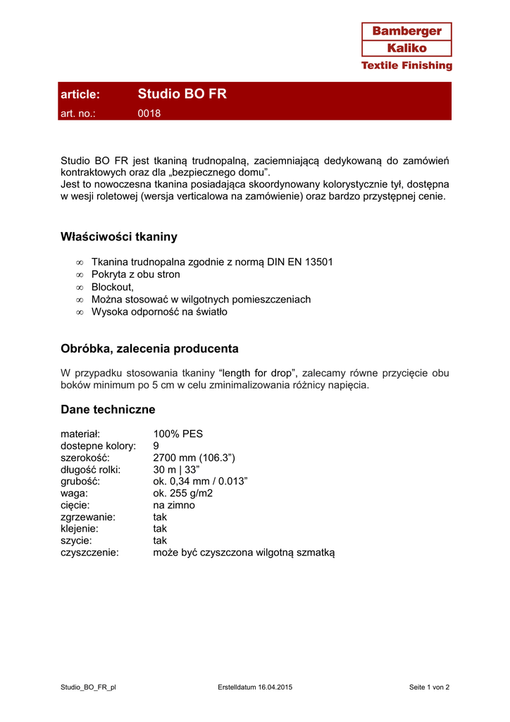 article: Studio BO FR art. no.: 0018 Studio BO FR jest tkaniną trudnopalną, zaciemniającą dedykowaną do zamówień kontraktowych oraz dla „bezpiecznego domu”. Jest to nowoczesna tkanina posiadająca skoordynowany kolorystycznie tył, dostępna w wesji roletowej (wersja verticalowa na zamówienie) oraz bardzo przystępnej cenie. Właściwości tkaniny • • • • • Tkanina trudnopalna zgodnie z normą DIN EN 13501 Pokryta z obu stron Blockout, Można stosować w wilgotnych pomieszczeniach Wysoka odporność na światło Obróbka, zalecenia producenta W przypadku stosowania tkaniny “length for drop”, zalecamy równe przycięcie obu boków minimum po 5 cm w celu zminimalizowania różnicy napięcia. Dane techniczne materiał: dostepne kolory: szerokość: długość rolki: grubość: waga: cięcie: zgrzewanie: klejenie: szycie: czyszczenie: Studio_BO_FR_pl 100% PES 9 2700 mm (106.3”) 30 m | 33” ok. 0,34 mm / 0.013” ok. 255 g/m2 na zimno tak tak tak może być czyszczona wilgotną szmatką Erstelldatum 16.04.2015 Seite 1 von 2 article: Studio BO FR art. no.: 0018 Dane optyczne Light fastness DIN 54004 reflection % transmission % absorption % 0018-001 weiss ≥5 76 0 24 0018-002 ecru ≥5 70 0 30 0018-003 natur ≥5 52 0 48 0018-005 taupe ≥5 18 0 82 0018-009 navy ≥5 8 0 92 0018-012 hellgrau ≥5 35 0 65 0018-013 dunkelgrau ≥5 9 0 91 0018-014 greige ≥5 33 0 67 0018-015 schwarz ≥5 5 0 95 Zakres testu RTA: Światło widzialne 400 - 700nm, testy na życzenie, urządzenie do badań: spectro fotometr. Produkt testowany zgodnie z normą DIN EN 410 (DIN 67507) po lewej stronie tkaniny. Dane techniczne to średnie wartości z różnych testów. Dane techniczne podane na tej karcie wykluczają odpowiedzialność producenta z tytułu wypłaty jakichkolwiek odszkodowań . Studio_BO_FR_pl Erstelldatum 16.04.2015 Seite 2 von 2