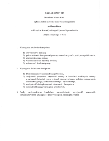 OGŁOSZENIE Burmistrz Miasta Koła ogłasza nabór na