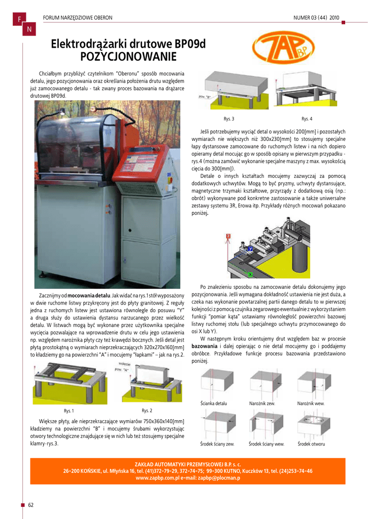 FORUM NARZĘDZIOWE OBERON F NUMER 03 (44) 2010 N Elektrodrążarki drutowe BP09d POZYCJONOWANIE Chciałbym przybliżyć czytelnikom “Oberonu” sposób mocowania detalu, jego pozycjonowania oraz określania położenia drutu względem już zamocowanego detalu - tak zwany proces bazowania na drążarce drutowej BP09d. Rys. 3 Rys. 4 Jeśli potrzebujemy wyciąć detal o wysokości 200[mm] i pozostałych wymiarach nie większych niż 300x230[mm] to stosujemy specjalne łapy dystansowe zamocowane do ruchomych listew i na nich dopiero opieramy detal mocując go w sposób opisany w pierwszym przypadku rys.4 (można zamówić wykonanie specjalne maszyny z max. wysokością cięcia do 300[mm]). Detale o innych kształtach mocujemy zazwyczaj za pomocą dodatkowych uchwytów. Mogą to być pryzmy, uchwyty dystansujące, magnetyczne trzymaki kształtowe, przyrządy z dodatkową osią (np.: obrót) wykonywane pod konkretne zastosowanie a także uniwersalne zestawy systemu 3R, Erowa itp. Przykłady różnych mocowań pokazano poniżej. Zacznijmy od mocowania detalu. Jak widać na rys.1 stół wyposażony w dwie ruchome listwy przykręcony jest do płyty granitowej. Z reguły jedna z ruchomych listew jest ustawiona równolegle do posuwu “Y” a druga służy do ustawienia dystansu narzucanego przez wielkość detalu. W listwach mogą być wykonane przez użytkownika specjalne wycięcia pozwalające na wprowadzenie drutu w celu jego ustawienia np. względem narożnika płyty czy też krawędzi bocznych. Jeśli detal jest płytą prostokątną o wymiarach nieprzekraczających 320x270x160[mm] to kładziemy go na powierzchni “A” i mocujemy “łapkami” – jak na rys.2. Rys. 1 Po znalezieniu sposobu na zamocowanie detalu dokonujemy jego pozycjonowania. Jeśli wymagana dokładność ustawienia nie jest duża, a czeka nas wykonanie powtarzalnej partii danego detalu to w pierwszej kolejności z pomocą czujnika zegarowego ewentualnie z wykorzystaniem funkcji “pomiar kąta” ustawiamy równoległość powierzchni bazowej listwy ruchomej stołu (lub specjalnego uchwytu przymocowanego do osi X lub Y). W następnym kroku orientujemy drut względem baz w procesie bazowania i dalej opierając o nie detal mocujemy go i poddajemy obróbce. Przykładowe funkcje procesu bazowania przedstawiono poniżej. Ścianka detalu Narożnik zew. Narożnik wew. Środek ściany zew. Środek ściany wew. Środek otworu Rys. 2 Większe płyty, ale nieprzekraczające wymiarów 750x360x140[mm] kładziemy na powierzchni “B” i mocujemy śrubami wykorzystując otwory technologiczne znajdujące się w nich lub też stosujemy specjalne klamry-rys.3. ZAKŁAD AUTOMATYKI PRZEMYSŁOWEJ B.P. s. c. 26-200 KOŃSKIE, ul. Młyńska 16, tel. (41)372-79-29, 372-74-75; 99-300 KUTNO, Kuczków 13, tel. (24)253-74-46 www.zapbp.com.pl e-mail: [email protected] 62
