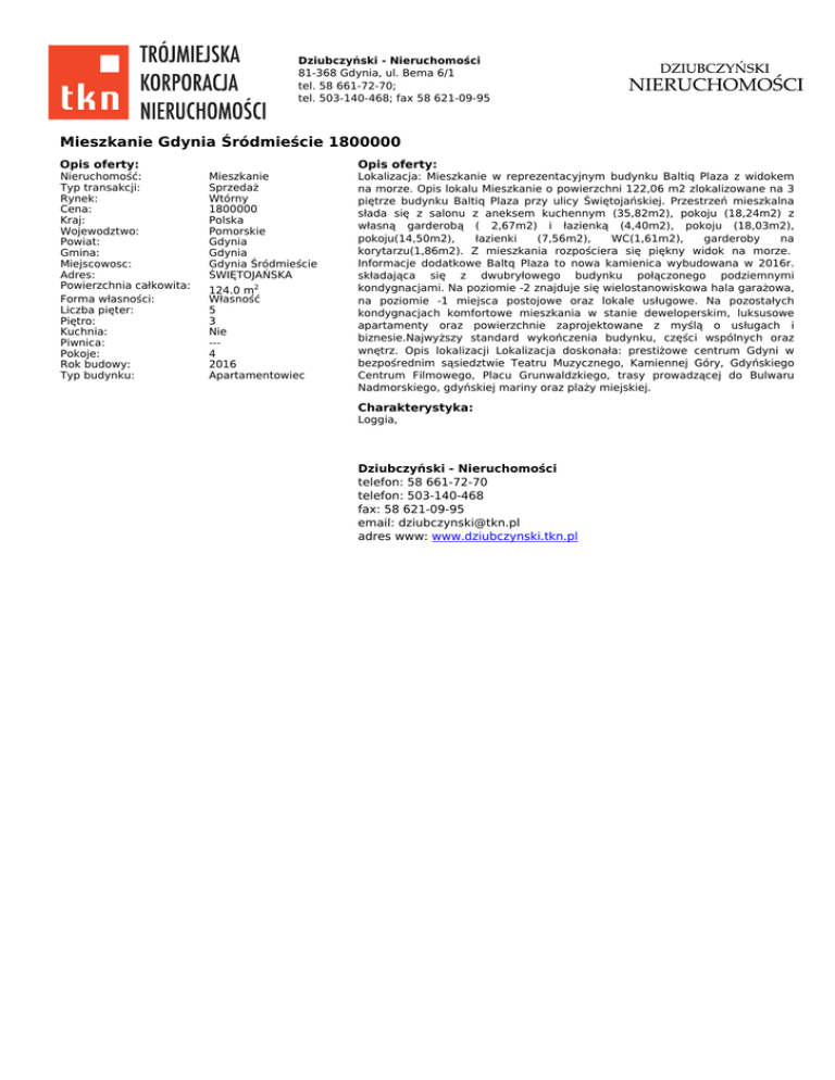 Dziubczyński - Nieruchomości 81-368 Gdynia, ul. Bema 6/1 tel. 58 661-72-70; tel. 503-140-468; fax 58 621-09-95 Mieszkanie Gdynia Śródmieście 1800000 Opis oferty: Nieruchomość: Typ transakcji: Rynek: Cena: Kraj: Wojewodztwo: Powiat: Gmina: Miejscowosc: Adres: Powierzchnia całkowita: Forma własności: Liczba pięter: Piętro: Kuchnia: Piwnica: Pokoje: Rok budowy: Typ budynku: Opis oferty: Mieszkanie Sprzedaż Wtórny 1800000 Polska Pomorskie Gdynia Gdynia Gdynia Śródmieście ŚWIĘTOJAŃSKA 124.0 m2 Własność 5 3 Nie --4 2016 Apartamentowiec Lokalizacja: Mieszkanie w reprezentacyjnym budynku Baltiq Plaza z widokem na morze. Opis lokalu Mieszkanie o powierzchni 122,06 m2 zlokalizowane na 3 piętrze budynku Baltiq Plaza przy ulicy Świętojańskiej. Przestrzeń mieszkalna słada się z salonu z aneksem kuchennym (35,82m2), pokoju (18,24m2) z własną garderobą ( 2,67m2) i łazienką (4,40m2), pokoju (18,03m2), pokoju(14,50m2), łazienki (7,56m2), WC(1,61m2), garderoby na korytarzu(1,86m2). Z mieszkania rozpościera się piękny widok na morze. Informacje dodatkowe Baltq Plaza to nowa kamienica wybudowana w 2016r. składająca się z dwubryłowego budynku połączonego podziemnymi kondygnacjami. Na poziomie -2 znajduje się wielostanowiskowa hala garażowa, na poziomie -1 miejsca postojowe oraz lokale usługowe. Na pozostałych kondygnacjach komfortowe mieszkania w stanie deweloperskim, luksusowe apartamenty oraz powierzchnie zaprojektowane z myślą o usługach i biznesie.Najwyższy standard wykończenia budynku, części wspólnych oraz wnętrz. Opis lokalizacji Lokalizacja doskonała: prestiżowe centrum Gdyni w bezpośrednim sąsiedztwie Teatru Muzycznego, Kamiennej Góry, Gdyńskiego Centrum Filmowego, Placu Grunwaldzkiego, trasy prowadzącej do Bulwaru Nadmorskiego, gdyńskiej mariny oraz plaży miejskiej. Charakterystyka: Loggia, Dziubczyński - Nieruchomości telefon: 58 661-72-70 telefon: 503-140-468 fax: 58 621-09-95 email: [email protected] adres www: www.dziubczynski.tkn.pl