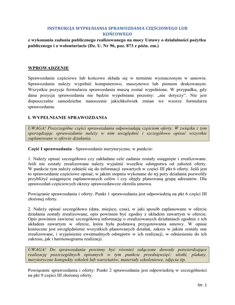 INSTRUKCJA WYPEŁNIANIA SPRAWOZDANIA CZĘŚCIOWEGO LUB KOŃCOWEGO z wykonania zadania publicznego realizowanego na mocy Ustawy o działalności pożytku publicznego i o wolontariacie (Dz. U. Nr 96, poz. 873 z późn. zm.) WPROWADZENIE Sprawozdanie częściowe lub końcowe składa się w terminie wyznaczonym w umowie. Sprawozdanie należy wypełnić komputerowo, maszynowo lub pismem drukowanym. Wszystkie pozycje formularza sprawozdania muszą zostać wypełnione. W przypadku, gdy dana pozycja sprawozdania nie będzie wypełniana piszemy: „nie dotyczy”. Nie jest dopuszczalne samodzielne nanoszenie jakichkolwiek zmian we wzorze formularza sprawozdania. I. WYPEŁNIANIE SPRAWOZDANIA UWAGA! Poszczególne części sprawozdania odpowiadają częściom oferty. W związku z tym sporządzając sprawozdanie należy w nim uwzględnić i szczegółowo opisać wszystkie zaplanowane w ofercie działania. Część I sprawozdania - Sprawozdanie merytoryczne, w punkcie: 1. Należy opisać szczegółowo czy zakładane cele zadania zostały osiągnięte i zrealizowane. Jeśli nie zostały zrealizowane należy wyjaśnić wszelkie odstępstwa od założeń oferty. W punkcie tym należy odnieść się do informacji zawartych w części III pkt 6 oferty. Jeśli jest to sprawozdanie częściowe opisać, w jakim stopniu wykonane do tej pory działania pozwoliły przybliżyć osiągnięcie zaplanowanych celów i czy objęły planowaną grupę adresatów. Dla sprawozdań częściowych okresy sprawozdawcze określa umowa. Powiązanie sprawozdania i oferty: Punkt 1 sprawozdania jest odpowiedzią na pkt 6 części III złożonej oferty. 2. Należy opisać szczegółowo (data, miejsce, czas), w jaki sposób zaplanowane w ofercie działania zostały zrealizowane, opis powinien być zgodny z układem zawartym w ofercie. Opis powinien zawierać szczegółową informację o zrealizowanych działaniach zgodnie z ich układem zawartym w ofercie, która była podstawą przygotowania umowy. W opisie konieczne jest uwzględnienie wszystkich planowanych działań, zakres w jakim zostały one zrealizowane, i wyjaśnienie ewentualnych odstępstw w ich realizacji, w odniesieniu do ich zakresu, jak i harmonogramu realizacji. UWAGA! Do sprawozdania powinny być również załączone dowody potwierdzające realizację poszczególnych opisanych w tym punkcie przedsięwzięć: ulotki, plakaty, merytoryczne konspekty szkoleń lub warsztatów, materiały szkoleniowe, zdjęcia itp. Powiązanie sprawozdania i oferty: Punkt 2 sprawozdania jest odpowiedzią w szczególności na pkt 9 części III złożonej oferty. Str. 1 3. Należy opisać, w jaki sposób dofinansowanie z dotacji inwestycji związanych z realizacją zadania wpłynęło na jego wykonanie. Punkt ten dotyczy wyłącznie podmiotów, które z otrzymanej dotacji realizowały zadania inwestycyjne. Powiązanie sprawozdania i oferty: Punkt 3 sprawozdania jest odpowiedzią na pkt 4 części III złożonej oferty. 4. Należy opisać, jakie rezultaty zostały osiągnięte podczas realizacji zadania, w odniesieniu do zakładanych rezultatów realizacji zadania publicznego, określonych w punkcie 10 części III oferty. UWAGA! Należy podać dokładne wyliczenie ilościowych rezultatów projektu. Jeśli podane w sprawozdaniu wartości różnią się od zaplanowanych w złożonej wcześniej ofercie, to należy wyjaśnić przyczyny takiej sytuacji. Powiązanie sprawozdania i oferty: Punkt 3 sprawozdania jest odpowiedzią na pkt 10 części III złożonej oferty. 5. Należy określić liczbowo skalę działań zrealizowanych w ramach zadania. Należy użyć tych samych miar, które zapisane były w ofercie realizacji zadania, w części III pkt 9. (tzn. miar adekwatnych dla danego zadania publicznego, np. liczba świadczeń udzielanych tygodniowo, miesięcznie, liczba adresatów). Powiązanie sprawozdania i oferty: Punkt 3 sprawozdania jest odpowiedzią na pkt 9 części III złożonej oferty. Część II sprawozdania - Sprawozdanie z wykonania wydatków: UWAGA! Używane w dalszej części słowo „kosztorys” oznacza kosztorys obowiązujący zgodnie z umową, a zatem może to być kosztorys zawarty w ofercie, zaktualizowany kosztorys, stanowiący załącznik do umowy, lub kosztorys zmieniony aneksem. W punkcie: 1. Rozliczenie ze względu na rodzaj kosztów (w zł): Wypełnianie w przypadku składania sprawozdania częściowego 1) kolumna „Całość zadania zgodnie z umową (w zł)” Należy przepisać poszczególne rodzaje kosztów z kosztorysu z zachowaniem wszystkich występujących w kosztorysie pozycji i w tej samej kolejności. 2) kolumna „Poprzedni okres sprawozdawczy (w zł)” Należy zostawić kolumnę niewypełnioną. 3) kolumna „Bieżący okres sprawozdawczy – za okres realizacji zadania publicznego (w zł)” Należy określić faktycznie poniesione wydatki w danym okresie sprawozdawczym. Wypełnianie w przypadku składania sprawozdania końcowego Str. 2 1) kolumna „ Całość zadania (zgodnie z umową)” Należy przepisać poszczególne rodzaje kosztów z kosztorysu z zachowaniem wszystkich występujących w kosztorysie pozycji i w tej samej kolejności. 2) kolumna „Poprzednie okresy sprawozdawcze (narastająco)” Wypełniać tylko w przypadku, gdy podczas realizacji zadania sporządzono sprawozdanie częściowe. Dotyczy wyłącznie okresu objętego poprzednim sprawozdaniem. 3) kolumna „bieżący okres sprawozdawczy” należy określić faktycznie poniesione wydatki związane z realizacją całości zadania, czyli mogą być one różne od wskazanych w kosztorysie kosztów realizacji zadania. Kwoty wykazane w kolumnie „z tego pokryty z dotacji” nie powinny być wyższe, niż to wynika z kosztorysu, chyba, że dokonano dozwolonych umową przesunięć. W takim przypadku w uwagach pod tabelą należy wyjaśnić przyczyny dokonanych zmian. W każdej pozycji suma kwot pokrytych z dotacji oraz ze środków własnych powinna być równa kwocie wskazanej jako