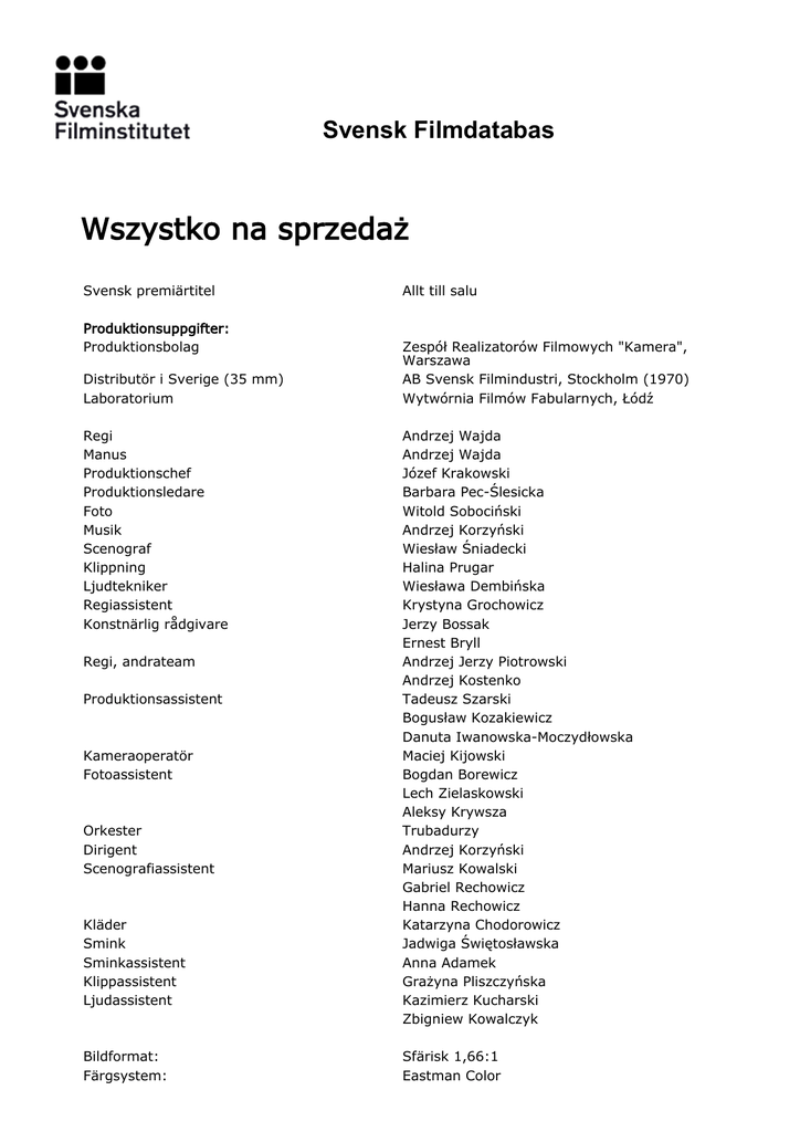 Svensk Filmdatabas Wszystko na sprzedaż Svensk premiärtitel Produktionsuppgifter: Produktionsbolag Distributör i Sverige (35 mm) Laboratorium Regi Manus Produktionschef Produktionsledare Foto Musik Scenograf Klippning Ljudtekniker Regiassistent Konstnärlig rådgivare Regi, andrateam Produktionsassistent Kameraoperatör Fotoassistent Orkester Dirigent Scenografiassistent Kläder Smink Sminkassistent Klippassistent Ljudassistent Bildformat: Färgsystem: Allt till salu Zespół Realizatorów Filmowych "Kamera", Warszawa AB Svensk Filmindustri, Stockholm (1970) Wytwórnia Filmów Fabularnych, Łódź Andrzej Wajda Andrzej Wajda Józef Krakowski Barbara Pec-Ślesicka Witold Sobociński Andrzej Korzyński Wiesław Śniadecki Halina Prugar Wiesława Dembińska Krystyna Grochowicz Jerzy Bossak Ernest Bryll Andrzej Jerzy Piotrowski Andrzej Kostenko Tadeusz Szarski Bogusław Kozakiewicz Danuta Iwanowska-Moczydłowska Maciej Kijowski Bogdan Borewicz Lech Zielaskowski Aleksy Krywsza Trubadurzy Andrzej Korzyński Mariusz Kowalski Gabriel Rechowicz Hanna Rechowicz Katarzyna Chodorowicz Jadwiga Świętosławska Anna Adamek Grażyna Pliszczyńska Kazimierz Kucharski Zbigniew Kowalczyk Sfärisk 1,66:1 Eastman Color Svensk Filmdatabas Ljudsystem: Originallängd i minuter: Optisk mono 105 Censur: Datum: Åldersgräns: Längd: 109327 1970-08-12 Tillåten från 11 år 2705 meter Stockholmspremiär Sverigepremiär Urpremiär 1970-11-30 Puck Stockholm 99 minuter 1970-09-07 Helsingborg 99 minuter 1969-01-28 Warszawa Polen 105 minuter Rollista: Beata Tyszkiewicz Elżbieta Czyżewska Andrzej Łapicki Daniel Olbrychski Witold Holtz Elżbieta Kępińska Małgorzata Potocka Bogumił Kobiela Franciszek Starowieyski Tadeusz Kalinowski Wiesław Dymny Wojciech Solarz Józef Fukś Irena Laskowska Witold Dederko Andrzej Kostenko Wanda Warska Tadeusz Baljon Krzysztof Fus Andrzej Gawroński Walentyna Hoffman Ireneusz Harasimowicz B. Jarosz Jerzy Karaszkiewicz Bogdan Łysakowski Elżbieta Nowacka Ryszard Ostałowski Leonard Pietraszak Adam Pawlikowski Jacek Domański Bohdan Ejmont Mieczysław Kalenik Andrzej Jerzy Piotrowski Jerzy Turowicz Beata Elżbieta Andrzej, regissören Daniel Witek, regiassistenten skådespelerska "Mała", flickan som vill bli filmstjärna Bobek, vännen partygäst skogvaktare Wiesio man på inspelningen filmarbetare skogvaktarens fru taxichaufför Kostek, kameraopertör partygäst produktionsledare stuntman produktionsassistent partygäst filmarbetare Svensk Filmdatabas Svensk filmografi Den polske aktören Zbigniew Cybulski omkom 8 januari 1967 när han hoppade av ett framrusande tåg i Wroclaw. Denna film är regissören Wajdas utnyttjande av en sådan situation - man börjar spela in en film och vet inte att huvudrollen har gått bort. Därefter letar man efter honom, får veta att han förolyckats och kommenterar hans person på olika sätt. Filminspelningen fortsätter med en annan skådespelare.