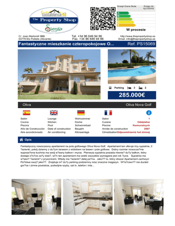 Energii Ocena Skala A B C D E F G C/. Joan Martorell 5BB. 03779 Els Poblets (Alicante) Tel. +34 96 646 94 96 Fax. +34 96 646 94 96 Emisje rok kg CO2/m2 W procesie http://www.thepropertyshop.es Email. [email protected] Fantastyczne mieszkanie czteropokojowe O... Ref. PS15069 Parking 3 2 285.000€ Oliva Salón Cocina Piscina Año de Construcción Aire acondicionado Oliva Nova Golf Lounge Kitchen Pool Date of construction Air conditioning Wohnzimmer Küche Schwimmbad Baujahr Klimaanlage Salon 1 Cuisine Oddzielne Piscine Komunalnych Année de construction 2007 ClimatisationOdpowietrzenie hot zimnej Opis Fantastyczny nowoczesny apartament na pola golfowego Oliva Nova Golf. Apartament ten oferuje trzy sypialnie, 2 ?azienki, pokój dzienny z du?ym tarasem z widokiem na basen i pole golfowe. Dobry rozmiar nowocze?nie wyposa?ona kuchnia ma swój w?asny balkon i mycia. Pierwsza sypialnia posiada równie? du?y balkon, który dostaje s?o?ce ca?y dzie?, wi?c ten apartament ma wielki wszystkie wymagane jest rok ?ycia. Sypialnia ma w?asn? ?azienk? z prysznicem. Wtedy ma ?azienk? dalej pe?na. Jako?? to, który obszar Apartament zachwyci Pa?stwa swoj? jako??. Znajduje si? du?y parking podziemny oraz znaczne magazyn. W?a?ciwo?? ma ducted gor?ce i zimne powietrze, podwójne szyby, sat tv, telefon i inte...