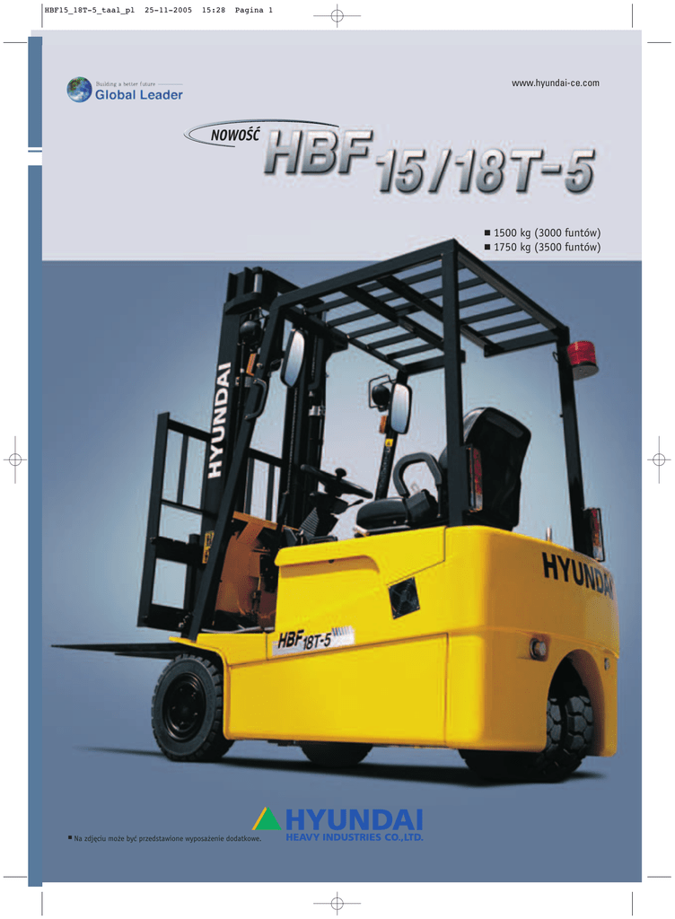 HBF15_18T-5_taal_pl 25-11-2005 15:28 Pagina 1 www.hyundai-ce.com NOWOÂå ■ 1500 kg (3000 funtów) ■ 1750 kg (3500 funtów) ■ Na zdj´ciu mo˝e byç przedstawione wyposa˝enie dodatkowe. HBF15_18T-5_taal_pl 25-11-2005 15:28 Pagina 2 Seria HBF T-5 Wózki jezdniowe podnoÊnikowe wid∏owe z serii HBF T-5, posiadajàce wytrzyma∏à ram´, zapewniajà doskona∏à stabilnoÊç i p∏ynnπ jazd´ — to naprawd´ solidni „pracownicy”. Poczàwszy od za∏adunku i wy∏adunku ci´˝arówek i kontenerów, po prac´ na placach budowy, niezale˝nie od wymagaƒ, zawsze mo˝na liczyç na wózek jezdniowy podnoÊnikowy z serii HBF T-5, który wyniesie firm´ na wy˝yny. Nowoczesny kontroler SEVCON Wydajny, niemal bezzak∏óceniowy kontroler SEVCON, 16 MHz (wysoka cz´stotliwoÊç) zapewnia p∏ynnà prac´ i zabezpieczenie nisko- i wysokonapi´ciowe, ochron´ przed przegrzaniem i rejestracj´ usterek. 2 HBF15_18T-5_taal_pl 25-11-2005 15:28 Pagina 3 Wi´ksza moc i wysoka wydajnoÊç P∏ynnie pracujàce, wydajne i ergonomiczne wózki jezdniowe podnoÊnikowe wid∏owe z serii HBF15/18T-5 zosta∏y wyprodukowane z myÊlà o potrzebach Twojej firmy. Nowy model HBF15/18T-5 WyÊwietlacz LCD z autodiagnostykà ekonomicznoÊç / ∏atwoÊç napraw + bezpieczeƒstwo / ochrona Êrodowiska = WyÊwietlacz LCD wyposa˝ony jest w podÊwietlenie, dzi´ki czemu jest czytelny w ka˝dych warunkach. Na wyÊwietlaczu prezentowane sà b∏´dy podczas pracy, usterki systemu, poziom na∏adowania akumulatora, licznik godzin oraz funkcje wybrane przez operatora. Funkcja niskiego poziomu akumulatora wbudowana w uk∏ad zabezpiecza przed nadmiernym wy∏adowaniem. Wiodàca marka Êwiatowa Elementy bezpieczeƒstwa wózka jezdniowego podnoÊnikowego wid∏owego Podczas opuszczania wide∏ wózka jezdniowego podnoÊnikowego zawór sterujàcy opuszczaniem (zawór opadania) reguluje pr´dkoÊç ruchu. Zawór bezpieczeƒstwa zapobiega nag∏emu opuszczeniu wide∏ do jakiego mo˝e dojÊç w wyniku uszkodzenia przewodu hydraulicznego. Obie funkcje wp∏ywajπ na bezpieczeƒstwo pracy. 5o 7o Uk∏ad zapobiegajàcy staczaniu Wi´kszy kàt przechy∏u masztu FPDS (w pe∏ni proporcjonalny uk∏ad nap´dowy) Niezale˝ne za∏àczanie sterowników nap´du poprawia stabilnoÊç podczas kierowania. Proporcjonalne sterowanie dzia∏aniem lewego i prawego nap´du zapewnia p∏ynne dzia∏anie uk∏adu kierowniczego. Wykorzystujàc mo˝liwoÊç przechy∏u masztu pod kàtem 5 stopni do przodu i 7 stopni do ty∏u, operator mo˝e szybko i bezpiecznie wykonaç prace za∏adunkowe i roz∏adunkowe. NajnowoczeÊniejszy uk∏ad hydrauliczny Najnowszy uk∏ad hydrauliczny o du˝ej wydajnoÊci szybko reaguje w czasie pracy, a cichy zawór regulacyjny zwi´ksza zarówno wydajnoÊç, jak i trwa∏oÊç. Uk∏ad zapobiegajàcy staczaniu firmy SEVCON zapewnia bezpieczeƒstwo pracy na pochy∏ym terenie oraz wyjàtkowe mo˝liwoÊci ruszania na zboczach. ZdolnoÊç pokonywania wzniesieƒ (MAKS.) HBF15T-5 (48V) 19,6% HBF18T-5 (48V) 17,8% Wi´ksze pr´dkoÊci jazdy i lepsza zdolnoÊç pokonywania wzniesieƒ Dzi´ki wysokowydajnemu silnikowi o du˝ej mocy uzyskano wi´ksze przyspieszenie, lepszà zdolnoÊç pokonywania wzniesieƒ oraz wi´kszà pr´dkoÊç jazdy na nierównym lub pochy∏ym terenie. Pr´dkoÊç jazdy (MAKS.) HBF15T-5 (48V) 16 km/h (9,9 mili/h) HBF18T-5 (48V) 15,8 km/h (9,8 mili/h) � Maszt � Uk∏ad kierowniczy � Si∏ownik podnoszenia � Ko∏o kierownicy � Regulator przep∏ywu � Hydrauliczne � Zawór bezpieczeƒstwa opuszczania wspomaganie kierowania � Zawór priorytetowy � Rozdzielacz 쐅 Pompa hydrauliczna hydrauliczny 쐈 Zbiornik oleju 3 HBF15_18T-5_taal_pl 25-11-2005 15:28 Pagina 4 Perfekcyjne dopasowanie Zaprojektowana zgodnie z zasadami ergonomii kabina operatora umo˝liwia kierowcy wybór najwygodniejszej pozycji pracy, dzi´ki czemu wzrasta jego produktywnoÊç. Dobra widocznoÊç zapewniajàca bezpiecznà obs∏ug´ Szersze pole widzenia zwi´ksza bezpieczeƒstwo i dok∏adnoÊç pracy operatora. 4 HBF15_18T-5_taal_pl 25-11-2005 15:28 Pagina 5 Wygodna obs∏uga Konstrukcja opracowana w oparciu o zasady ergonomii zmniejsza zm´czenie i zwi´ksza wydajnoÊç operatora. Mocna os∏ona górna Hamulec postojowy Za∏àczenie zapadkowego hamulca postojowego wymaga u˝ycia mniejszej si∏y. Górna os∏ona zabezpieczajàca spe∏nia wymogi norm EWG i ANSI i chroni operatora podczas wykonywania niebezpiecznych prac. Optymalne po∏o˝enie peda∏ów Siedzenie pneumatyczne z prostà w obs∏udze, pe∏nà regulacjà Regulowana kierownica Peda∏y przyspieszenia, hamulca i pe∏zania zosta∏y optymalnie rozmieszczone z uwzgl´dnieniem zasad ergonomii. Atrakcyjne wizualnie i regulowane siedzenie, zaprojektowane zgodnie z zasadami ergonomii, zapewnia wi´kszy komfort, bezpieczeƒstwo i trwa∏oÊç. Kierownic´ mo˝na regulowaç za pomocà dêwigni po prawej stronie, ustawiajàc jà w po∏o˝eniu najbardziej wygodnym do pracy. Prze∏àcznik wielofunkcyjny ¸atwe operowanie drπ}kiem zmiany kierunku Zintegrowana dêwignia z prze∏àcznikiem wielofunkcyjnym pozwala kierowcy w wygodny sposób obs∏ugiwaç Êwiat∏a i klakson. Natychmiastowa reakcja na ruchy dêwigni Precyzyjne, bezpieczne i wydajne sterowanie mo˝liwe jest przy minimalnym wysi∏ku operatora. Mo˝liwoÊç przemieszczania dêwigni do przodu i do ty∏u jednym palcem daje operatorowi pe∏nà kontrol´ nad sprz´tem. ¸atwe wchodzenie i wychodzenie Nisko wbudowane stopnie po obu stronach wózka oraz pokryty kauczukiem uchwyt sprawiajà, ˝e zajmowanie miejsca przez opweratora jest bardzo proste. 5 HBF15_18T-5_taal_pl 25-11-2005 15:28 Pagina 6 Wysoka trwa∏oÊç i ∏atwoÊç konserwacji Idealny uk∏ad podzespo∏ów zapewnia ∏atwy dost´p i wygod´ podczas wykonywania czynnoÊci konserwacyjnych. Podwy˝szona stabilnoÊç w wyniku zastosowania podwójnych tylnych kó∏ Oznacza to zwi´kszenie stabilnoÊci wózka podczas operacji podnoszenia