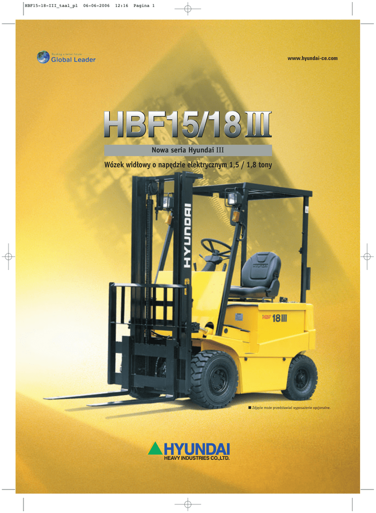 HBF15-18-III_taal_pl 06-06-2006 12:16 Pagina 1 www.hyundai-ce.com Nowa seria Hyundai III Wózek wid∏owy o nap´dzie elektrycznym 1,5 / 1,8 tony ■ Zdj´cie mo˝e przedstawiaç wyposa˝enie opcjonalne. HBF15-18-III_taal_pl 06-06-2006 12:17 Pagina 2 Nowatorska technologia zapewnia du˝à moc! Elektryczny wózek wid∏owy Hyundai ■ Zdj´cie mo˝e przedstawiaç wyposa˝enie opcjonalne. Elektryczny wózek wid∏owy 2 nowej serii Hyundai III HBF15-18-III_taal_pl 06-06-2006 12:17 Pagina 3 Cichy wózek wid∏owy przyjazny dla Êrodowiska, nie wydzielajàcy spalin. HBF15/18 III, produkowany przez ludzi o du˝ym doÊwiadczeniu w bran˝y w dziesiàtkach tysi´cy sztuk przy u˝yciu zaawansowanych technik produkcyjnych. Elektryczne wózki wid∏owe Hyundai sà produkowane zgodnie z wymagajàcym systemem gwarancji jakoÊci Hyundai, co pozwala zapewniç wi´kszà wydajnoÊç energetycznà i lepszà moc nap´dowà. Oszcz´dna konstrukcja zapewnia wózek nie wydzielajàcy spalin, cichy i przyjazny dla Êrodowiska. Elektryczny wózek wid∏owy 3 nowej serii Hyundai III HBF15-18-III_taal_pl 06-06-2006 12:17 Pagina 4 Nowatorska technologia! Elektryczny wózek wid∏owy 4 nowej serii Hyundai III HBF15-18-III_taal_pl 06-06-2006 12:17 Pagina 5 Elektryczny wózek wid∏owy HBF15/18 III Przyjazny dla Êrodowiska Wygodna obs∏uga Konstrukcja oparta o ergonomi´ zmniejsza zm´czenie i zwi´ksza wydajnoÊç pracy operatora. Wszechstronna regulacja siedzenia Siedzenie mo˝e byç przesuwane do przodu i do ty∏u, co zwi´ksza wygod´ operatora. Siedzenie wyposa˝ono w pochylane oparcie. Dêwignia kontroli kierunku jazdy Czu∏a dêwignia sterowania pozwala na zmian´ kierunku jazdy bez ˝adnego wysi∏ku. Nachylana regulowana kolumna kierownicy Hamulec postojowy zbli˝ony do samochodowego Po∏o˝enie kierownicy mo˝na regulowaç w celu zapewnienia operatorowi najwygodniejszej pozycji i ograniczenia jego zm´czenia. Hamulec postojowy, zbli˝ony do samochodowego, jest wygodny w u˝ytkowaniu, a jego w∏àczenie wymaga minimalnego wysi∏ku. Lepsza widocznoÊç zapewniajàca bezpiecznà obs∏ug´ Wytrzyma∏a os∏ona kabiny Bezpieczeƒstwo i precyzja pracy operatora sà zwi´kszone dzi´ki masztowi zapewniajàcemu szersze pole widzenia. Jasne Êwiat∏a przednie Otwarty stopieƒ Âwiat∏o robocze spe∏niajàce wymogi norm przemys∏owych zapewnia wystarczajàce oÊwietlenie otoczenia zwi´kszajàce bezpieczeƒstwo pracy. Otwarty, szeroki stopieƒ wejÊciowy z powierzchnià antypoÊlizgowà pozwala na bezpieczne wsiadanie i zsiadanie. Elektryczny wózek wid∏owy 5 nowej serii Hyundai III Os∏ona bezpieczeƒstwa kabiny spe∏nia wymogi EWG i ANSI i chroni operatora podczas niebezpiecznych zadaƒ. HBF15-18-III_taal_pl 06-06-2006 12:17 Pagina 6 Nowatorska technologia! Zaawansowany i wydajny system sterowania zapewnia wysokie osiàgi i niskie koszty konserwacji Wyjàtkowy, niezwykle programowalny, samodiagnozujàcy kontroler pozwala na regulacj´ wózka optymalizujàcà warunki pracy operatora. Zaawansowany technologicznie kontroler SEVCON Wydajny, prawie bezg∏oÊny, kontroler SEVCON pracujàcy w wysokiej cz´stotliwoÊci 16 kHz zapewnia p∏ynnà prac´ oraz automatycznà ochron´ przed zbyt niskim i zbyt wysokim napi´ciem oraz przegrzaniem. W kontroler wbudowano równie˝ uk∏ad zapisu usterek. Ekran LCD zapewniajàcy automatycznà diagnoz´ Ekran LCD wyposa˝ono w system podÊwietlania zapewniajàcy optymalnà widocznoÊç jego wskazaƒ we wszelkich warunkach. Ekran przedstawia informacje o b∏´dach podczas pracy, usterkach systemów, poziomie na∏adowania akumulatora, liczniku godzin oraz innych funkcjach wybranych przez u˝ytkownika. Funkcja informowania o niskim poziomie na∏adowania akumulatora pozwala na zwi´kszenie jego trwa∏oÊci. Regulacja funkcji zgodnie z wymogami pracy Wspania∏e hamowanie Samoregulujàce hamulce typu samochodowego pozwalajà na bezpieczne i kontrolowane zatrzymywanie. Cicha i trwa∏a pompa hydrauliczna Wysokowydajna i ∏atwo dost´pna pompa hydrauliczna jest zamontowana przy por´czy po lewej stronie pozwalajàc na prostà i szybkà obs∏ug´ technicznà i konserwacj´. - Przyspieszenie i powolne poruszanie - Najwy˝sza pr´dkoÊç - Czas pod∏àczenia do zasilania i regulacja odleg∏oÊci - Wybór procedury obs∏ugi (wybrane dla bezpieczeƒstwa obs∏ugi) - Inne funkcje dostawcy us∏ug lub u˝ytkownika koƒcowego Du˝y i ∏atwo dost´pny przedzia∏ akumulatora Uk∏ad sztucznej inteligencji kontrolera SEVCON zapewnia ochron´ przed nadmiernym roz∏adowaniem akumulatora. Elektryczny wózek wid∏owy 6 nowej serii Hyundai III Uk∏ad zapobiegajàcy staczaniu System zapobiegajàcy stoczeniu SEVCON zapewnia bezpieczeƒstwo pracy na rampie oraz wyjàtkowo dobre w∏asnoÊci ruszania z rampy. HBF15-18-III_taal_pl 06-06-2006 12:17 Pagina 7 Elektryczny wózek wid∏owy HBF15/18 III Przyjazny dla Êrodowiska Dane techniczne masztu Opuszczone mm(in) V250 TRIPLEX FFL pe∏ny wolny skok Swobodne podnoszenie Wysuni´te Ze standardowym oparciem ∏adunku Kàt pochylania Bez oparcia ∏adunku Ze stand. oparciem ∏adunku Bez oparcia ∏adunku mm(in) mm(in) mm(in) mm(in) mm(in) 2500(98.4) 1745(68.7) 3055(120.3) 3552(139.8) 150 (5.9) 150 (5.9) 6 V270 2700(106.3) 1845(72.6) 3255(128.1) 3752(147.7) 150 (5.9) 150 (5.9) V300 3000(118.1) 1995(78.5) 3555(140.0) 4052(159.5) 150 (5.9) 150 (5.9) V330 3300(129.9) 2145(84.4) 3855(151.8) 4352(171.3) 150 (5.9) V350 3500(137.8) 2245(88.4) 4055(159.6) 4552(179.2) 150 (5.9) V370 3700(145.7) 2345(92.3) 4255(167.5) 4752(187.1) V400 4000(157.4) 2495(98.2) 4555(179.3) 5052(198.9) V450 4500(177.2) 2845(112.0) 5055(199.0) V500 5000(196.9) 3095(121.8) V550 5500(216.5) 3345(131.7) TF370 3700(145.7) TF400 4000(157.4) TF430 TF450 Typ masztu DUPLEX PFL cz´Êciowo wolny skok WysokoÊç ca∏kowita Maksymalna wysokoÊç wide∏ Przód Ty∏ st. Udêwig ze Êrodkiem ∏adunku w odleg∏oÊci 500 mm (24 cale) HBF15 HBF18 kg(lb) kg(lb) 10 1500 (3000) 1750