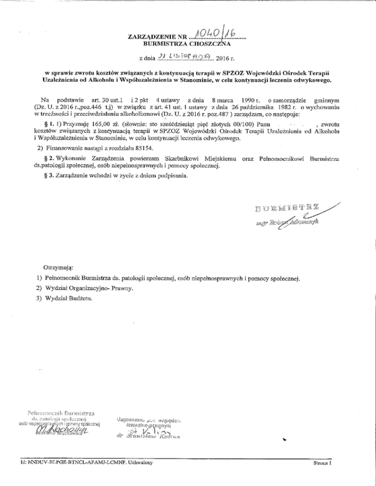 ZARZĄDZENIE NR. BURMISTRZA CHOSZCZNA zdma2Ł.l;.ź3M.^B...2016r. w sprawie zwrotu kosztów związanych z kontynuacją terapii w SPZOZ Wojewódzki Ośrodek Terapii Uzależnienia od Alkoholu i Współuzależnienia w Stanominie, w celu kontynuacji leczenia odwykowego. Na podstawie art.30ustl i2pkt 4 ustawy z dnia 8 marca 1990 r. o samorządzie gmmnym (Dz. U. z 2016 r.,poz.446 t.J) w związku z art. 41 ust. l ustawy z dnia 26 października 1982 r. o wychowaniu w trzeźwości i przeciwdziałaniu alkoholizmowi (Dz, U. z 2016 r. poz.487 ) zarządzam, co następuje: § l. l) Przyznaję 165,00 zł. (słownie: sto sześćdziesiąt pięć złotych 00/100) Panu .• . , zwrotu kosztów związanych z kontynuacją terapii w SPZOZ Wojewódzki Ośrodek Terapii Uzależnienia od Alkoholu i Współuzależnienia w Stanomłnie, w celu kontynuacji leczenia odwykowego. 2) Finansowanie nastąpi z rozdziału 85154. §2. Wykonanie Zarządzenia powierzam Skarbnikowi Miejskiemu oraz Pełnomocnilcowi Burmistrza ds.patologli społecznej, osób niepełnosprawnych i pomocy społecznej. § 3. Zarządzenie wchodzi w życie z dniem podpisania. B 'O' :BM? S[5I B Z m^W^M^^^ Otrzymują: l) Pełnomocnik Burmistrza ds. patologii społecznej, osób mepehiosprawnych i pomocy społecznej. 2) Wydział Organizacyjno- Prawny. 3) Wydział Budżetu. PC] n om ncn i k Burmistrza 'Is.p^oj^ii^po-tocznej ^ U^yeańjo^o ,ji.G w^giedg osób niepe^pra^T^ch i ^omoc;/ sp.Oiecznej " ?Tr^Ine'-,p[§^^' ^Vd'r/y«5Tt7ac7rów7c2^ „;-„, .ss^!_,y^ ' ^ -^ •ST SstSWssiGU} Si-S.^-łi-i Id: NNDUY-BLPGE-BTOCL-AFAMJ-LCMNF. Uchwalony Strona l