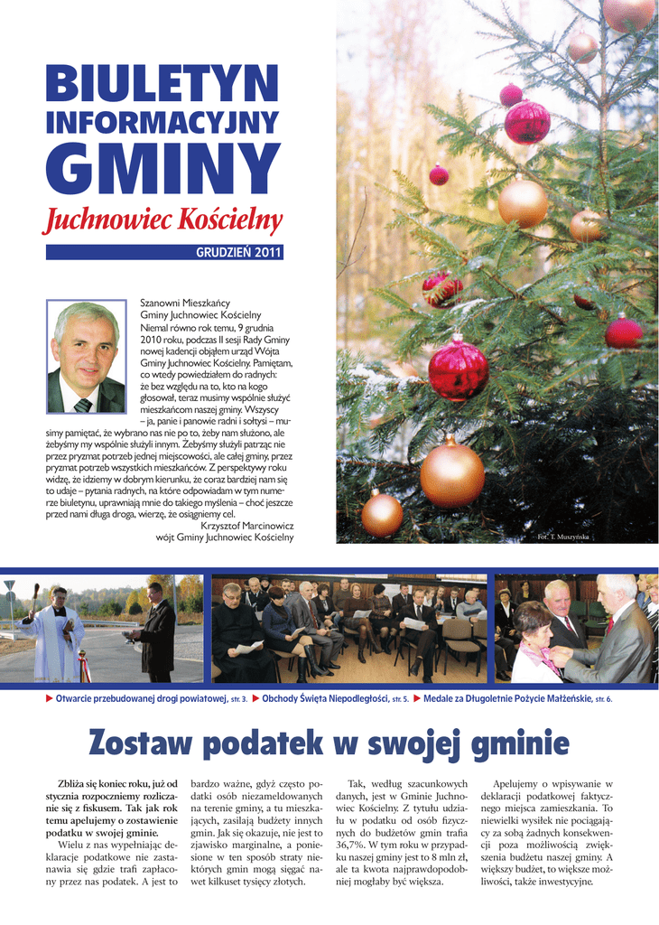 BIULETYN INFORMACYJNY GMINY Juchnowiec Kościelny GRUDZIEŃ 2011 Szanowni Mieszkańcy Gminy Juchnowiec Kościelny Niemal równo rok temu, 9 grudnia 2010 roku, podczas II sesji Rady Gminy nowej kadencji objąłem urząd Wójta Gminy Juchnowiec Kościelny. Pamiętam, co wtedy powiedziałem do radnych: że bez względu na to, kto na kogo głosował, teraz musimy wspólnie służyć mieszkańcom naszej gminy. Wszyscy – ja, panie i panowie radni i sołtysi – musimy pamiętać, że wybrano nas nie po to, żeby nam służono, ale żebyśmy my wspólnie służyli innym. Żebyśmy służyli patrząc nie przez pryzmat potrzeb jednej miejscowości, ale całej gminy, przez pryzmat potrzeb wszystkich mieszkańców. Z perspektywy roku widzę, że idziemy w dobrym kierunku, że coraz bardziej nam się to udaje – pytania radnych, na które odpowiadam w tym numerze biuletynu, uprawniają mnie do takiego myślenia – choć jeszcze przed nami długa droga, wierzę, że osiągniemy cel. Krzysztof Marcinowicz wójt Gminy Juchnowiec Kościelny Fot. T. Muszyńska u Otwarcie przebudowanej drogi powiatowej, str. 3. u Obchody Święta Niepodległości, str. 5. u Medale za Długoletnie Pożycie Małżeńskie, str. 6. Zostaw podatek w swojej gminie Zbliża się koniec roku, już od stycznia rozpoczniemy rozliczanie się z fiskusem. Tak jak rok temu apelujemy o zostawienie podatku w swojej gminie. Wielu z nas wypełniając deklaracje podatkowe nie zastanawia się gdzie trafi zapłacony przez nas podatek. A jest to bardzo ważne, gdyż często podatki osób niezameldowanych na terenie gminy, a tu mieszkających, zasilają budżety innych gmin. Jak się okazuje, nie jest to zjawisko marginalne, a poniesione w ten sposób straty niektórych gmin mogą sięgać nawet kilkuset tysięcy złotych. Tak, według szacunkowych danych, jest w Gminie Juchnowiec Kościelny. Z tytułu udziału w podatku od osób fizycznych do budżetów gmin trafia 36,7%. W tym roku w przypadku naszej gminy jest to 8 mln zł, ale ta kwota najprawdopodobniej mogłaby być większa. Apelujemy o wpisywanie w deklaracji podatkowej faktycznego miejsca zamieszkania. To niewielki wysiłek nie pociągający za sobą żadnych konsekwencji poza możliwością zwiększenia budżetu naszej gminy. A większy budżet, to większe możliwości, także inwestycyjne. 2 Nowe stawki i zmiany w XI sesja Rady Gminy 27 października 2011 r. w Ośrodku Kultury w Gminie Juchnowiec Kościelny odbyła się XI Sesja Rady Gminy Juchnowiec Kościelny. W informacji z działalności międzysesyjnej wójt poinformował m.in. o zmianie regulaminu organizacyjnego urzędu gminy. Z referatów mienia komunalnego, dróg i transportu, inwestycji i zamówień publicznych utworzony został Referat Inwestycji i Gospodarki Komunalnej. Jego kierownikiem jest zastępca wójta Mirosława Jaroszuk. Z referatu planowania przestrzennego oraz ochrony środowiska i rolnictwa utworzony został Referat Planowania Przestrzennego, Ochrony Środowiska i Rolnictwa. Kierownikiem tego referatu jest Dariusz Markuszewski. Kolejnym punktem obrad była analiza możliwości przystąpienia Gminy Juchnowiec Kościelny do „Programu budowy przydomowych oczyszczalni ścieków”. Temat przedstawił Rafał Łada. Program wszedł w życie 1 lipca br., a nabór prowadzony jest do wyczerpania wniosków. Następnie informacje o stanie oświaty i o wynikach sprawdzianów szóstoklasistów oraz egzaminów gimnazjalnych przedstawiła sekretarz Teresa Rudzik i dyrektorzy szkół z terenu gminy. Podczas sesji radni głosowali m.in. nad uchwałami określającymi wysokości podatków. Od 1 stycznia 2012 roku obowiązywać będą nowe stawki podatków. Podatek od gruntów związanych z prowadzeniem działalności gospodarczej bez względu na sposób sklasyfikowania w ewidencji gruntów i budynków wzrośnie z 0,63 zł do 0,67 zł od 1 m² powierzchni; od budynków mieszkalnych lub ich części z 0,53 zł do 0,56 zł od 1 m² powierzchni użytkowej; od budynków związanych z prowadzeniem działalności gospodarczej oraz od budynków mieszkalnych lub ich części zajętych na prowadzenie działalności gospodarczej wzrośnie z 17,00 zł do 17,95 zł od 1 m² powierzchni użytkowej; Przewidywany wzrost wpływów do budżetu gminy z tytułu podatku od nieruchomości w 2012 roku wynosi 244 466 zł. 3 podatków Urzędzie Juchnowiec Kościelny W sprawach bieżących radni poruszyli, m.in. następujące kwestie: radny Maciej Zajkowski zwrócił się do władz Gminy o zastanowienie się nad wykorzystaniem środków unijnych na przygotowanie infrastruktury i zrobienie dokumentacji pod tereny inwestycyjne. Radny Tadeusz Walicki prosił o uporządkowanie przystanku autobusowego przy nowo wybudowanej drodze w Kol. Koplany. Sołtys wsi Złotniki Wiktor Antoniuk również zwrócił się o dokończenie inwestycji wiat przystankowych. Radny Jan Świerzbiński zapytał o możliwości uporządkowania numerów budynków zwłaszcza w miejscowościach, gdzie intensywnie rozwija się budownictwo jednorodzinne. Sekretarz wyjaśniła, że wyjściem jest nadanie nazw ulic, jednak wiąże się to z kosztami. Na XI sesji RG Juchnowiec Kościelny, podjęto uchwały w sprawie: u zmiany trybu i sposobu powoływania i odwoływania członków zespołu interdyscyplinarnego oraz szczegółowych warunków jego funkcjonowania; u przyjęcia „Strategii Integracji i Rozwiązywania Problemów Społecznych Gminy Juchnowiec Kościelny na lata 2011-2023”; u rozpatrzenia skargi; u zmiany uchwały Nr IV/23/11 Rady Gminy Juchnowiec Kościelny z dnia 25 lutego 2011r. w sprawie uchwalenia Gminnego Programu Profilaktyki i Rozwiązywania Problemów Alkoholowych oraz Przeciwdziałania Narkomanii na 2011 rok; u zmiany uchwały Nr VII/38/07 Rady Gminy Juchnowiec Kościelny z dnia 26 kwietnia 2007r. w sprawie zmiany nazwy Gminnego Ośrodka Kultury i Sportu w Juchnowcu Kościelnym na Ośrodek Kultury w Gminie Juchnowiec Kościelny oraz nadania Statutu Ośrodkowi Kultu