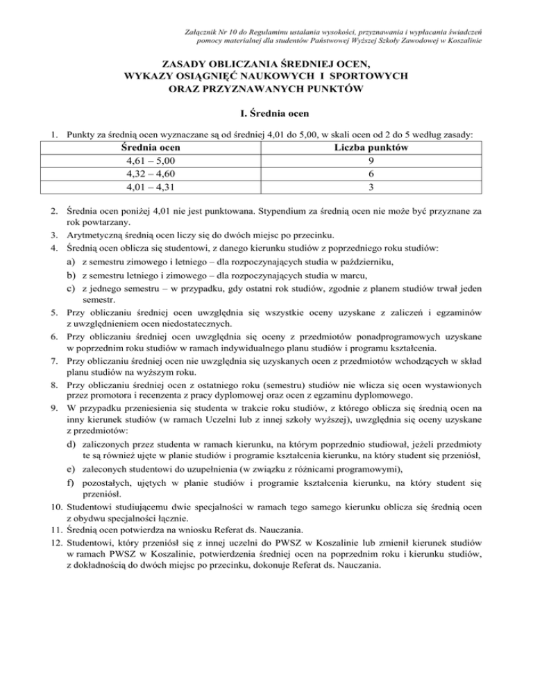 Załącznik Nr 10 do Regulaminu ustalania wysokości, przyznawania i wypłacania świadczeń pomocy materialnej dla studentów Państwowej Wyższej Szkoły Zawodowej w Koszalinie ZASADY OBLICZANIA ŚREDNIEJ OCEN, WYKAZY OSIĄGNIĘĆ NAUKOWYCH I SPORTOWYCH ORAZ PRZYZNAWANYCH PUNKTÓW I. Średnia ocen 1. Punkty za średnią ocen wyznaczane są od średniej 4,01 do 5,00, w skali ocen od 2 do 5 według zasady: Średnia ocen 4,61 – 5,00 4,32 – 4,60 4,01 – 4,31 Liczba punktów 9 6 3 2. Średnia ocen poniżej 4,01 nie jest punktowana. Stypendium za średnią ocen nie może być przyznane za rok powtarzany. 3. Arytmetyczną średnią ocen liczy się do dwóch miejsc po przecinku. 4. Średnią ocen oblicza się studentowi, z danego kierunku studiów z poprzedniego roku studiów: a) z semestru zimowego i letniego – dla rozpoczynających studia w październiku, b) z semestru letniego i zimowego – dla rozpoczynających studia w marcu, c) z jednego semestru – w przypadku, gdy ostatni rok studiów, zgodnie z planem studiów trwał jeden 5. 6. 7. 8. 9. semestr. Przy obliczaniu średniej ocen uwzględnia się wszystkie oceny uzyskane z zaliczeń i egzaminów z uwzględnieniem ocen niedostatecznych. Przy obliczaniu średniej ocen uwzględnia się oceny z przedmiotów ponadprogramowych uzyskane w poprzednim roku studiów w ramach indywidualnego planu studiów i programu kształcenia. Przy obliczaniu średniej ocen nie uwzględnia się uzyskanych ocen z przedmiotów wchodzących w skład planu studiów na wyższym roku. Przy obliczaniu średniej ocen z ostatniego roku (semestru) studiów nie wlicza się ocen wystawionych przez promotora i recenzenta z pracy dyplomowej oraz ocen z egzaminu dyplomowego. W przypadku przeniesienia się studenta w trakcie roku studiów, z którego oblicza się średnią ocen na inny kierunek studiów (w ramach Uczelni lub z innej szkoły wyższej), uwzględnia się oceny uzyskane z przedmiotów: d) zaliczonych przez studenta w ramach kierunku, na którym poprzednio studiował, jeżeli przedmioty te są również ujęte w planie studiów i programie kształcenia kierunku, na który student się przeniósł, e) zaleconych studentowi do uzupełnienia (w związku z różnicami programowymi), f) pozostałych, ujętych w planie studiów i programie kształcenia kierunku, na który student się przeniósł. 10. Studentowi studiującemu dwie specjalności w ramach tego samego kierunku oblicza się średnią ocen z obydwu specjalności łącznie. 11. Średnią ocen potwierdza na wniosku Referat ds. Nauczania. 12. Studentowi, który przeniósł się z innej uczelni do PWSZ w Koszalinie lub zmienił kierunek studiów w ramach PWSZ w Koszalinie, potwierdzenia średniej ocen na poprzednim roku i kierunku studiów, z dokładnością do dwóch miejsc po przecinku, dokonuje Referat ds. Nauczania. Załącznik Nr 10 do Regulaminu ustalania wysokości, przyznawania i wypłacania świadczeń pomocy materialnej dla studentów Państwowej Wyższej Szkoły Zawodowej w Koszalinie II. Wykaz szczegółowych osiągnięć naukowych 1. Osiągnięcia punktowane są według poniższej skali: Osiągnięcia naukowe Liczba punktów Publikacje naukowe recenzowanych czasopismach naukowych o zasięgu, co najmniej krajowym lub publikacje naukowe w formie książki 10 Wystąpienia w konferencjach naukowych Nagrody i wyróżnienia w konkursach o zasięgu międzynarodowym 8 3 III. Wykaz szczegółowych osiągnięć sportowych 1. Osiągnięcia punktowane są według poniższej skali: Osiągnięcia sportowe Udział w igrzyskach olimpijskich Udział w igrzyskach świata 1 – 5 miejsce w mistrzostwach Europy 1 – 5 miejsce w mistrzostwach Polski Liczba punktów 10 10 8 6 1 – 3 miejsce w akademickich mistrzostwach Polski 4 1 – 3 miejsce w mistrzostwach Polski AZS 3 2. Osiągnięcia ww. zawodach dla osób niepełnosprawnych są punktowane według powyższej zasady.