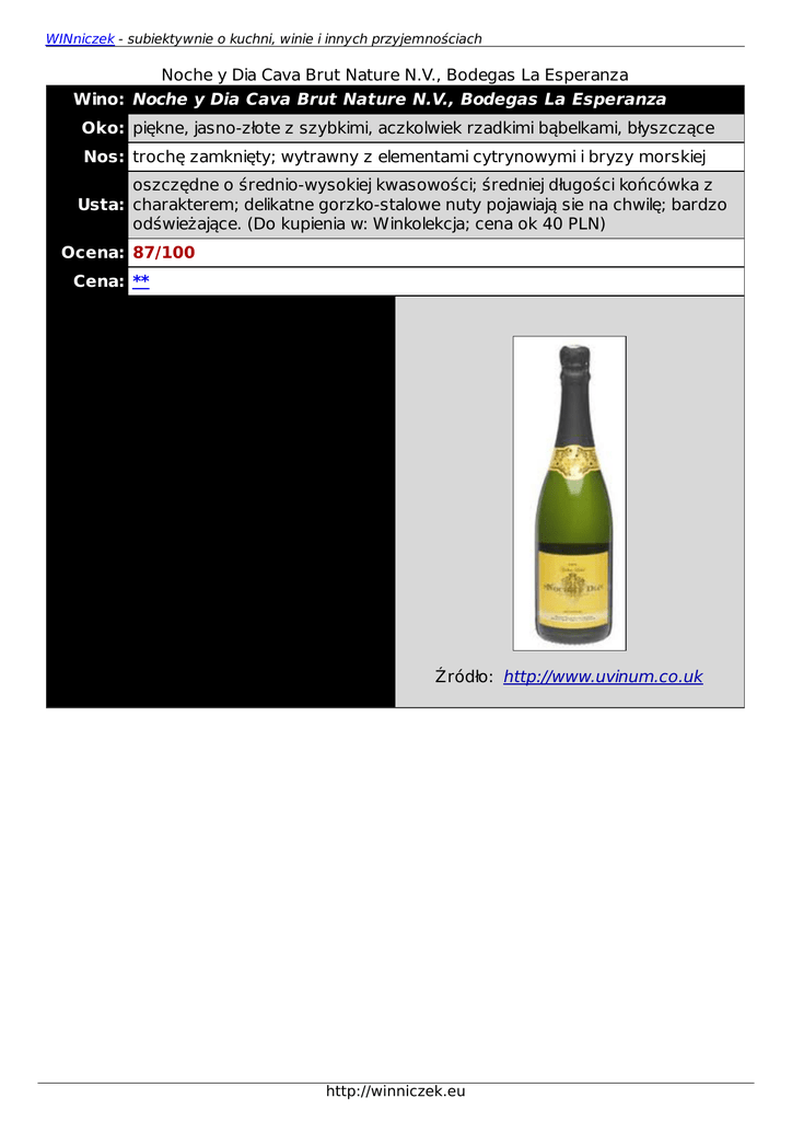 WINniczek - subiektywnie o kuchni, winie i innych przyjemnościach Noche y Dia Cava Brut Nature N.V., Bodegas La Esperanza Wino: Noche y Dia Cava Brut Nature N.V., Bodegas La Esperanza Oko: piękne, jasno-złote z szybkimi, aczkolwiek rzadkimi bąbelkami, błyszczące Nos: trochę zamknięty; wytrawny z elementami cytrynowymi i bryzy morskiej oszczędne o średnio-wysokiej kwasowości; średniej długości końcówka z Usta: charakterem; delikatne gorzko-stalowe nuty pojawiają sie na chwilę; bardzo odświeżające. (Do kupienia w: Winkolekcja; cena ok 40 PLN) Ocena: 87/100 Cena: ** Etykieta zdjęcie Źródło: http://www.uvinum.co.uk http://winniczek.eu