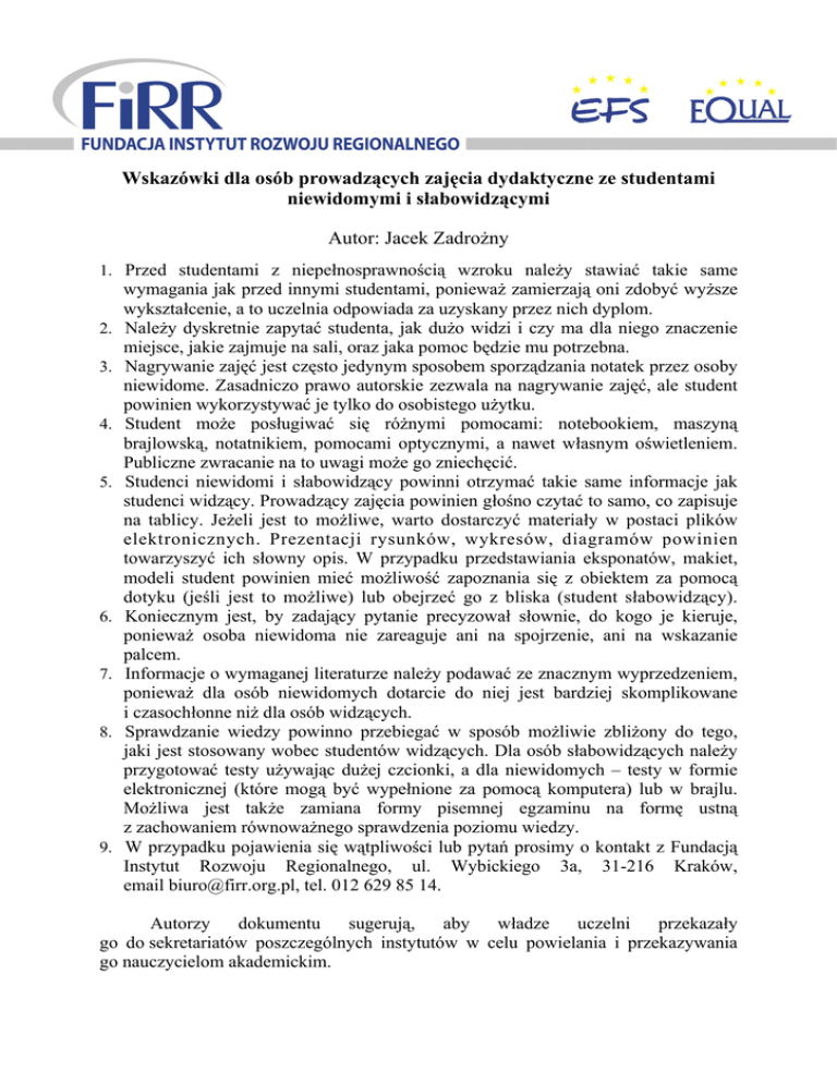 Wskazówki dla osób prowadzących zajęcia dydaktyczne ze studentami niewidomymi i słabowidzącymi Autor: Jacek Zadrożny 1. Przed studentami z niepełnosprawnością wzroku należy stawiać takie same 2. 3. 4. 5. 6. 7. 8. 9. wymagania jak przed innymi studentami, ponieważ zamierzają oni zdobyć wyższe wykształcenie, a to uczelnia odpowiada za uzyskany przez nich dyplom. Należy dyskretnie zapytać studenta, jak dużo widzi i czy ma dla niego znaczenie miejsce, jakie zajmuje na sali, oraz jaka pomoc będzie mu potrzebna. Nagrywanie zajęć jest często jedynym sposobem sporządzania notatek przez osoby niewidome. Zasadniczo prawo autorskie zezwala na nagrywanie zajęć, ale student powinien wykorzystywać je tylko do osobistego użytku. Student może posługiwać się różnymi pomocami: notebookiem, maszyną brajlowską, notatnikiem, pomocami optycznymi, a nawet własnym oświetleniem. Publiczne zwracanie na to uwagi może go zniechęcić. Studenci niewidomi i słabowidzący powinni otrzymać takie same informacje jak studenci widzący. Prowadzący zajęcia powinien głośno czytać to samo, co zapisuje na tablicy. Jeżeli jest to możliwe, warto dostarczyć materiały w postaci plików elektronicznych. Prezentacji rysunków, wykresów, diagramów powinien towarzyszyć ich słowny opis. W przypadku przedstawiania eksponatów, makiet, modeli student powinien mieć możliwość zapoznania się z obiektem za pomocą dotyku (jeśli jest to możliwe) lub obejrzeć go z bliska (student słabowidzący). Koniecznym jest, by zadający pytanie precyzował słownie, do kogo je kieruje, ponieważ osoba niewidoma nie zareaguje ani na spojrzenie, ani na wskazanie palcem. Informacje o wymaganej literaturze należy podawać ze znacznym wyprzedzeniem, ponieważ dla osób niewidomych dotarcie do niej jest bardziej skomplikowane i czasochłonne niż dla osób widzących. Sprawdzanie wiedzy powinno przebiegać w sposób możliwie zbliżony do tego, jaki jest stosowany wobec studentów widzących. Dla osób słabowidzących należy przygotować testy używając dużej czcionki, a dla niewidomych – testy w formie elektronicznej (które mogą być wypełnione za pomocą komputera) lub w brajlu. Możliwa jest także zamiana formy pisemnej egzaminu na formę ustną z zachowaniem równoważnego sprawdzenia poziomu wiedzy. W przypadku pojawienia się wątpliwości lub pytań prosimy o kontakt z Fundacją Instytut Rozwoju Regionalnego, ul. Wybickiego 3a, 31-216 Kraków, email [email protected], tel. 012 629 85 14. Autorzy dokumentu sugerują, aby władze uczelni przekazały go do sekretariatów poszczególnych instytutów w celu powielania i przekazywania go nauczycielom akademickim.