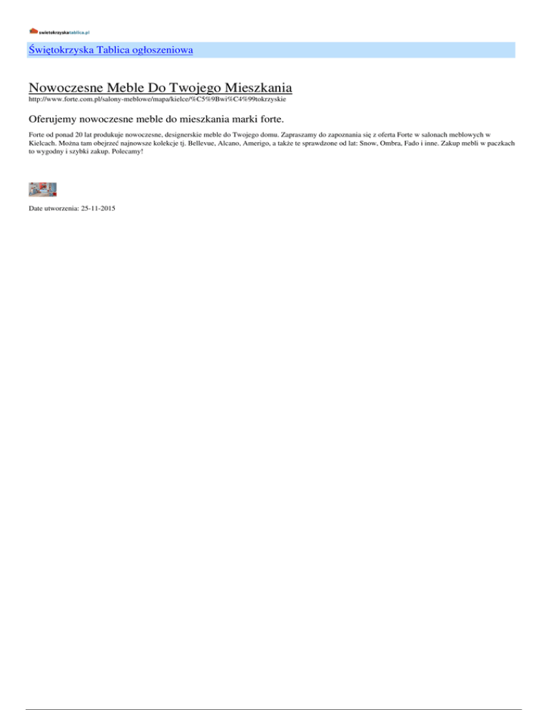 Świętokrzyska Tablica ogłoszeniowa Nowoczesne Meble Do Twojego Mieszkania http://www.forte.com.pl/salony-meblowe/mapa/kielce/%C5%9Bwi%C4%99tokrzyskie Oferujemy nowoczesne meble do mieszkania marki forte. Forte od ponad 20 lat produkuje nowoczesne, designerskie meble do Twojego domu. Zapraszamy do zapoznania się z oferta Forte w salonach meblowych w Kielcach. Można tam obejrzeć najnowsze kolekcje tj. Bellevue, Alcano, Amerigo, a także te sprawdzone od lat: Snow, Ombra, Fado i inne. Zakup mebli w paczkach to wygodny i szybki zakup. Polecamy! Date utworzenia: 25-11-2015
