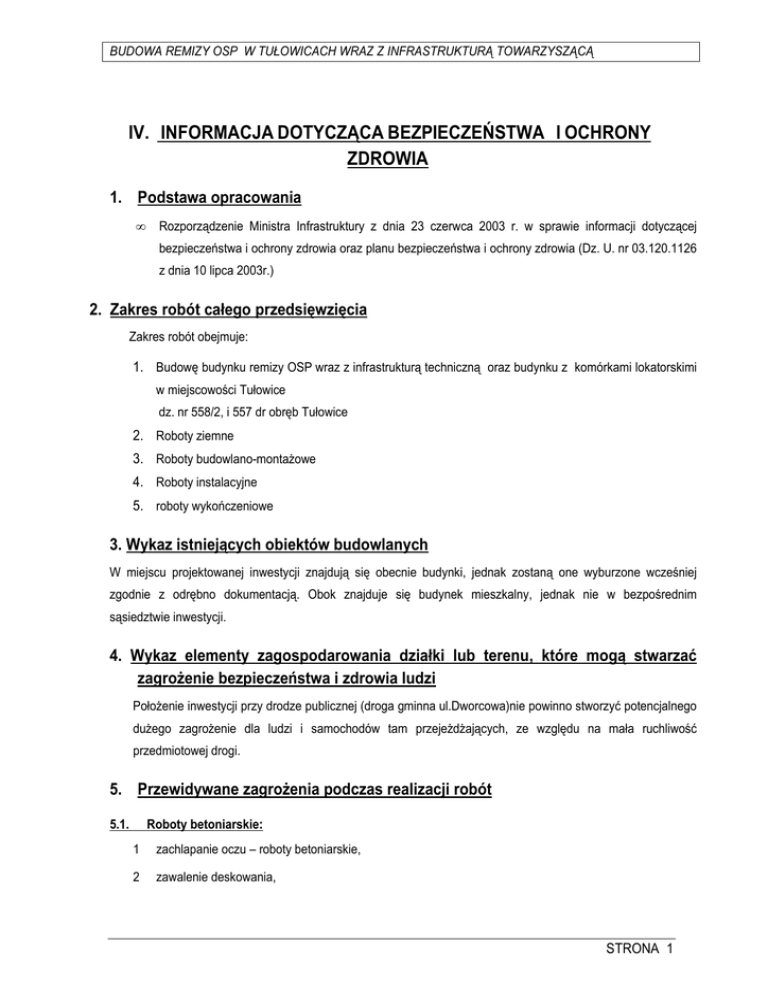 BUDOWA REMIZY OSP W TUŁOWICACH WRAZ Z INFRASTRUKTURĄ TOWARZYSZĄCĄ IV. INFORMACJA DOTYCZĄCA BEZPIECZEŃSTWA I OCHRONY ZDROWIA 1. Podstawa opracowania • Rozporządzenie Ministra Infrastruktury z dnia 23 czerwca 2003 r. w sprawie informacji dotyczącej bezpieczeństwa i ochrony zdrowia oraz planu bezpieczeństwa i ochrony zdrowia (Dz. U. nr 03.120.1126 z dnia 10 lipca 2003r.) 2. Zakres robót całego przedsięwzięcia Zakres robót obejmuje: 1. Budowę budynku remizy OSP wraz z infrastrukturą techniczną oraz budynku z komórkami lokatorskimi w miejscowości Tułowice dz. nr 558/2, i 557 dr obręb Tułowice 2. Roboty ziemne 3. Roboty budowlano-montażowe 4. Roboty instalacyjne 5. roboty wykończeniowe 3. Wykaz istniejących obiektów budowlanych W miejscu projektowanej inwestycji znajdują się obecnie budynki, jednak zostaną one wyburzone wcześniej zgodnie z odrębno dokumentacją. Obok znajduje się budynek mieszkalny, jednak nie w bezpośrednim sąsiedztwie inwestycji. 4. Wykaz elementy zagospodarowania działki lub terenu, które mogą stwarzać zagrożenie bezpieczeństwa i zdrowia ludzi Położenie inwestycji przy drodze publicznej (droga gminna ul.Dworcowa)nie powinno stworzyć potencjalnego dużego zagrożenie dla ludzi i samochodów tam przejeżdżających, ze względu na mała ruchliwość przedmiotowej drogi. 5. Przewidywane zagrożenia podczas realizacji robót 5.1. Roboty betoniarskie: 1 zachlapanie oczu – roboty betoniarskie, 2 zawalenie deskowania, STRONA 1 BUDOWA REMIZY OSP W TUŁOWICACH WRAZ Z INFRASTRUKTURĄ TOWARZYSZĄCĄ 3 uderzenie przez przemieszczane przedmioty – montaż deskowania i zbrojenia, rozdeskowanie zabetonowanych elementów wykonanie ścianek szczelnych z brusów stalowych, 4 wymuszona pozycja ciała – trudno dostępne miejsca w trakcie wykonywania i rozbierania deskowań, 5 uderzenie o nieruchome przedmioty – rusztowanie, deskowanie, wystające pręty zbrojeniowe, 6 kontakt z przedmiotami szorstkimi – miejsce składowania tarcicy 5.2. Roboty budowlano-montażowe: 1 potknięcie się o przewody spawalnicze, pręty zbrojeniowe, 2 najechanie, potrącenie przez środki transportu – drogi główne i transportowe na placu budowy , 3 spadające przedmioty, 4 kontakt z przedmiotami gorącymi – miejsce wykonywania robót spawalniczych, 5.4. Roboty wykończeniowe Zagrożenia występujące przy wykonywaniu robót wykończeniowych: 1 upadek pracownika z wysokości (brak balustrad ochronnych przy podestach roboczych rusztowania; brak stosowania sprzętu chroniącego przed upadkiem z wysokości przy wykonywaniu robót związanych z montażem lub demontażem rusztowania), 2 uderzenie spadającym przedmiotem osoby postronnej korzystającej z ciągu pieszego usytuowanego przy budowanym lub remontowanym obiekcie budowlanym (brak wygrodzenia strefy niebezpiecznej). 5.5. Roboty z użyciem maszyn i urządzeń technicznych Zagrożenia występujące przy wykonywaniu robót budowlanych przy użyciu maszyn i urządzeń technicznych: 1 pochwycenie kończyny górnej lub kończyny dolnej przez napęd (brak pełnej osłony napędu), 2 porażenie prądem elektrycznym (brak zabezpieczenia przewodów zasilających urządzenia mechaniczne przed uszkodzeniami mechanicznymi). 5.6. Inne zagrożenia: 1 kontakt z przedmiotami ostrymi – teren budowy oraz składowiska materiałów 2 kontakt z przedmiotami będącymi w ruchu – miejsce obsługi pilarek oraz elektronarzędzi, 3 obrażenie wskutek zimna – otwarta przestrzeń placu budowy, 4 obrażenie wskutek gorąca, niebezpieczeństwo udaru słonecznego – otwarta przestrzeń placu budowy 5 porażenie prądem elektrycznym – plac budowy w miejscach wykonywania robót spawalniczych, obsługi pilarek i elektronarzędzi, 6 zaprószenie oczu – obsługa pilarki, szlifowanie, STRONA 2 BUDOWA REMIZY OSP W TUŁOWICACH WRAZ Z INFRASTRUKTURĄ TOWARZYSZĄCĄ 7 rozerwanie się tarczy – przy obsłudze szlifierki, 8 promieniowanie podczerwone i nadfioletowe, naświetlenie oczu – miejsce wykonywania prac spawalniczych. 6. Sposób prowadzenia instruktażu pracowników przed przystąpieniem do realizacji robót szczególnie niebezpiecznych Szkolenia w dziedzinie bezpieczeństwa i higieny pracy w macierzystych przedsiębiorstwach oraz szkolenie stanowiskowe prowadzone przez kierownika budowy ze szczególnym zwróceniem uwagi na roboty przy drodze. 7. Środki techniczne i organizacyjne, zapobiegających niebezpieczeństwom wynikającym z wykonywanych robót budowlanych Drabiny, rusztowania, i pomosty robocze powinny posiadać odpowiednie dopuszczenia techniczne i atesty. Szalowanie wykopów wykonywać zgodnie z ogólnymi zasadami bezpieczeństwa. Od strony drogi wykonać szczelne(drewniane) ogrodzenie nie przekraczając linii istniejącej, stalowej barierki ochronnej. 8. Plan Bezpieczeństwa i Ochrony Zdrowia oraz zakres robót sporządzi kierownik budowy Opracował: STRONA 3