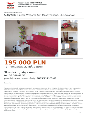 Pepper House - 3863/4111/OMS przez Pepper House - www.pepperhouse.pl www.pepperhouse.pl/hot-oferty mieszkania na Sprzedaż Gdynia, Osiedle Wzgórze Św. Maksymiliana, ul. Legionów 195 000 PLN 2 - POKOJOWE, 32 m2, 1 piętro Skontaktuj się z nami tel. 58 500 01 56 powołaj się na numer oferty: 3863/4111/OMS Opis oferty: Przytulne mieszkanie 2 - pokojowe w doskonale umiejscowionej dzielnicy Gdyni , Wzgórze Św. Maksymiliana . Stąd wszędzie jest blisko. Do centrum miasta 5 min pieszo , do bulwaru nadmorskiego 10 min , do komunikacji miejskiej 5 min. Wokół pełna infrastruktura handlowo - usługowa , przychodnia , szkoła , centrum handlowe Riviera. Budynek oraz klatka schodowa w bardzo dobrym stanie , zarządzana przez wspólnotę mieszkaniową. Mieszkanie jest jasne i ciepłe. Kuchnia ( 5,5 m2 ) w pełni wyposażona , w salonie kominek elektryczny i pojemna szafa. Łazienka z wc i kabiną prysznicową. Ogrzewanie i woda - elektryczne z możliwością powrotu do gazowego. Atutem nieruchomości są niskie opłaty stałe ok 200 zł + woda i prąd. Dla mieszkańców wydzielony zastał parking na podwórzu. Duża piwnica ok 9 m2 i możliwość korzystania ze strychu. Większość wyposażenia jest wliczona w cenę. Mieszkanie idealne dla osób chcących mieszkać blisko centrum oraz jako inwestycja na wynajem. . Zapraszam do kontaktu : Bartosz Baraniak , nr oferty : 3863/4111/OMS Tylko u nas GWARANCJA najniższej ceny dzięki: - okazyjnej cenie nieruchomości - usługom finansowym Pepper House - preferencyjnej stawce u Notariusza Tylko u nas GWARANCJA bezpieczeństwa dzięki: - obsłudze prawnej Kancelarii Koprowski Gąsior Gierzyńska Ludwichowska - nadzorowi licencjonowanego Pośrednika (nr licencji 6884) - polisie OC Pośrednika na kwotę 1 000 000 PLN w PZU SA - ubezpieczeniu kupowanej nieruchomości (szczegóły na naszej stronie). Więcej zdjęć, zdjęcia w dużym formacie, rzuty, filmy i dodatkowe informacje: www.pepperhouse.pl Wejdź już dziś i wyślij zapytanie bezpośrednio do opiekuna oferty. 1/2 Pepper House - 3863/4111/OMS przez Pepper House - www.pepperhouse.pl www.pepperhouse.pl/hot-oferty 2/2 Powered by TCPDF (www.tcpdf.org)